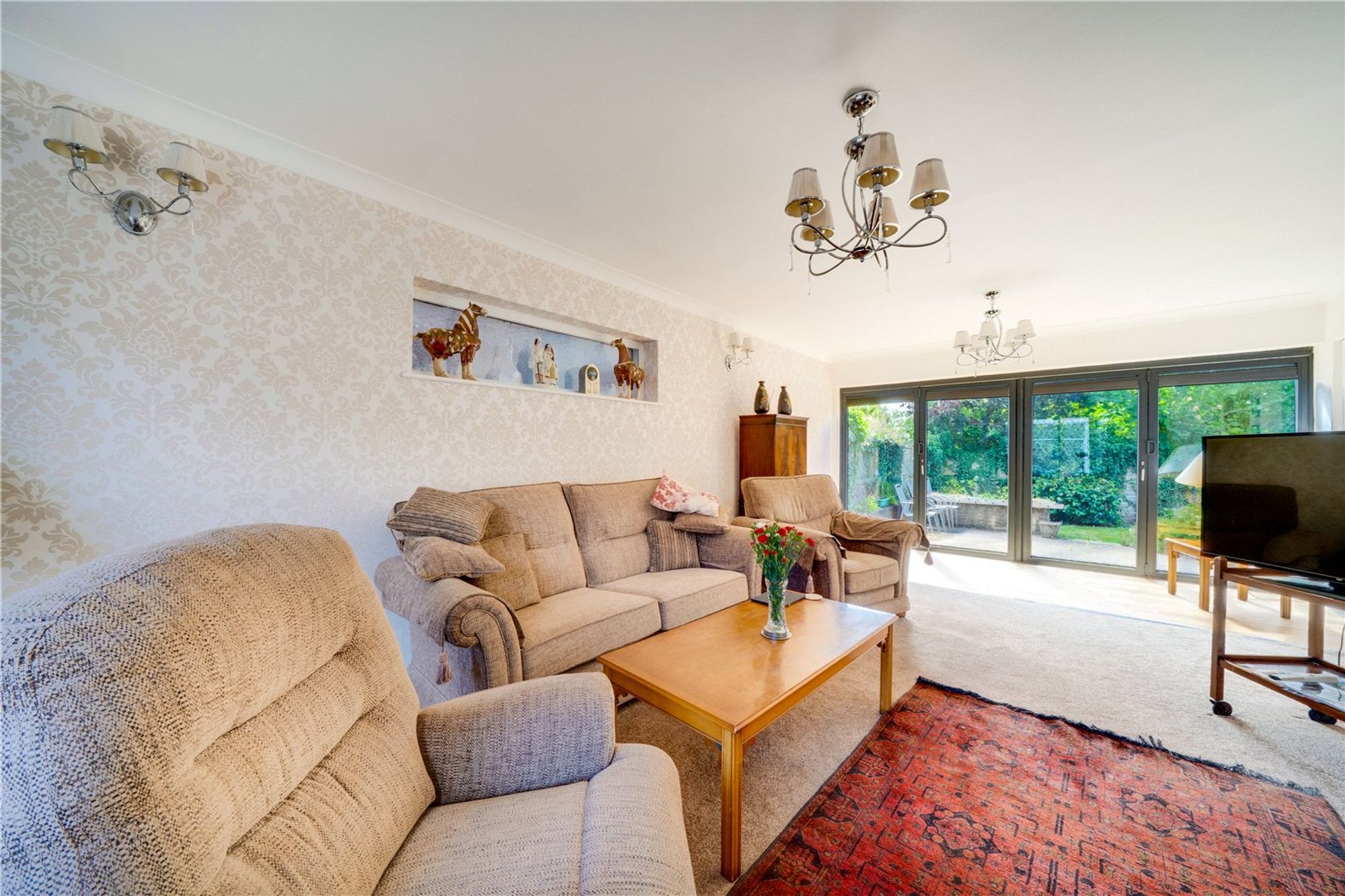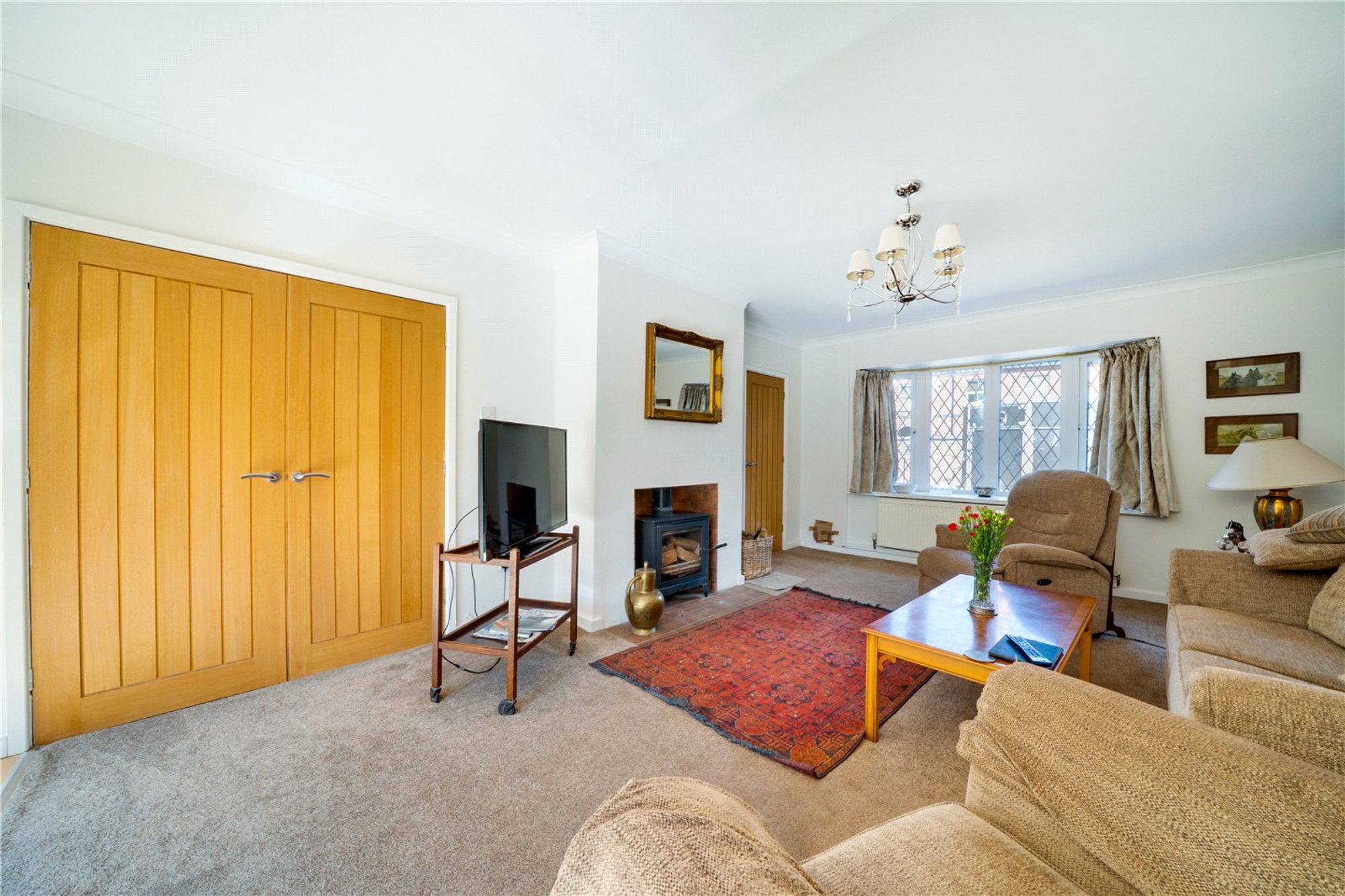 A standout feature is the superb 23ft living room, beautifully finished with wood flooring, a feature fireplace with Jetmaster multi-fuel stove, and bifold doors opening onto the private rear garden. Oak double doors lead into a formal dining room, ideal for entertaining.