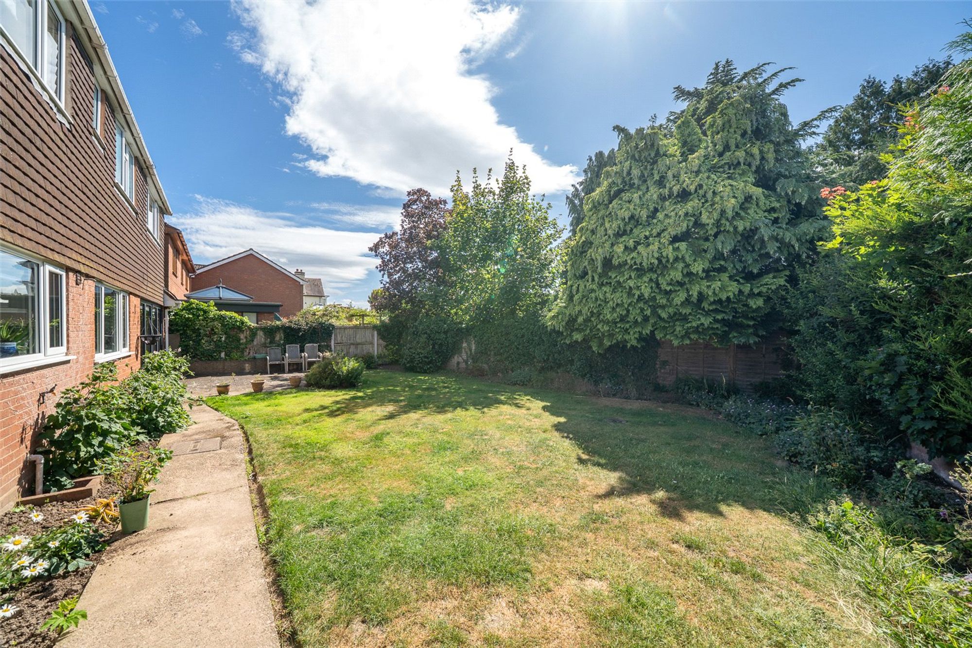 The south-west facing rear garden is a peaceful, mature retreat with a paved patio, shaped lawn, well-stocked borders, and tree-lined fencing for privacy. A large workshop with power and light sits to the side, offering excellent scope for hobbies or garden storage.