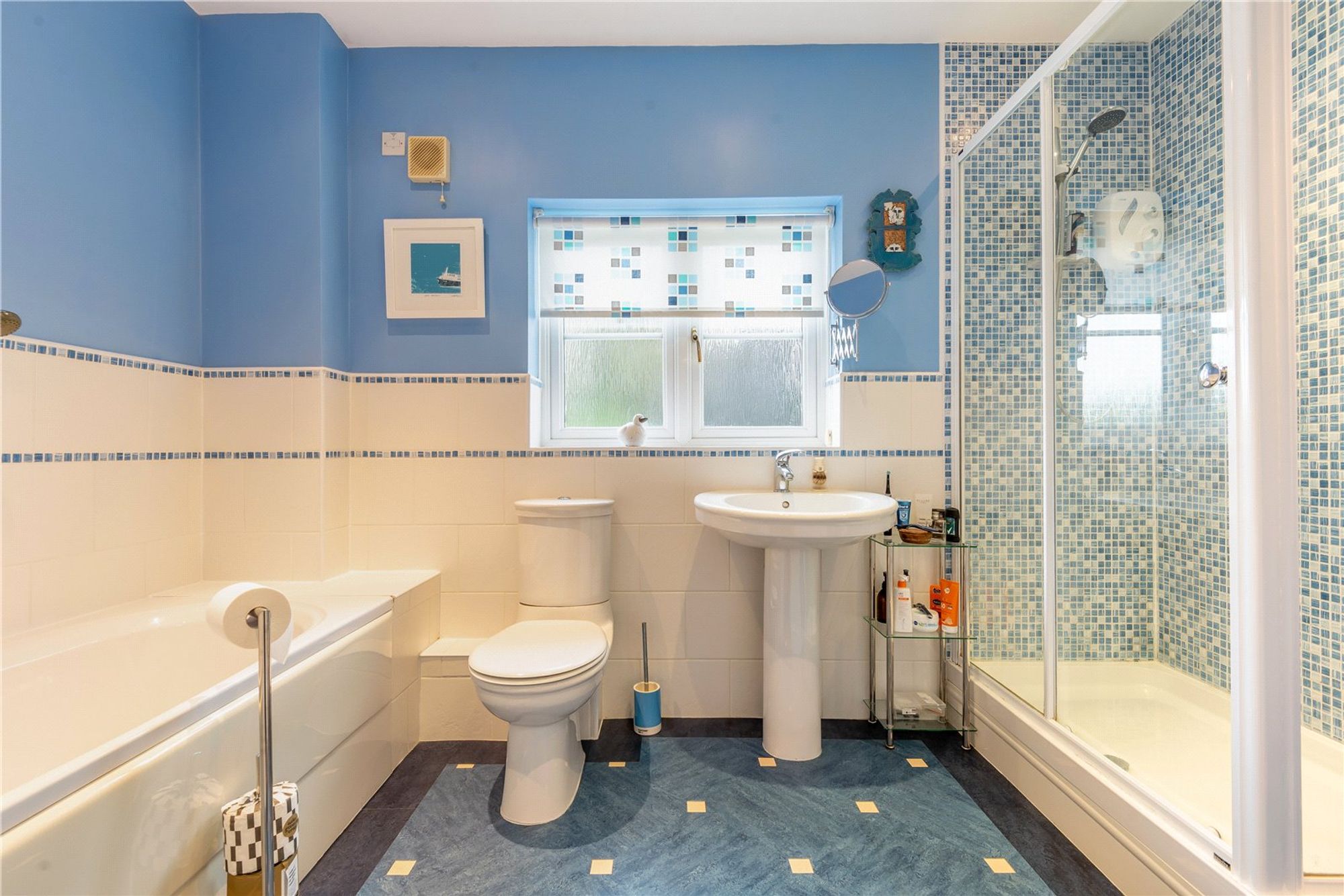 Upstairs, the first floor landing—with access to a part boarded loft—leads to four well proportioned bedrooms. The master bedroom features a walk in wardrobe and en suite shower room with heated towel radiator. The family bathroom includes a bow ended bath with mixer taps, pedestal basin, WC, large shower cubicle, and heated towel radiator. An airing cupboard with shelving completes the first floor accommodation.