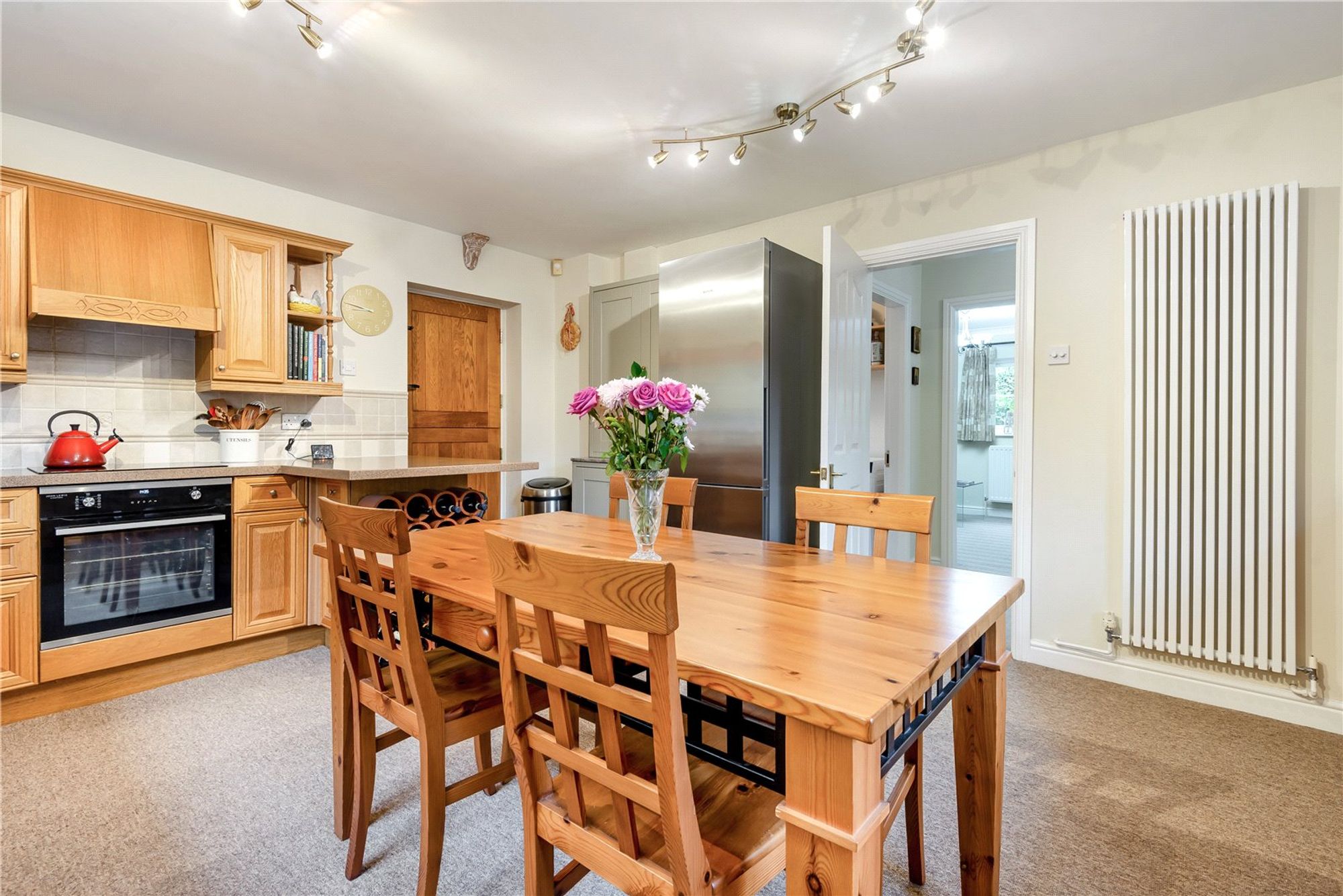 For those working from home, the study provides a quiet and flexible space, equally suited as a playroom or snug. The large breakfast kitchen enjoys views over the front and side gardens and is fitted with a range of units, granite work surfaces, display shelving, and integrated appliances including a Neff dishwasher, electric oven, and induction hob. A stable door opens directly to the garden.