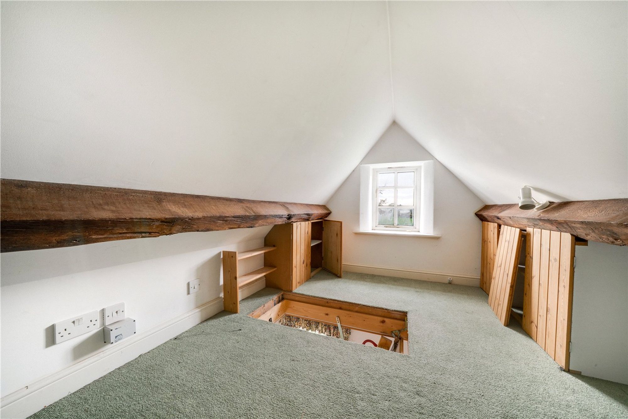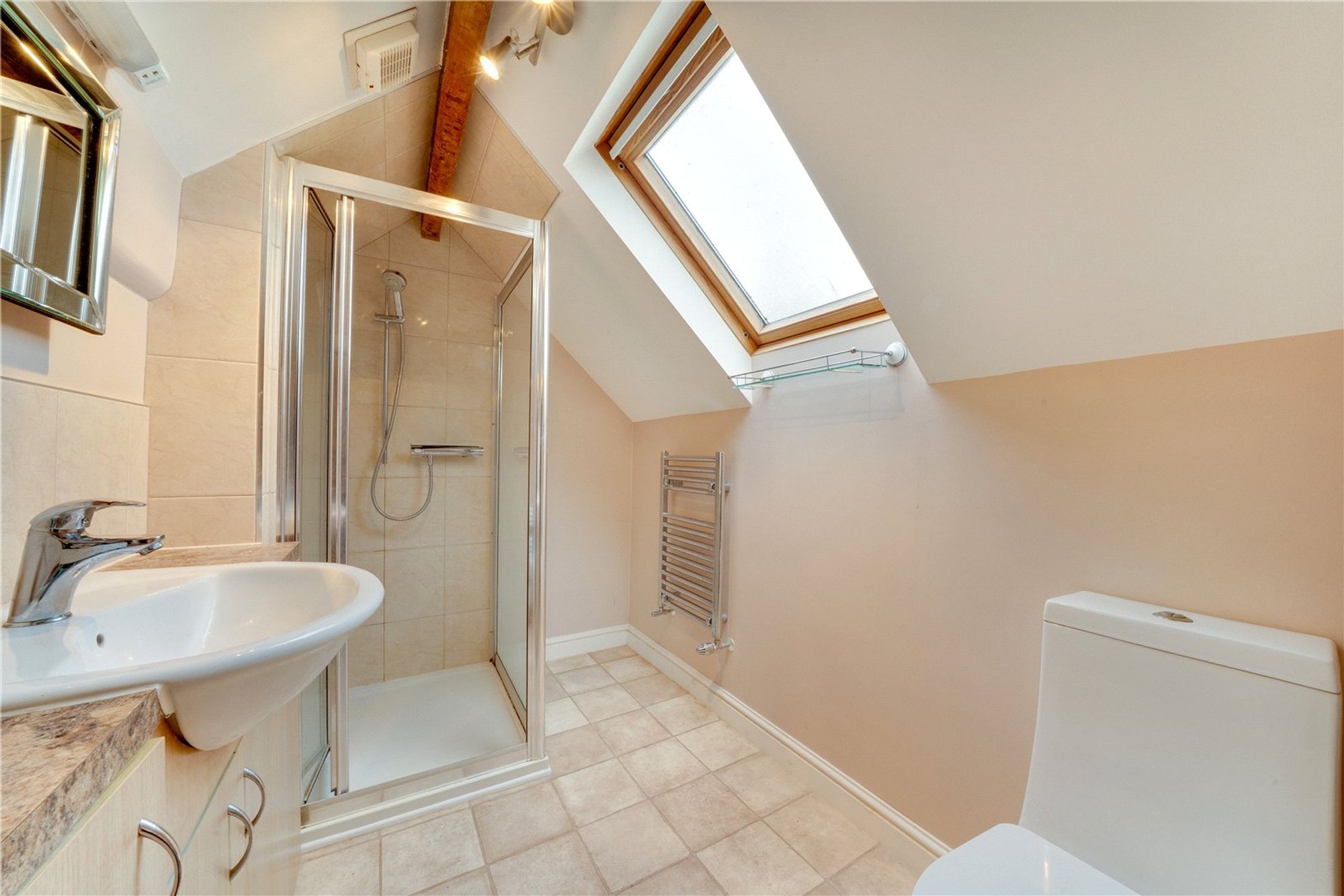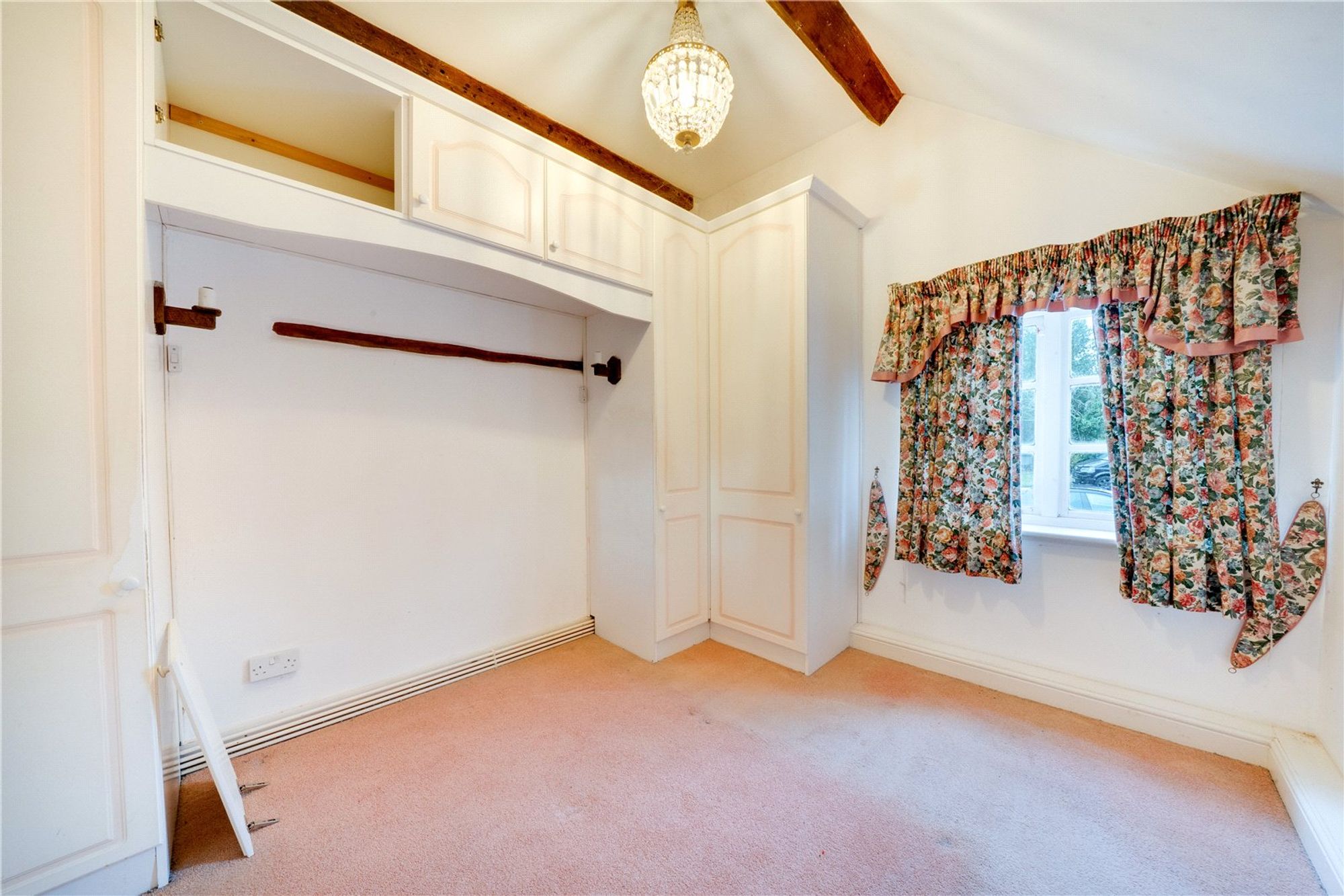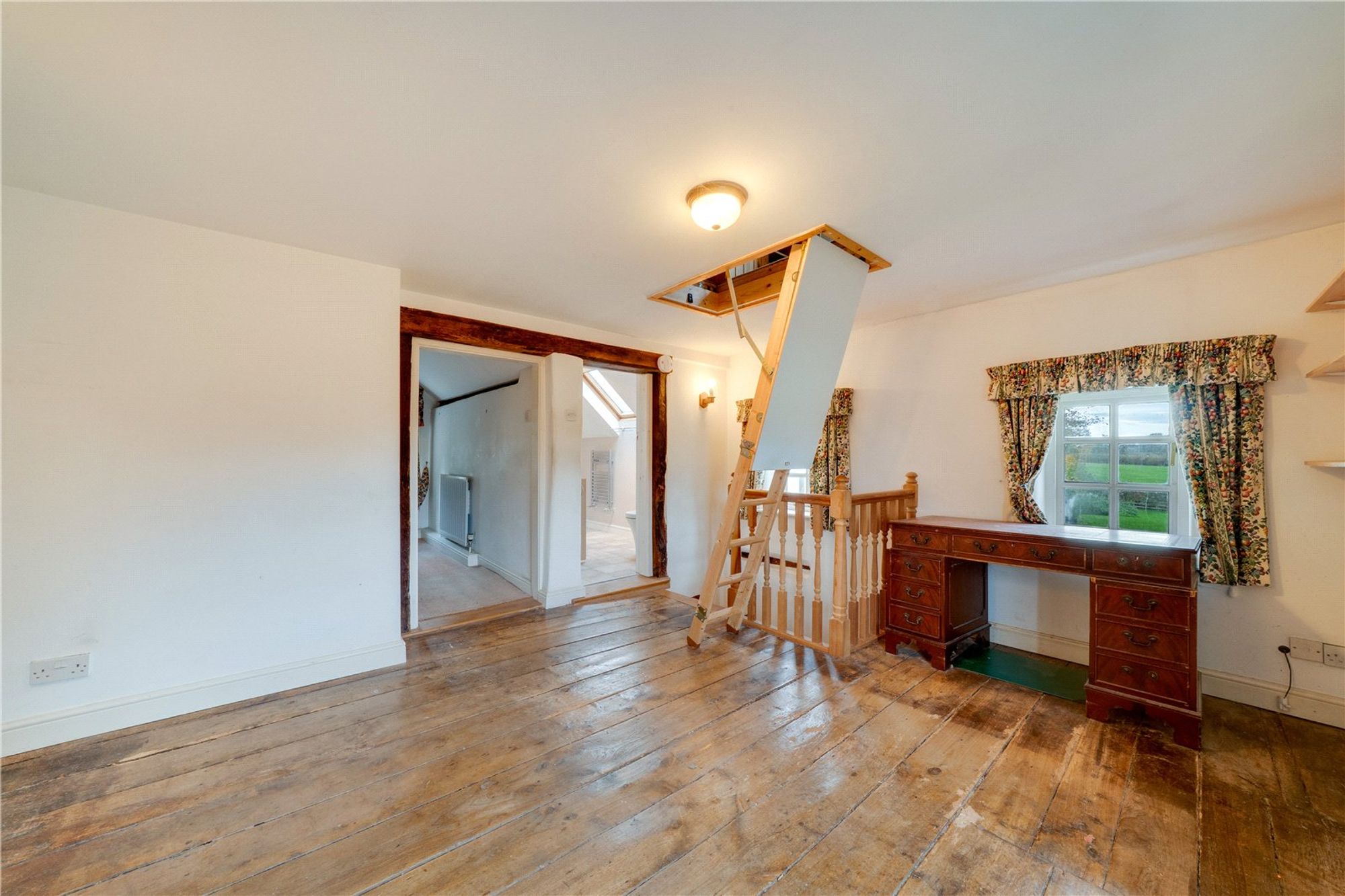 Stairs rise from the living room to the first floor, which opens into a generous landing/bedroom area providing access to the loft hatch and fitted ladders leading to a useful loft room, where the boiler is housed. A further bedroom benefits from fitted wardrobes, while the bathroom is appointed with a shower cubicle, wash hand basin set within a vanity unit, and low-level WC. The layout provides flexibility and could be reconfigured to suit individual needs.