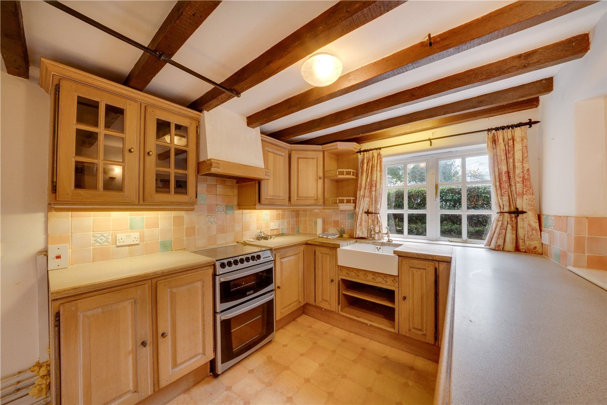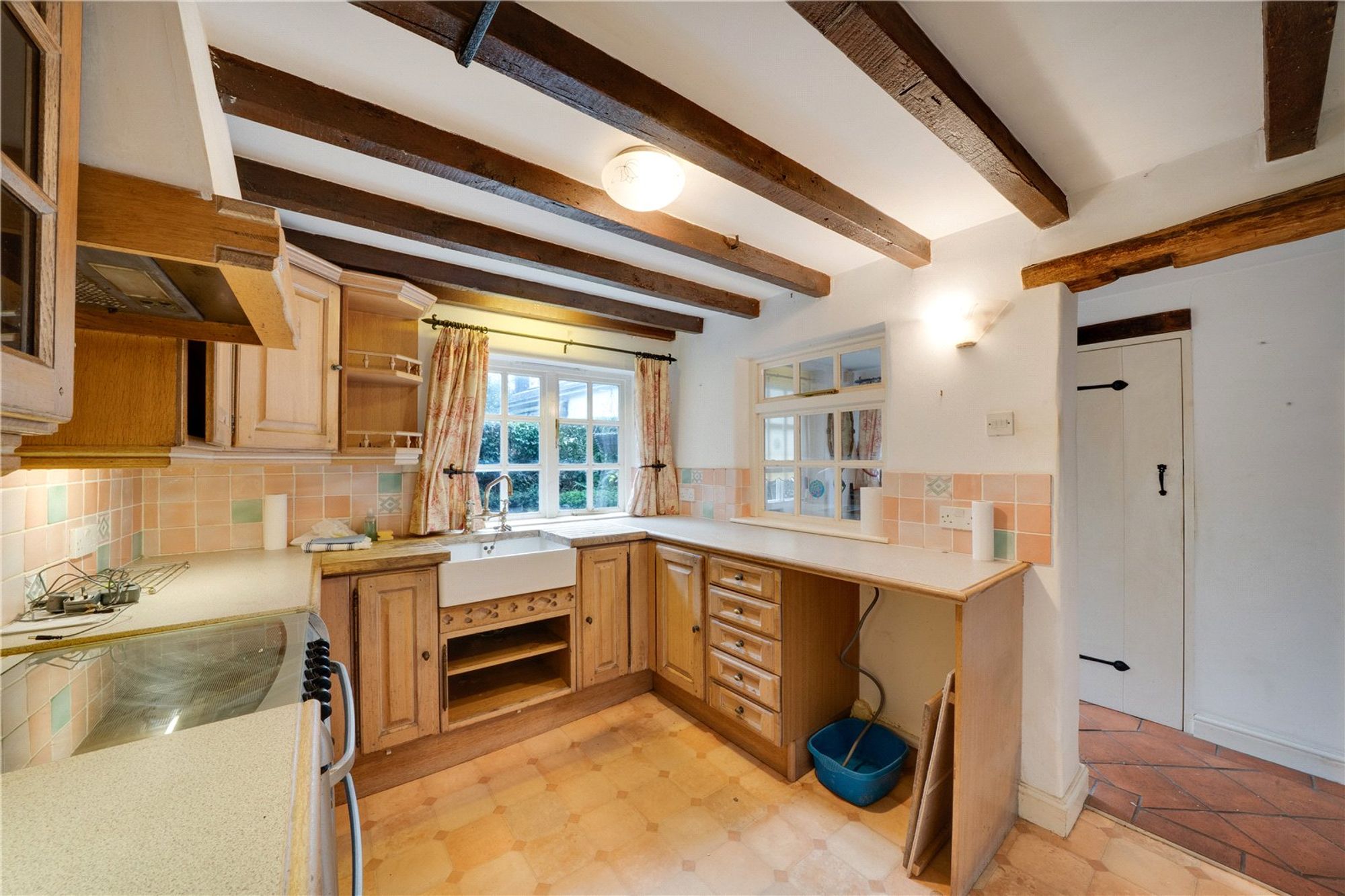 Accommodation comprises an entrance hall with access to the guest WC and leading through to the kitchen, which is fitted with a range of matching base and wall units, a Belfast sink, and space for appliances.