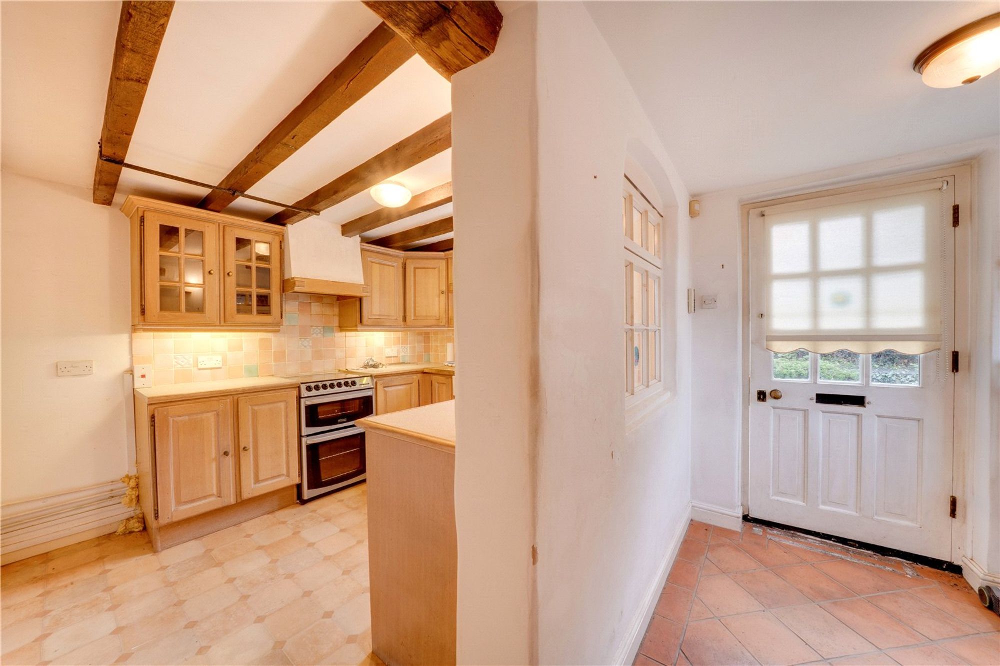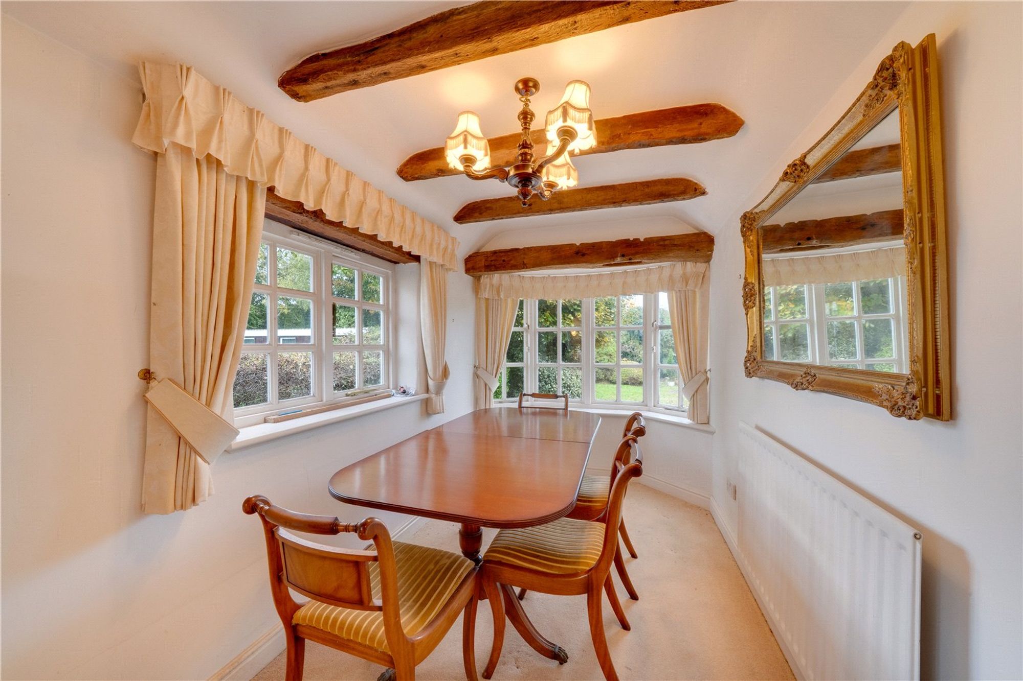 The living room is full of character, featuring timber ceiling beams and an attractive brick feature fireplace. The room has been extended to create a dining area, offering a bright and spacious setting with views towards the garden.