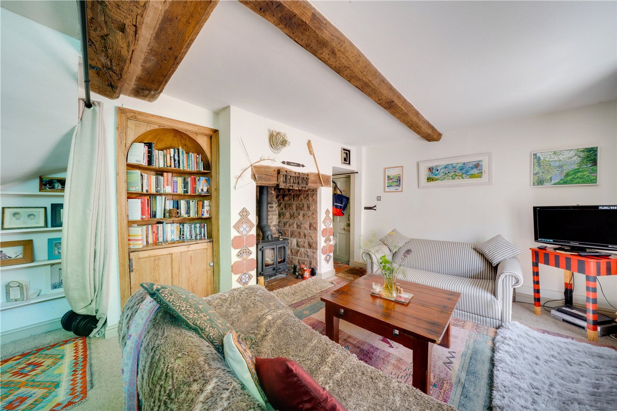 A beautifully presented grade II listed period home situated in a characterful corner of town, this delightful property offers charm, practicality, and an inviting layout across three floors—with a touch of rustic heritage. Thoughtfully updated while retaining its traditional warmth, the home enjoys features such as sash windows, feature fireplaces, and wood-burning stoves, all enhancing its authentic appeal. High-spec double glazing, fitted by the current owners, further enhances both comfort and energy efficiency throughout.The ground floor opens into a cosy and welcoming lounge, where a front-facing sash window allows natural light to pour in across the room’s generous proportions. A characterful open fireplace, complete with a wood-burning stove, adds a focal point of warmth and comfort. The open staircase to the upper floors creates a sense of space, while an understairs cupboard and side access door offer everyday practicality.Ascending to the first floor, the heart of the home reveals itself in a bright and stylish kitchen. Fitted with a range of bespoke wall and base units, wood worktops, and a Belfast sink, this space blends contemporary convenience with period charm. The kitchen also benefits from underfloor heating, providing a modern touch of luxury beneath its characterful aesthetic. Please note: The kitchen forms a flying freehold, as a section of it extends over a communal access tunnel beneath the property. This passageway is rarely, if ever, used, and does not affect the enjoyment or use of the home. A further staircase rises to the top floor, while a door leads through to a versatile room that can serve equally well as a formal dining area or an inspiring study. Here, another sash window frames views to the front, and a second fireplace with wood-burning stove completes the picture—perfect for intimate dinners or home working in comfort.The second floor continues the home’s theme of charm and proportion, with two double bedrooms and a well-appointed bathroom. The principal bedroom enjoys the character of a sloping ceiling, Velux window, and a recessed nook with hanging space, while the second bedroom features a traditional window overlooking the front aspect. The bathroom is modern and thoughtfully arranged, with a panelled bath, pedestal basin, WC, and a Velux window filling the space with daylight.Outside, the property benefits from a communal courtyard to the rear—an inviting spot for morning coffee or evening relaxation. With ample space for outdoor seating and access to an allocated parking area.