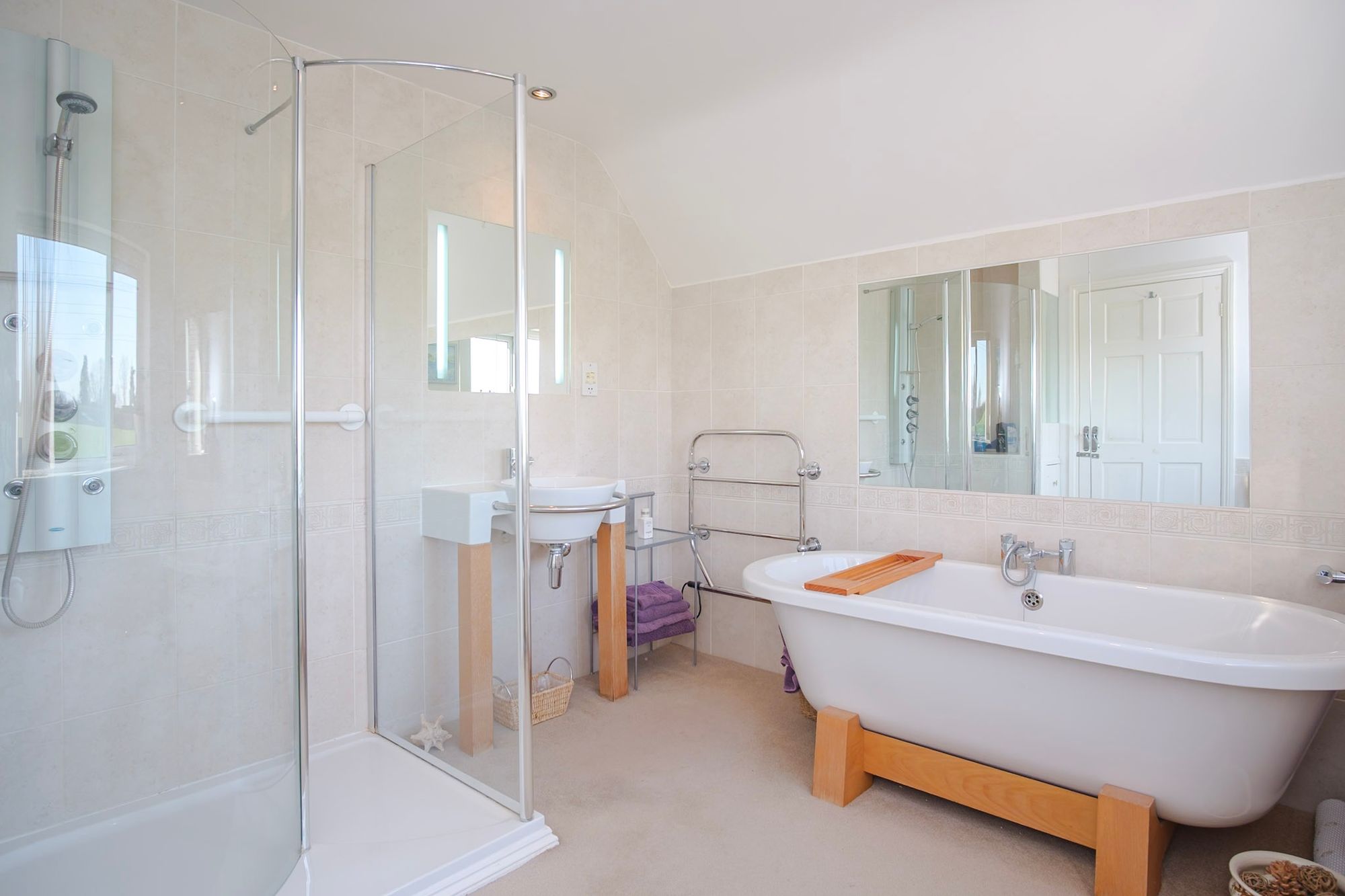 The first-floor galleried landing, with panoramic views, leads to three further bedrooms and a family bathroom featuring both a bath and separate shower. The principal bedroom suite includes a dressing room with fitted wardrobes and sink unit, leading through to an additional double bedroom with further storage and French doors opening onto a south facing roof terrace surrounded by mature grape vines, an ideal spot to enjoy morning coffee while taking in the surrounding landscape. Bedroom two benefits from an en-suite shower room and further extensive views over the adjacent farmland and open countryside beyond, towards Bridgnorth.