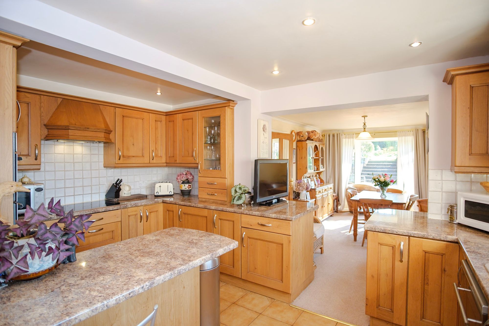 The kitchen is fitted with a range of wall and base units with matching worktops and inset sink unit, complemented by a walk-in pantry, integrated oven and hob, and open access into a bright breakfast room with a large bay window overlooking the garden.