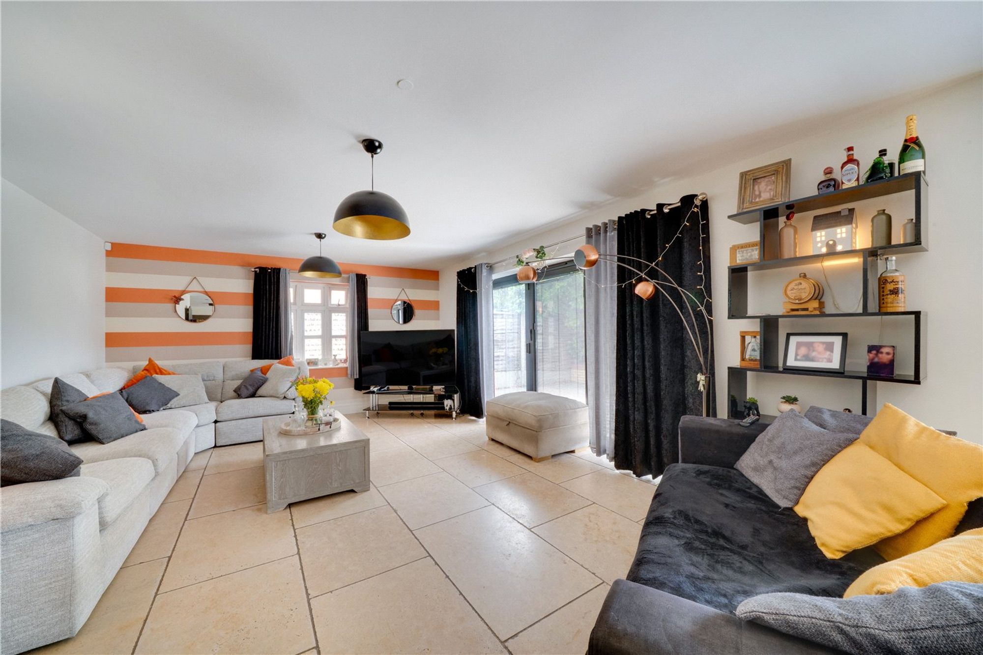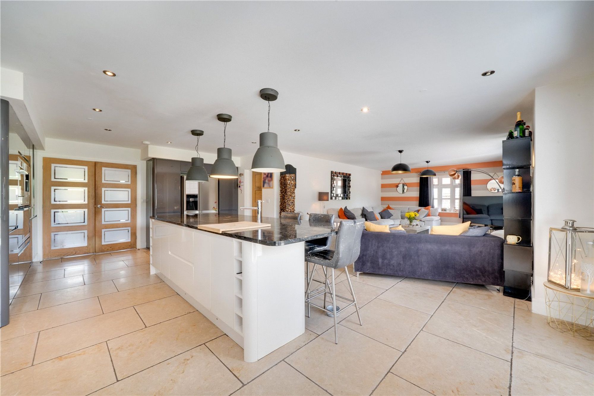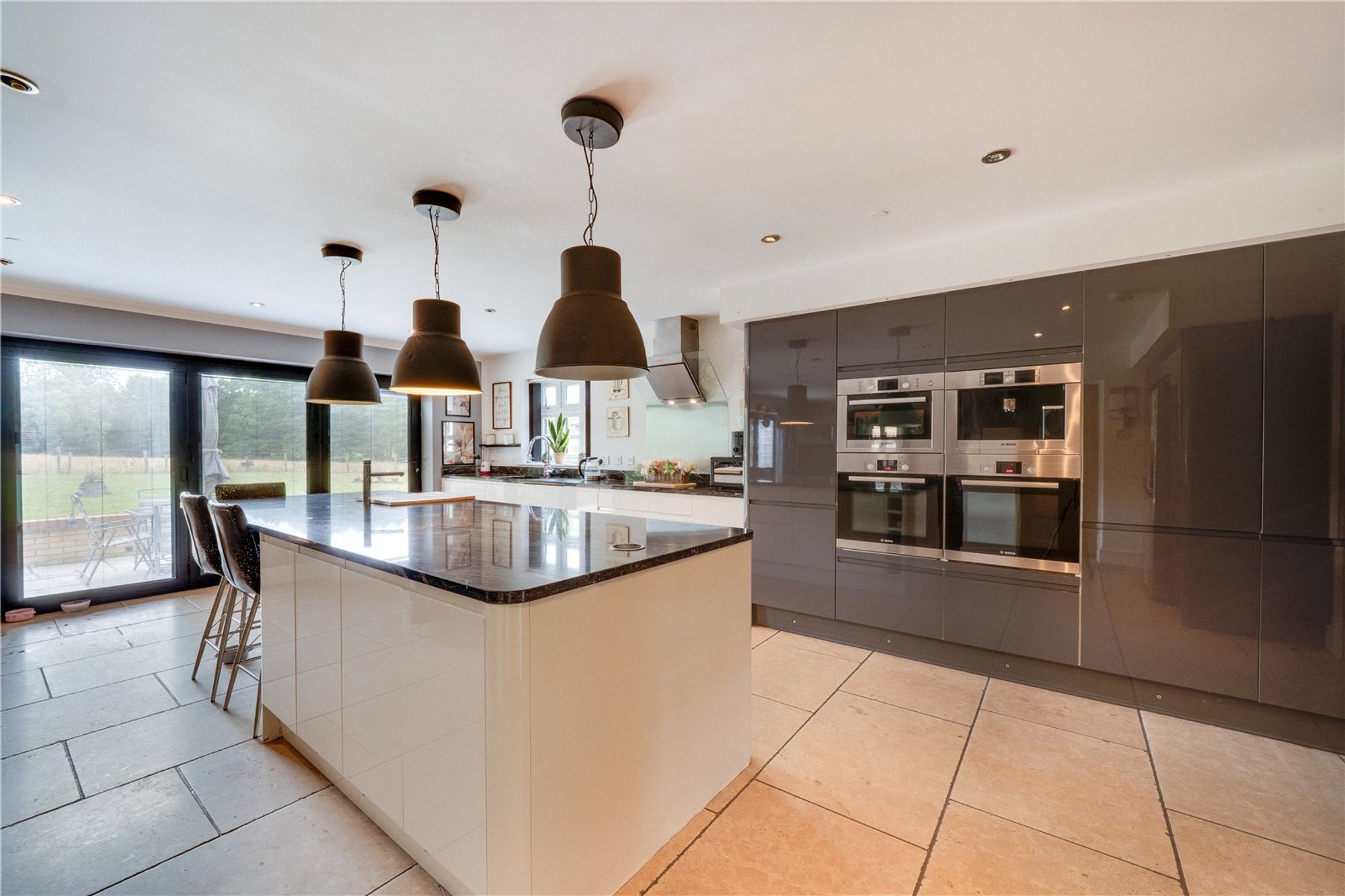 Glazed double doors from the hall leading into a stunning open plan dining kitchen and living room, perfect for modern family living and entertaining, having twin sets over bifold doors across the rear elevation leading out to a paved patio terrace. The kitchen is fitted with a generous range of wall and base units, a central island with breakfast bar and an impressive range of integrated appliances including twin ovens, induction hob, coffee machine microwave and dishwasher. Just of the kitchen is a useful utility room with built in storage and a side access door. There is also a separate dining room which could also serve as a large living room complete with woodburner.