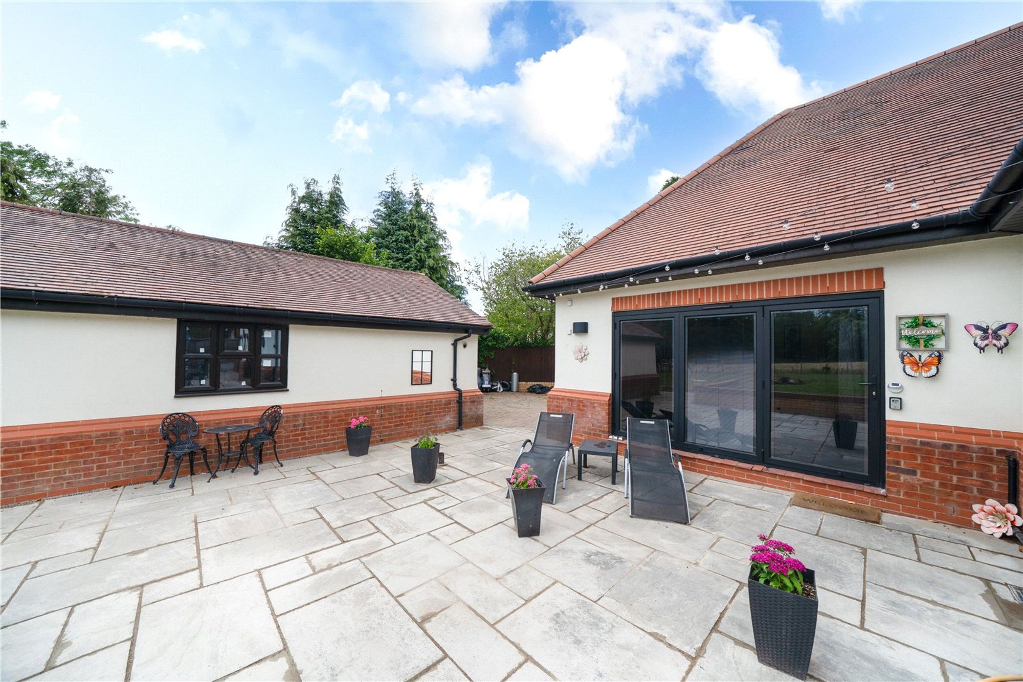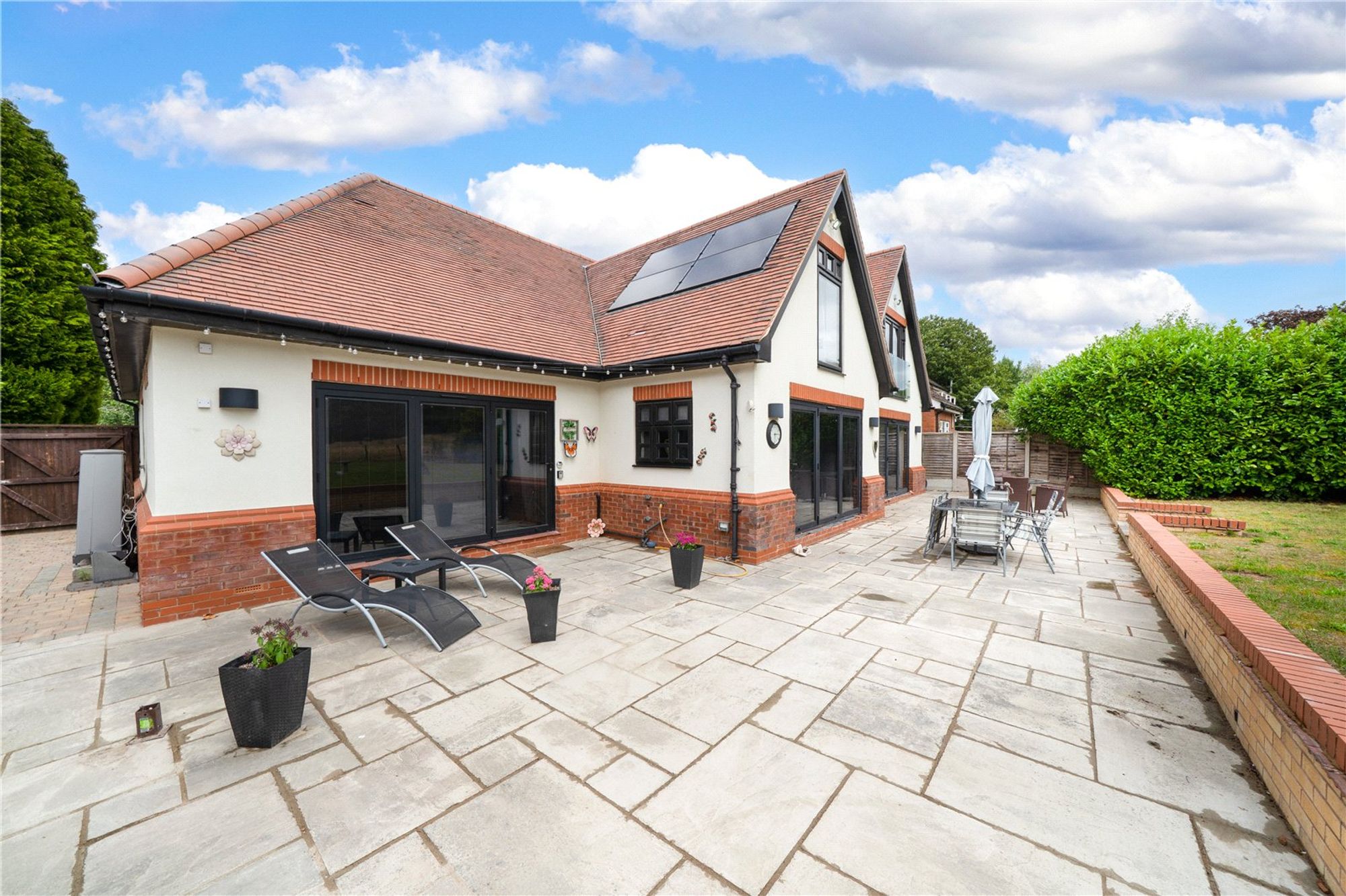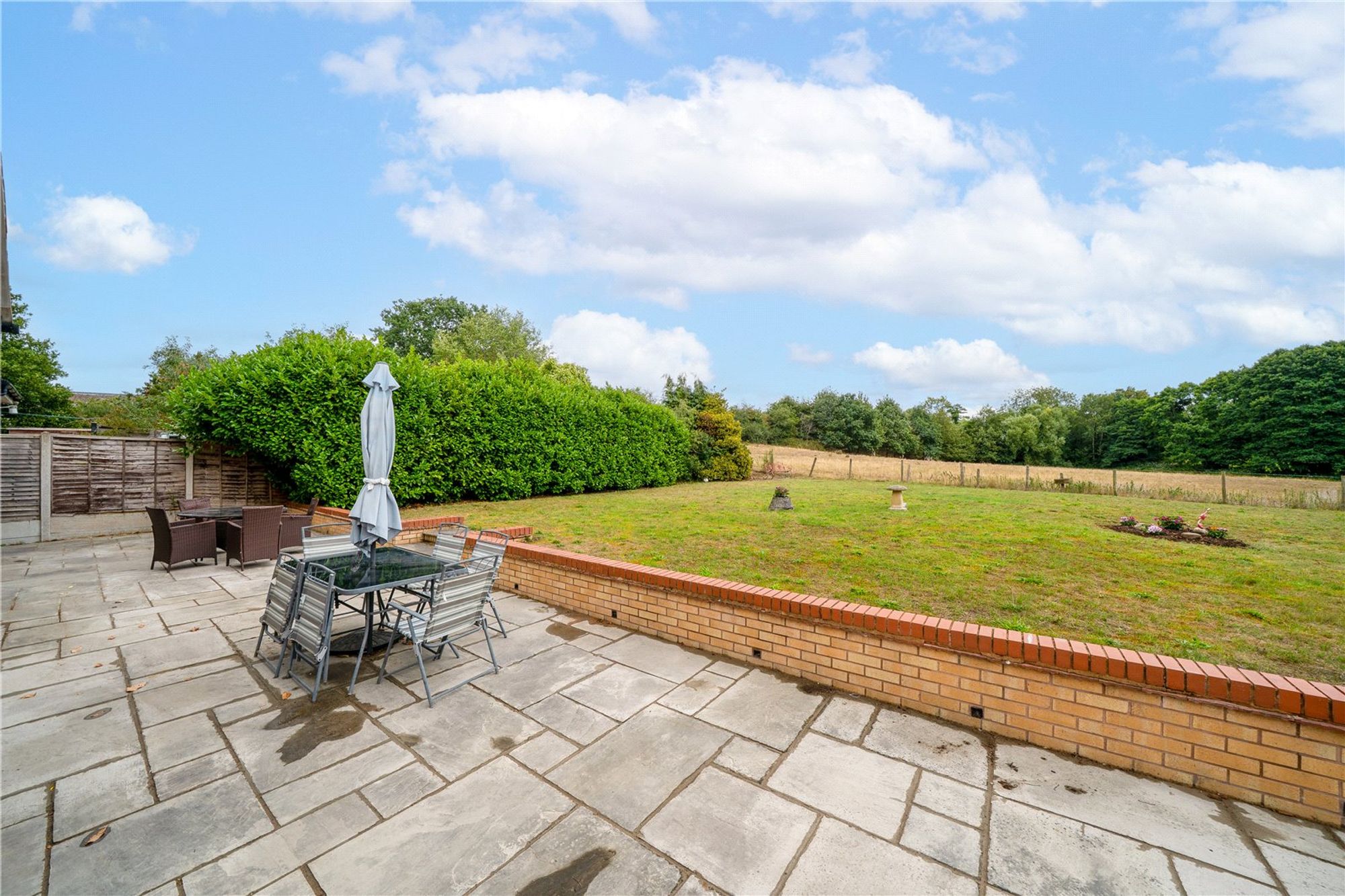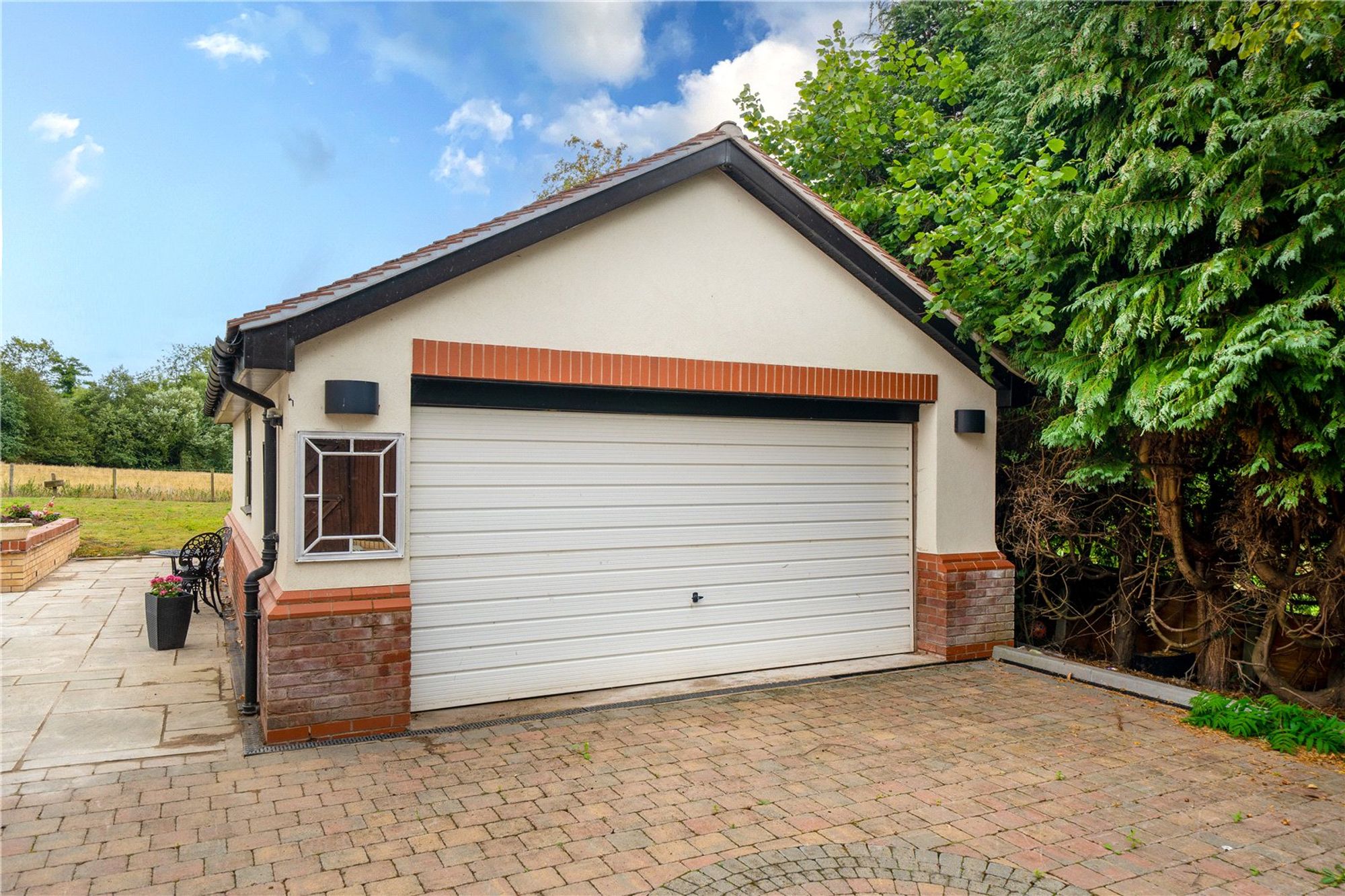The rear garden has been landscaped to create a superb patio terrace with a short set of steps up to a level lawn with open aspect over the fields to the rear.