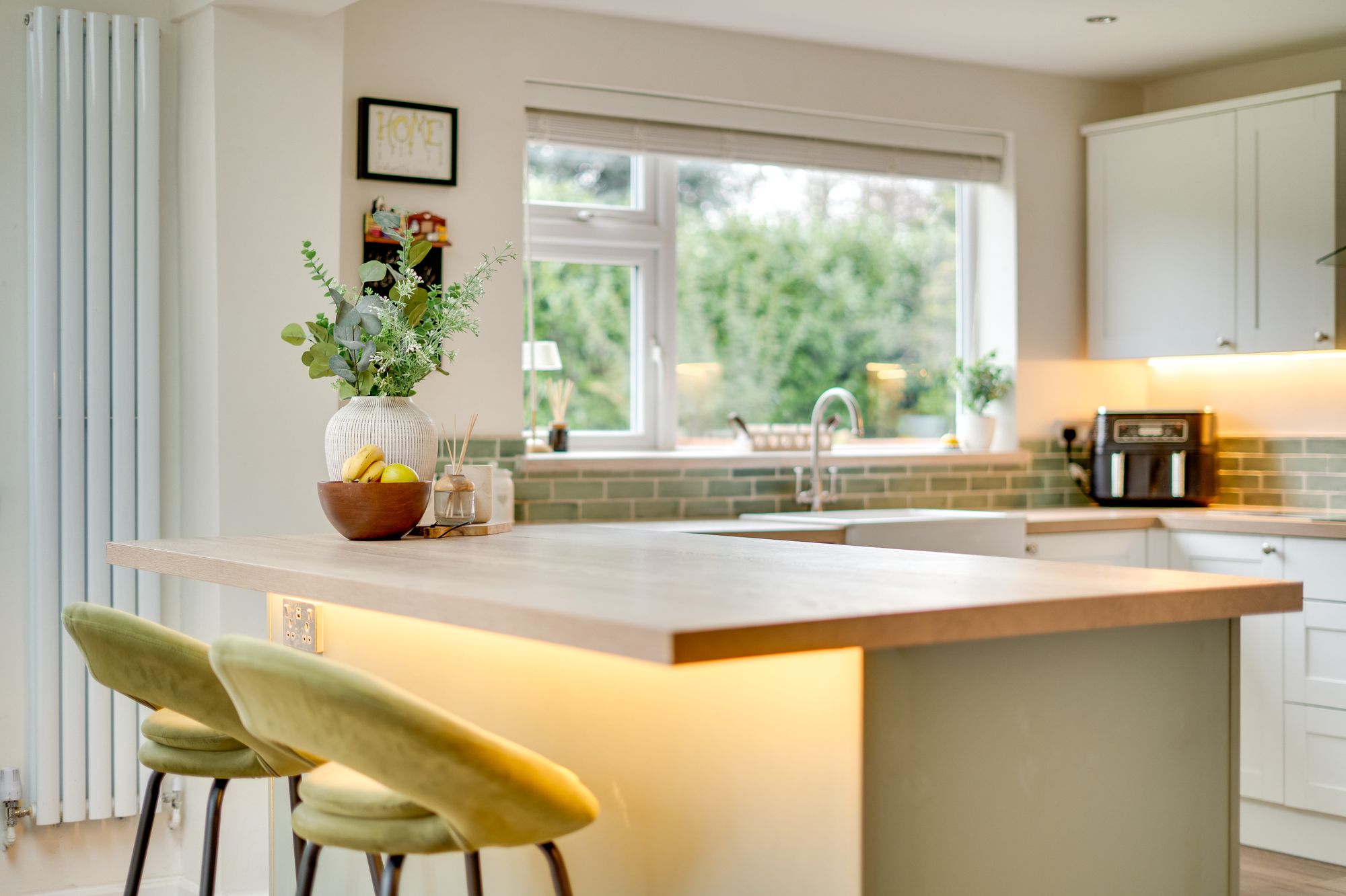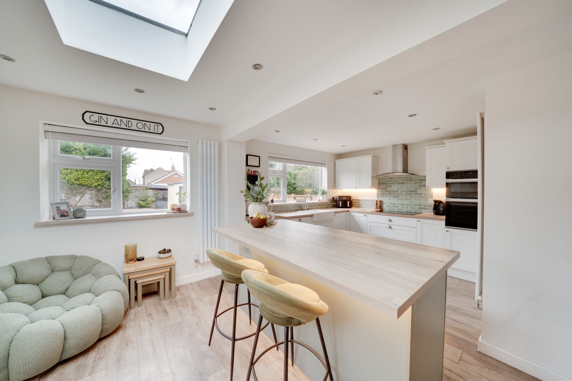 The property has been significantly enhanced by a thoughtful extension to the rear, creating an impressive open plan kitchen/dining space designed for modern living. This stunning area forms the heart of the home and features a comprehensive range of integrated appliances, sleek cabinetry and a central island with breakfast bar, ideal for both everyday use and entertaining. The kitchen/diner enjoys open access into the living room, creating a seamless flow and enhancing the sense of open-plan living.