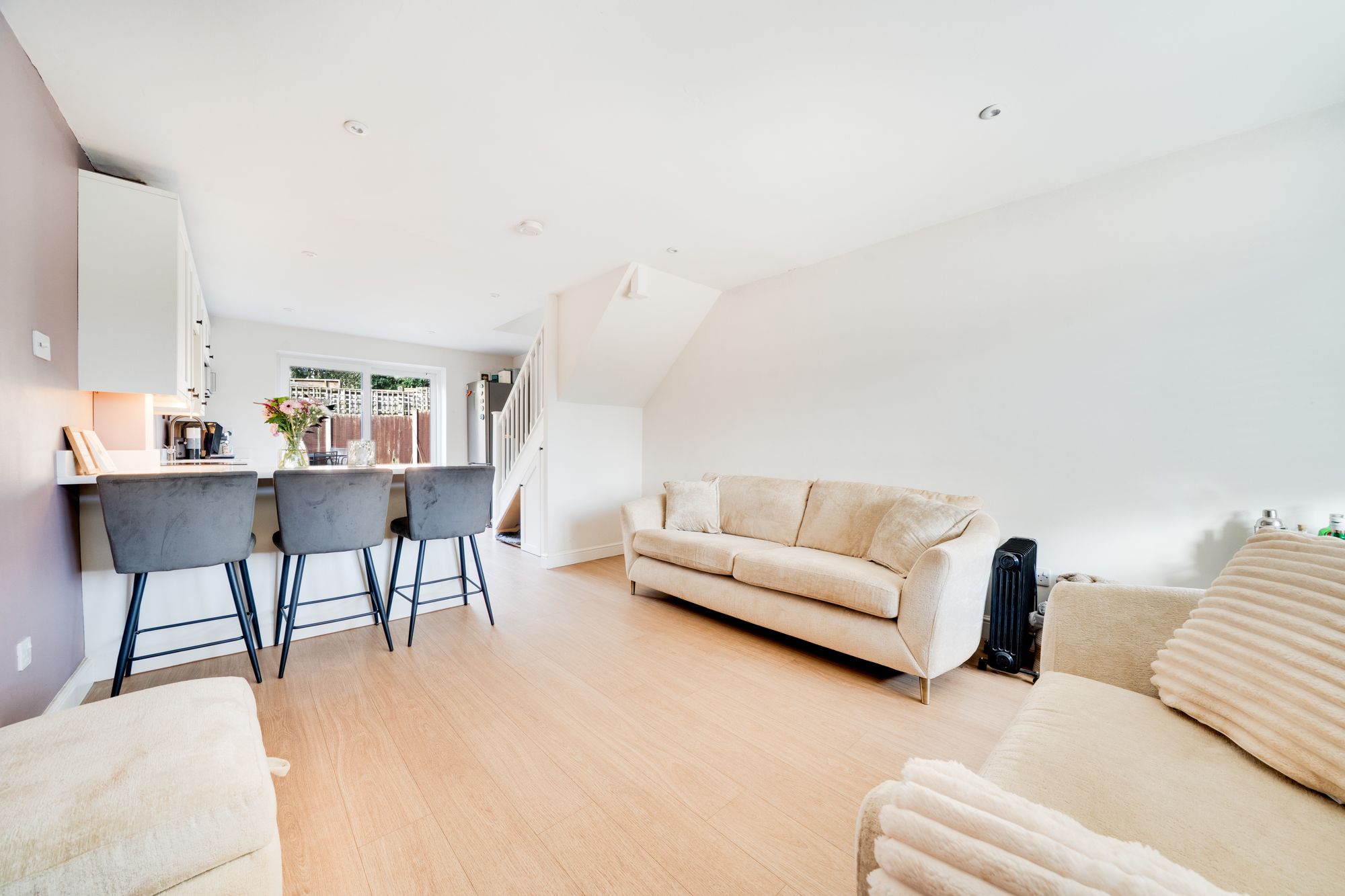 To the rear of the property is the kitchen, fitted with a modern range of wall and base units complemented by quartz worktops. The kitchen incorporates an integrated oven and hob, sink unit and integrated slimline dishwasher, along with space for additional appliances. A breakfast bar provides a sociable informal dining space while maintaining the open-plan feel of the ground floor. Sliding UPVC patio doors open directly onto the rear garden, creating an easy connection between the indoor living space and outside seating areas.