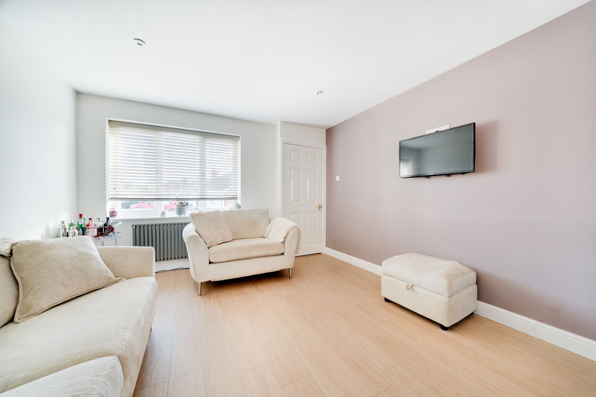 A small entrance porch opens into a bright and welcoming open-plan sitting and dining room. This spacious reception area offers ample room for both comfortable seating and dining, with a large window to the front allowing plenty of natural light. There is also useful under-stairs storage.