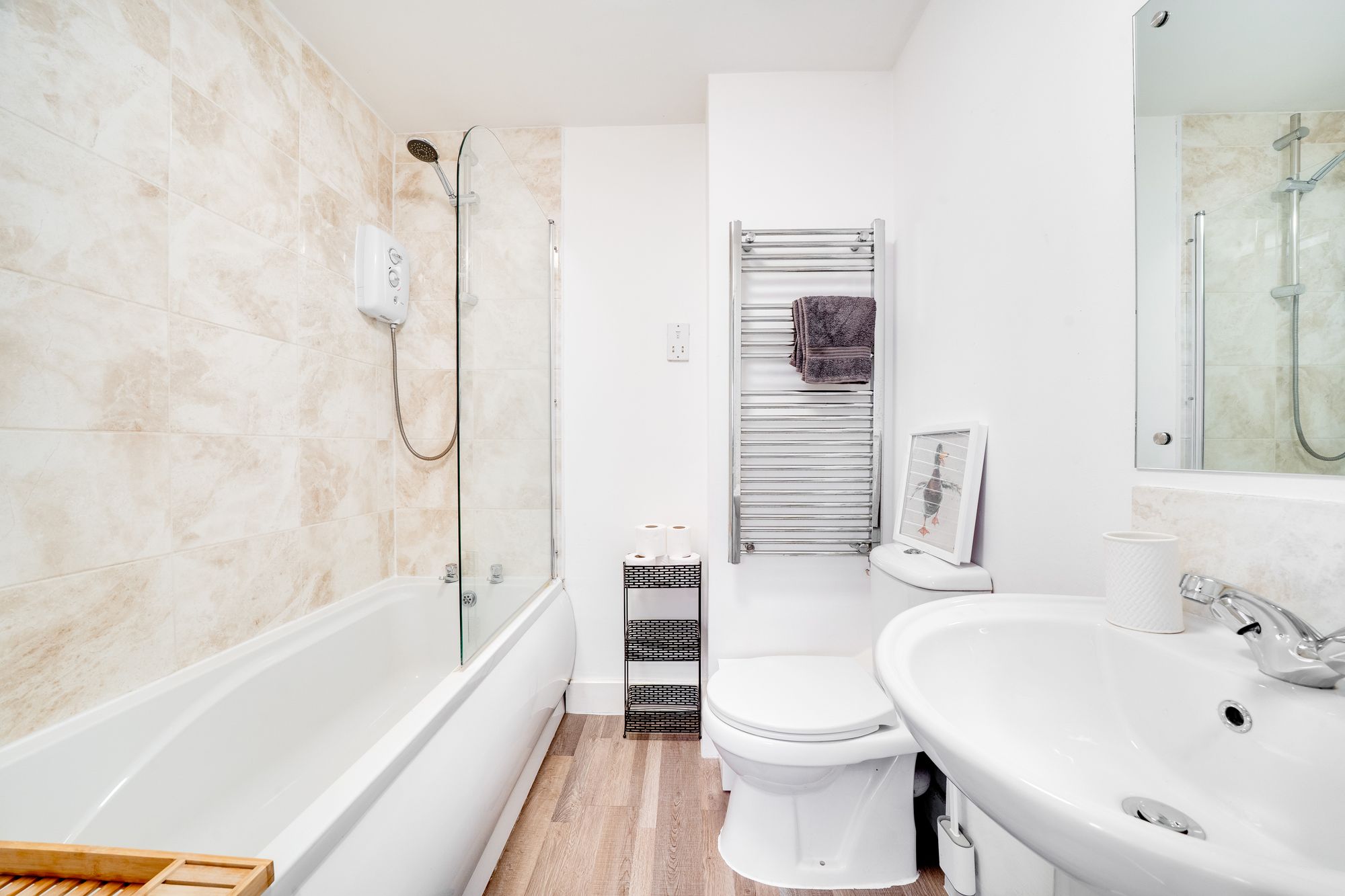 The family bathroom is fitted with a panelled bath with shower over, pedestal wash basin and low-level WC, complemented by tiled splashbacks and a heated towel rail.
