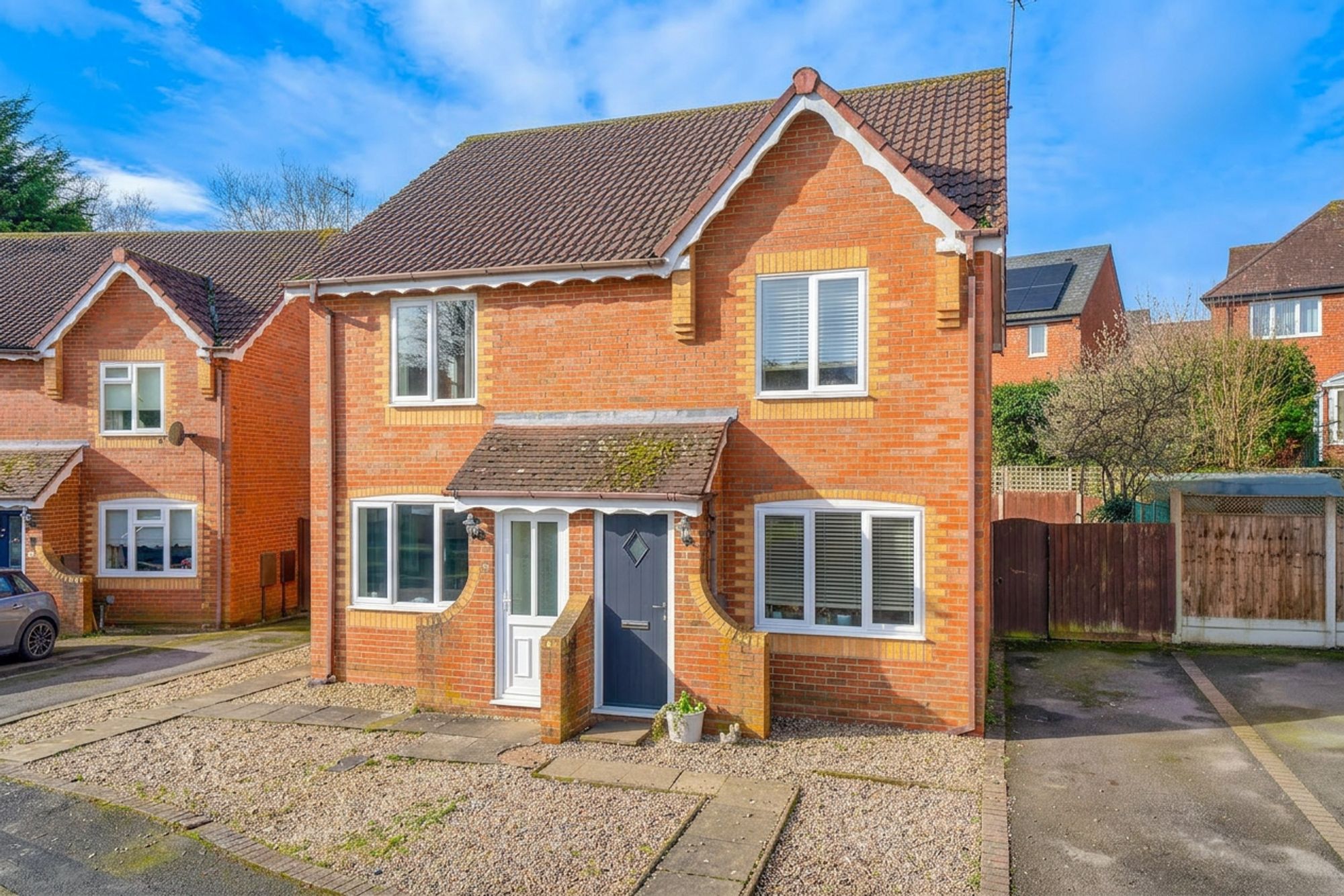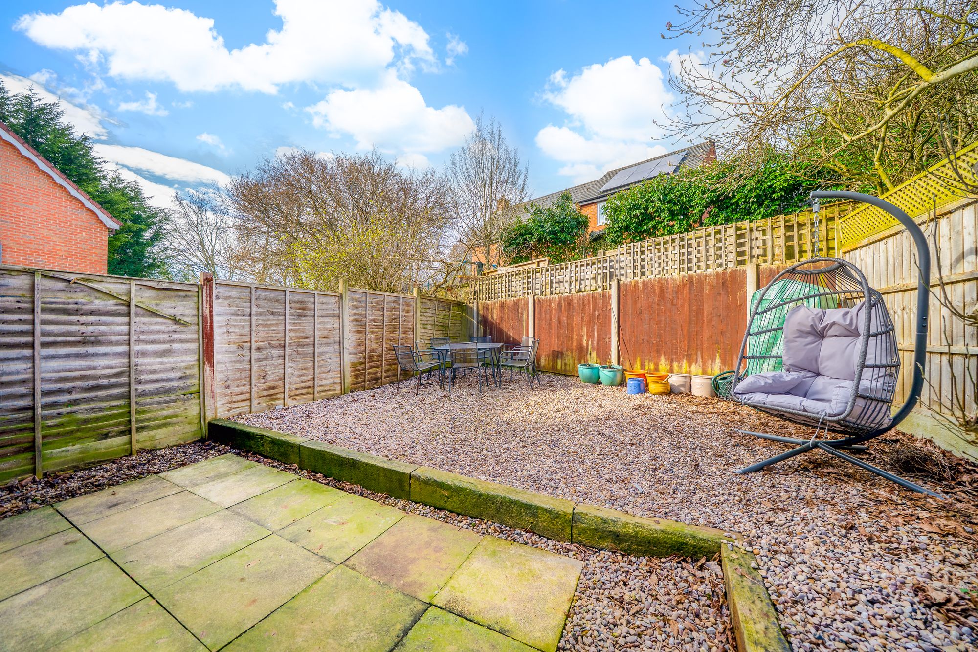 Outside, the rear garden is enclosed and designed for ease of maintenance, being predominantly gravelled with a paved seating area immediately outside the patio doors, ideal for outdoor dining and relaxing. The garden extends around to the side of the property where a timber gate provides access to the driveway parking area.