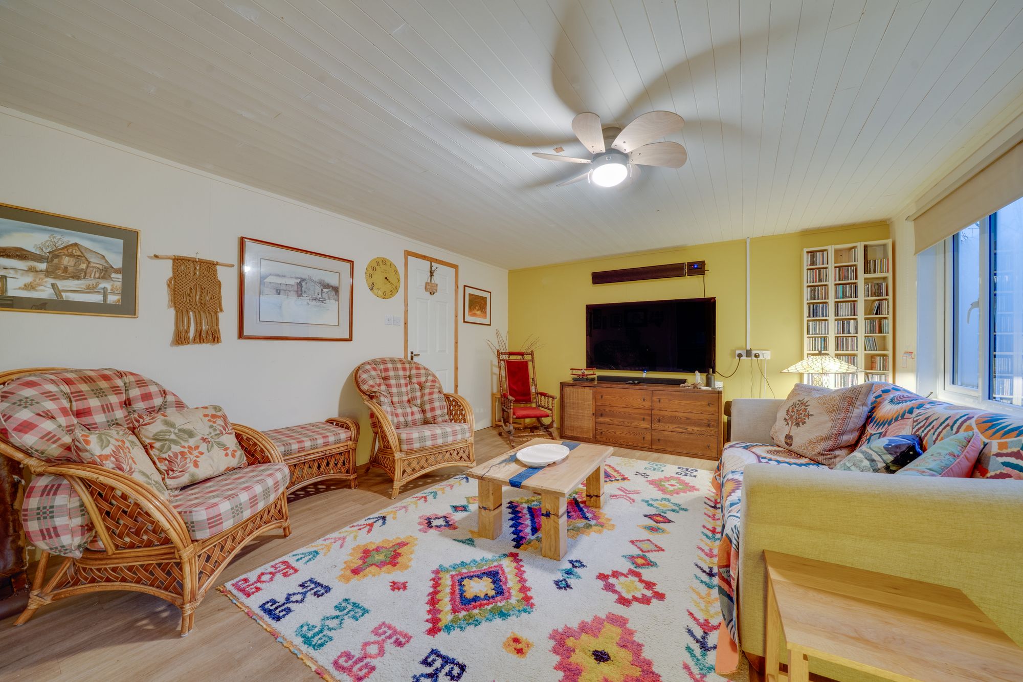 The accommodation is well arranged and successfully combines period character with practical and versatile living space. A porch provides a useful entrance space and leads into the central hall, from which the principal rooms are accessed. The sitting room offers a cosy retreat, centred around a fireplace housing a natural gas log effect stove, while a separate dining room provides an excellent space for entertaining and everyday family use. In addition, a rear porch provides a practical link between the house and garden, offering useful everyday space and currently accommodating a fridge freezer.