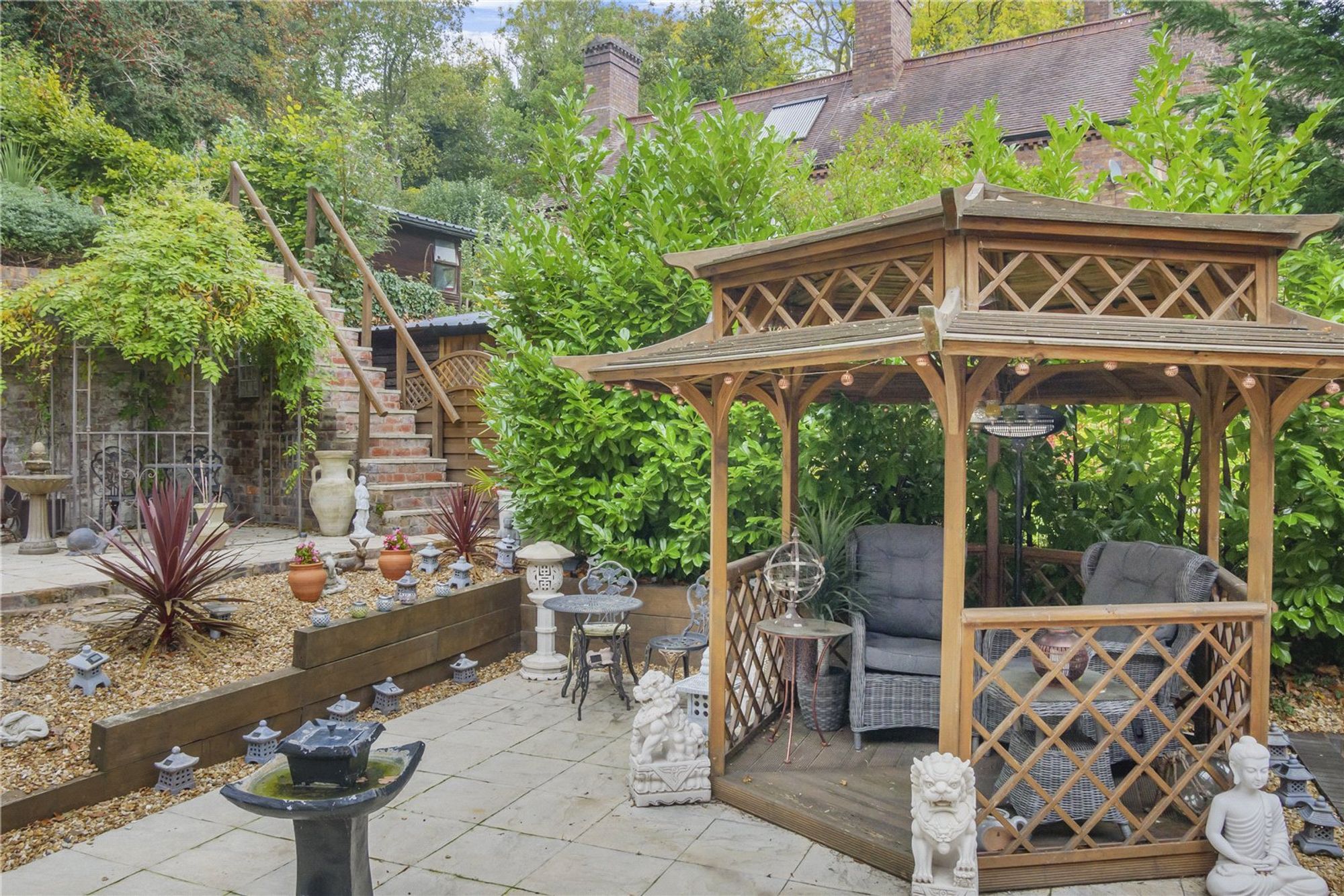 Outside the current owners have create a tranquil rear garden with some fantastic hard landscaping and a variety of seating areas, BBQ area and an attractive elevated covered seating are with electric heating. This is a real oasis that needs to be discovered by the next owner.