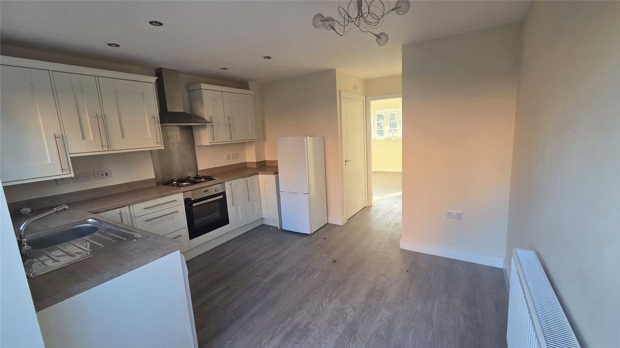 The area flows seamlessly into a modern kitchen diner, complete with fitted units, integrated appliances, and ample space for dining. French doors open onto the rear garden, filling the room with natural light. A convenient downstairs WC and a handy understairs cupboard add practicality to this ground floor layout.