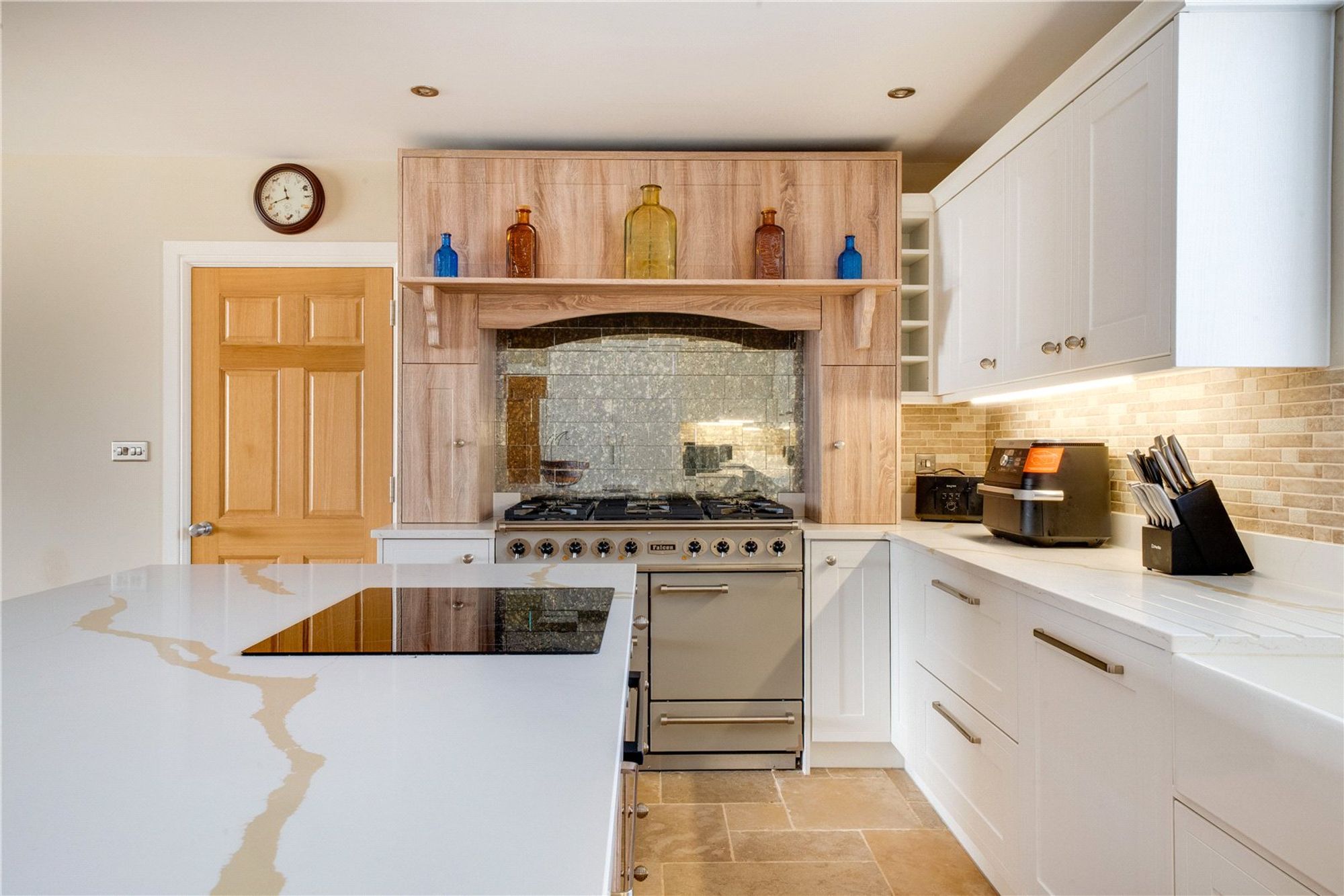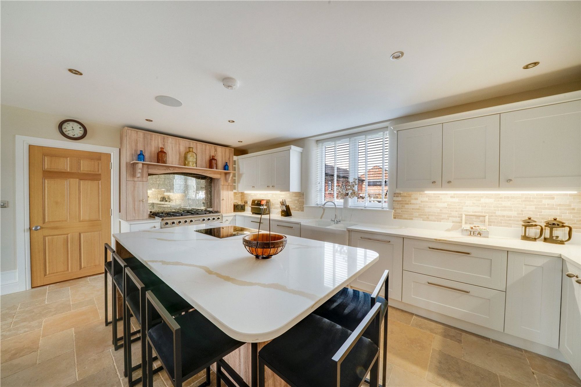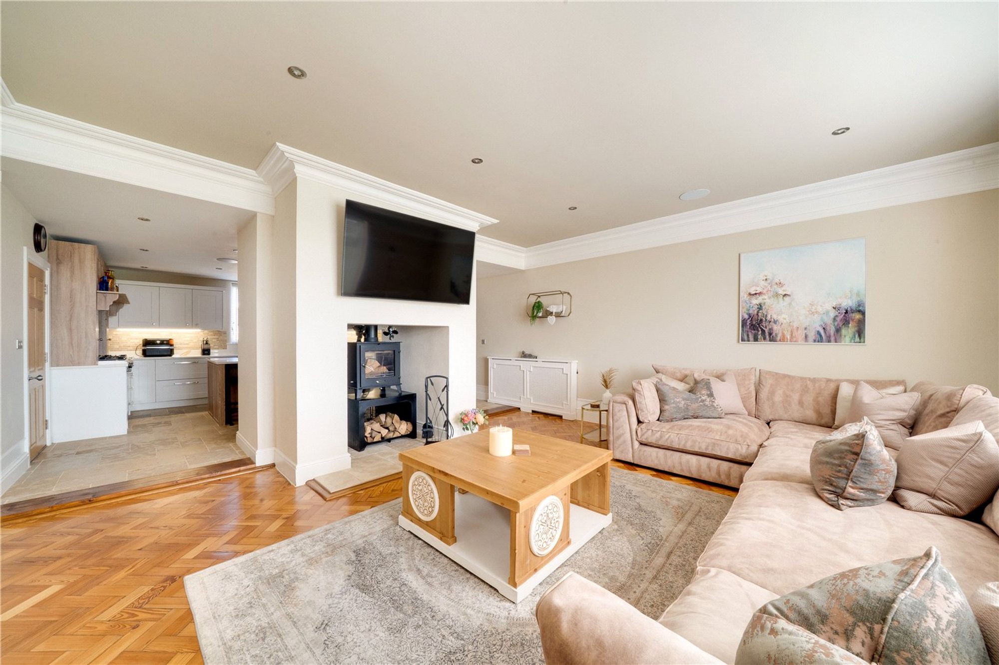 The heart of the home is the show-stopping kitchen, equipped with premium appliances and a sociable island seating six. A partially open-plan layout links seamlessly to the cosy snug, with a long sofa, Smart TV, and a raised wood burner that also warms the kitchen.