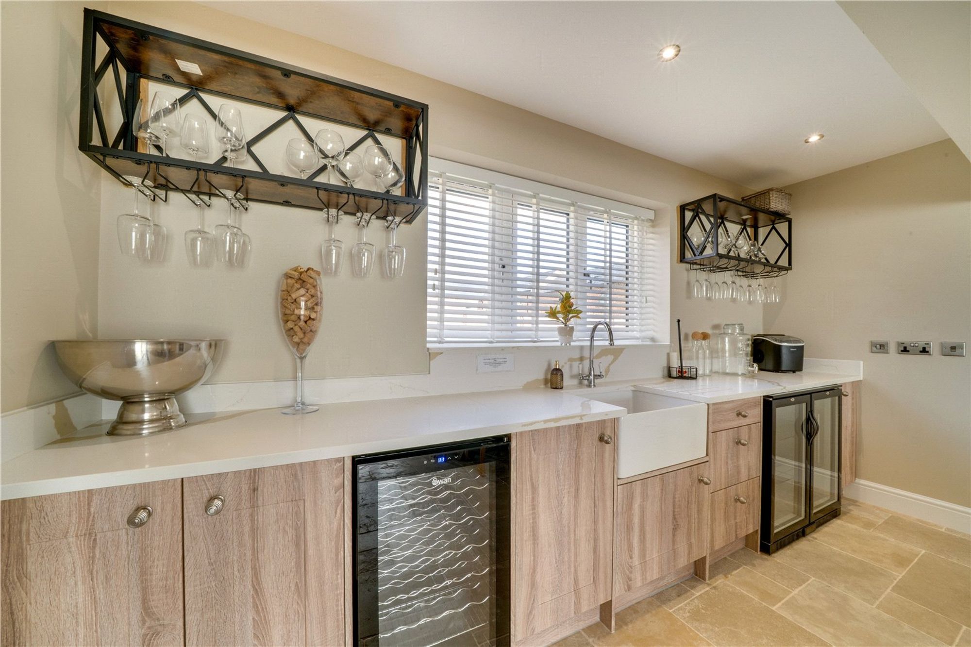A separate dining room offers a spectacular setting for entertaining, with an enormous dining table, dedicated bar area, twin bottle fridges, and a wine chiller—perfect for celebratory feasts. The light-filled lounge provides garden views and doubles as a cinema room, complete with projector, drop-down screen, and an electric fire for cosy evenings.