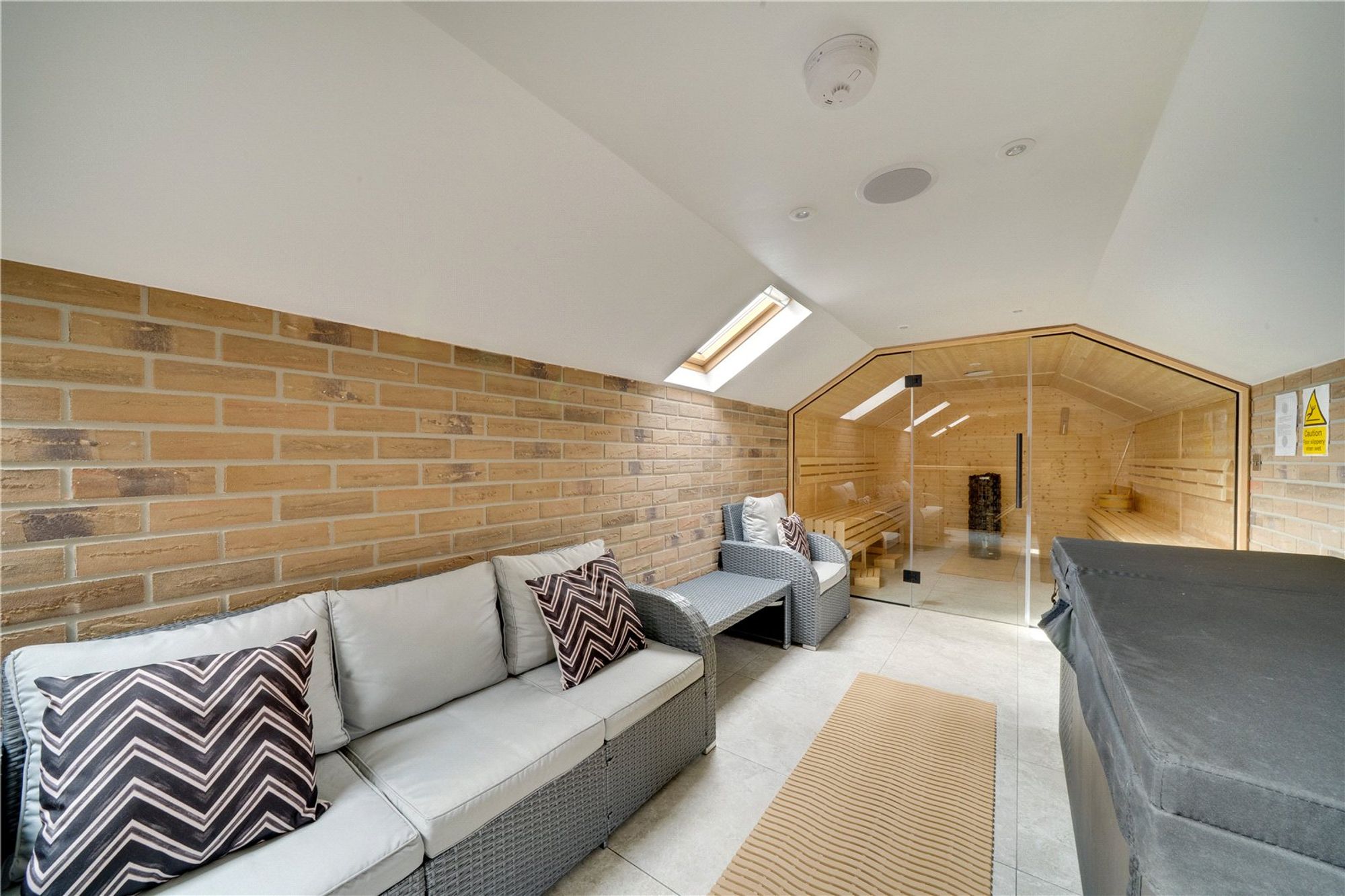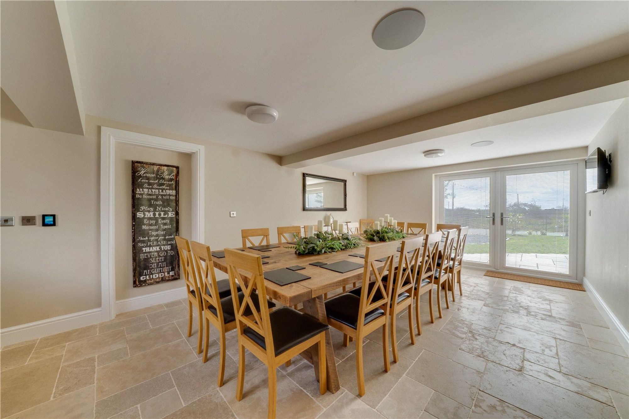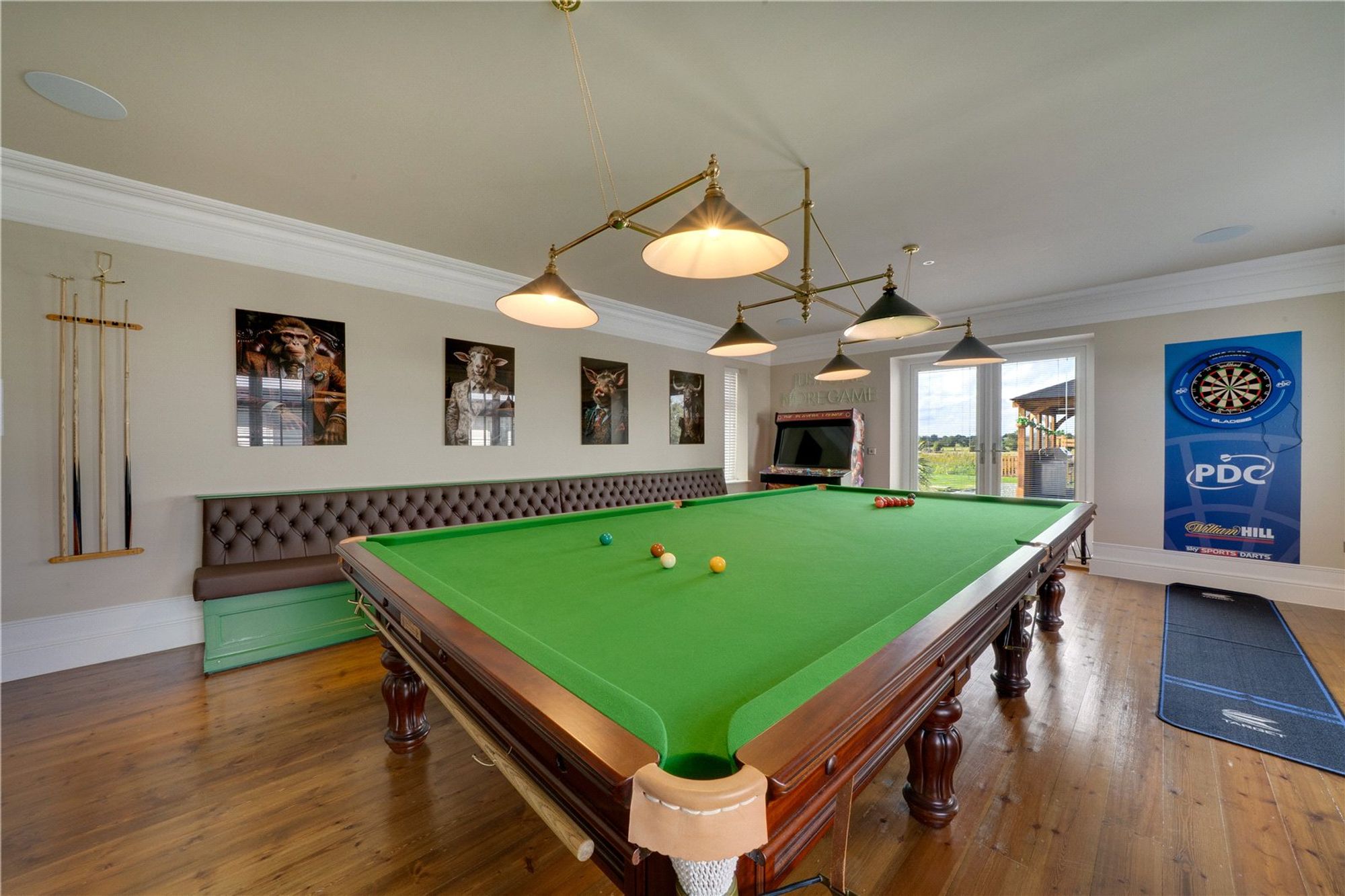 For fun-filled gatherings, the impressive games room is a highlight. Here, a full-size snooker table, arcade machine with 9,000 games, dartboard, and Smart TV are accompanied by a wood burner and double doors that open to the patio. State-of-the-art entertainment flows throughout the property with Bluetooth surround sound zones and Smart TVs in every room, including full Sky access.