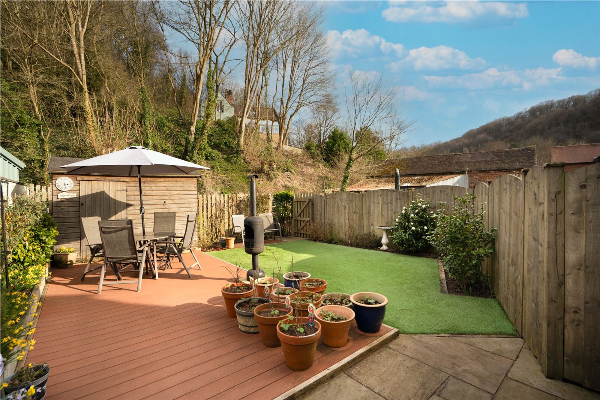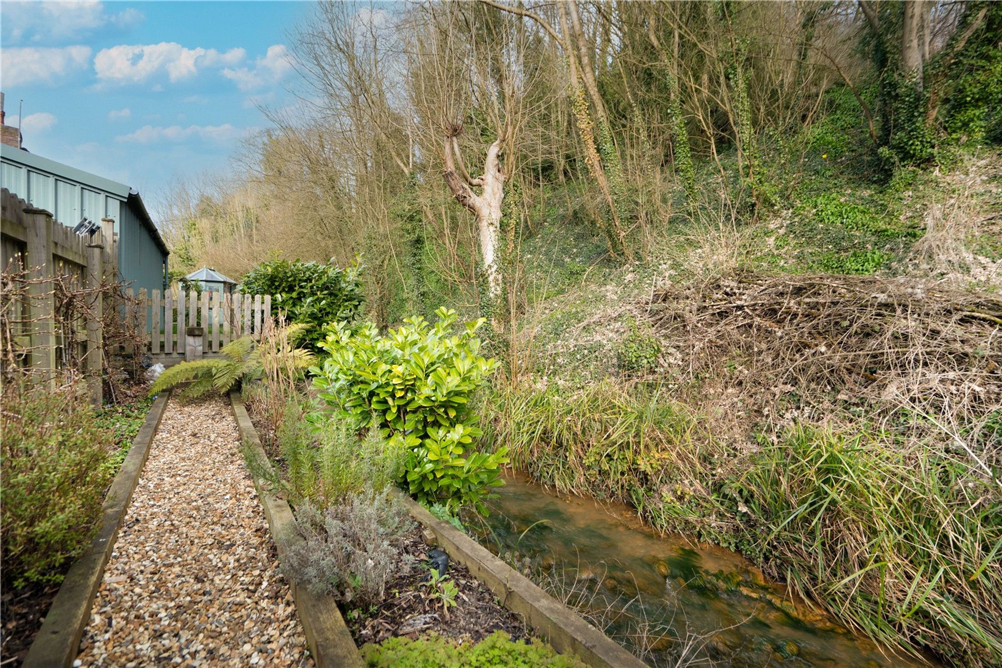 Outside the property has a private patio garden, and then a further generous enclosed garden which has a decked seating area, remainder is laid with artificial lawn and a good sized bespoke storage building with lighting and power. The garden has a gate leading through to a private seating area overlooking the brook.