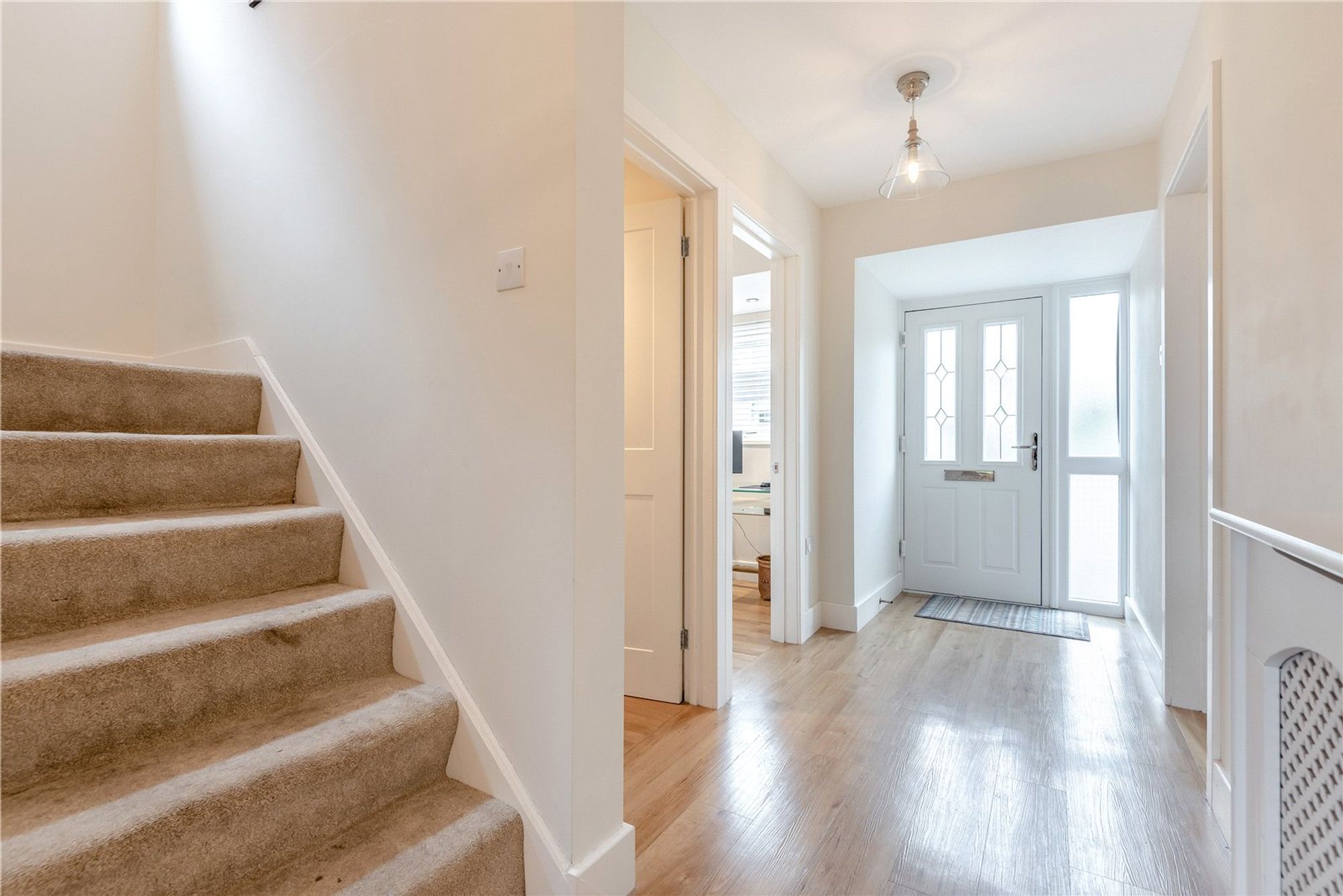 From the living room, double doors open into the dining room, where French doors provide a seamless connection to the rear garden. Just off the dining room, the well-equipped kitchen features integrated appliances and a practical layout ideal for everyday use. Adjacent to the kitchen, a spacious utility room offers additional convenience, with ample space and plumbing for a washing machine..