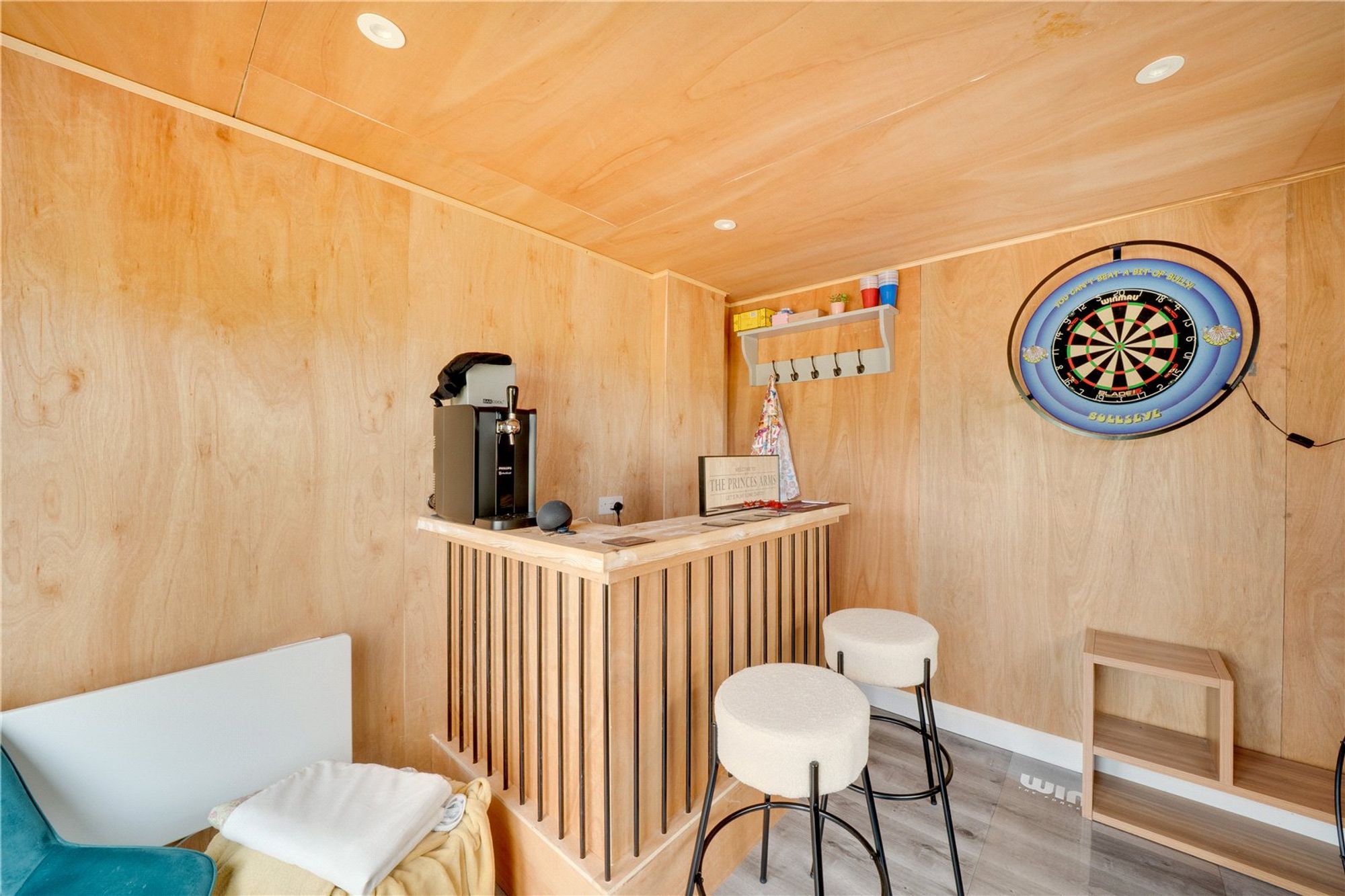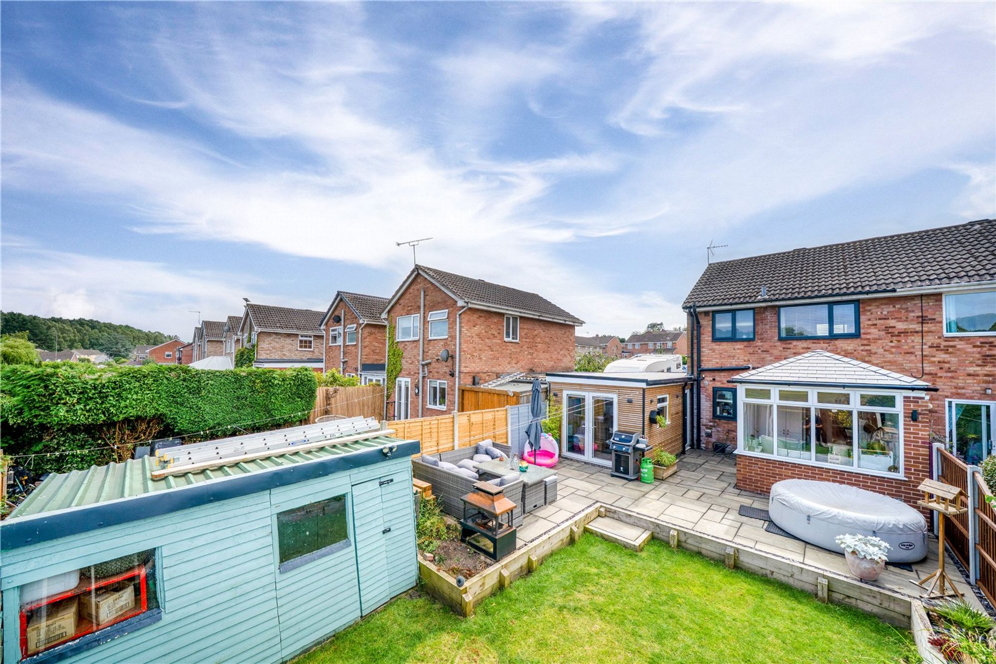 The rear garden includes a spacious patio area, a neatly maintained lawn, and an impressive outbuilding cleverly divided to provide practical storage and a stylish bar/games room—perfect for summer gatherings and outdoor entertaining.