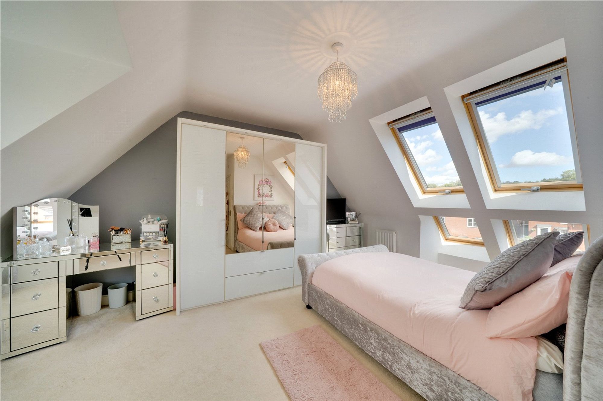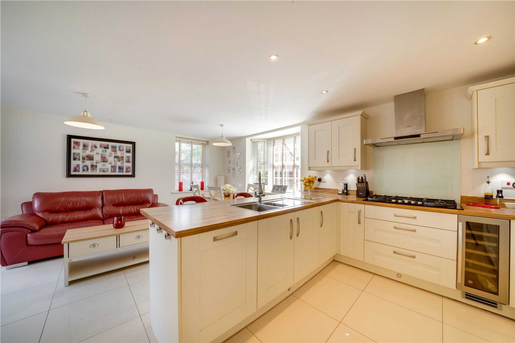 Ground Floor: A welcoming hallway leads into a generous lounge with bay window overlooking the frontage, an elegant fire surround, and French doors opening onto the garden. A separate dining room enjoys a dual aspect, while the rear of the house is dominated by the open-plan kitchen and family room. Designed as the hub of the home, this space combines a sleek, contemporary kitchen with ample room for dining and seating, and is bathed in natural light thanks to a bay window on one side and French doors on the other giving access to the rear garden. Completing this floor are a guest WC and utility room accessed from the kitchen.