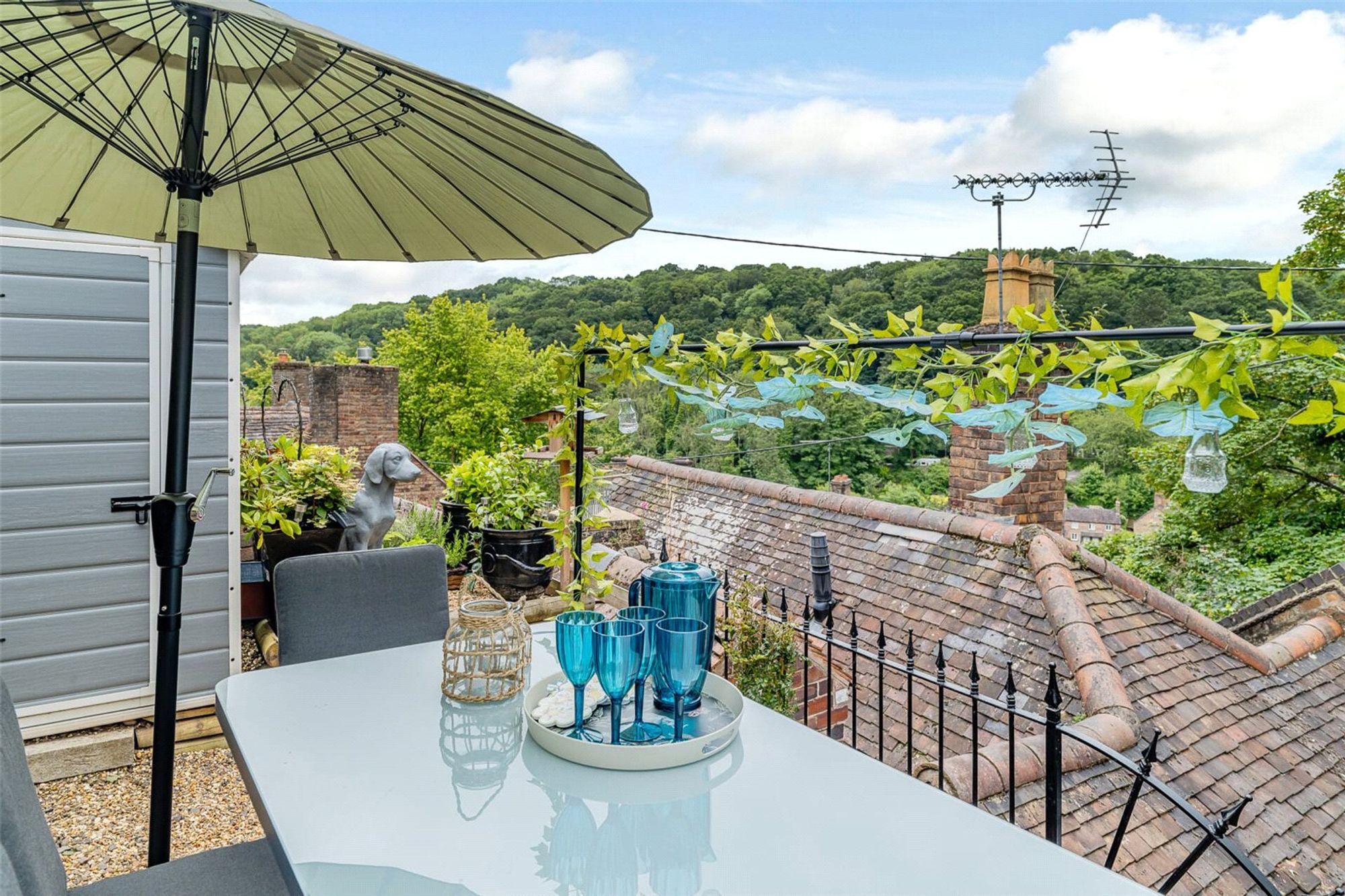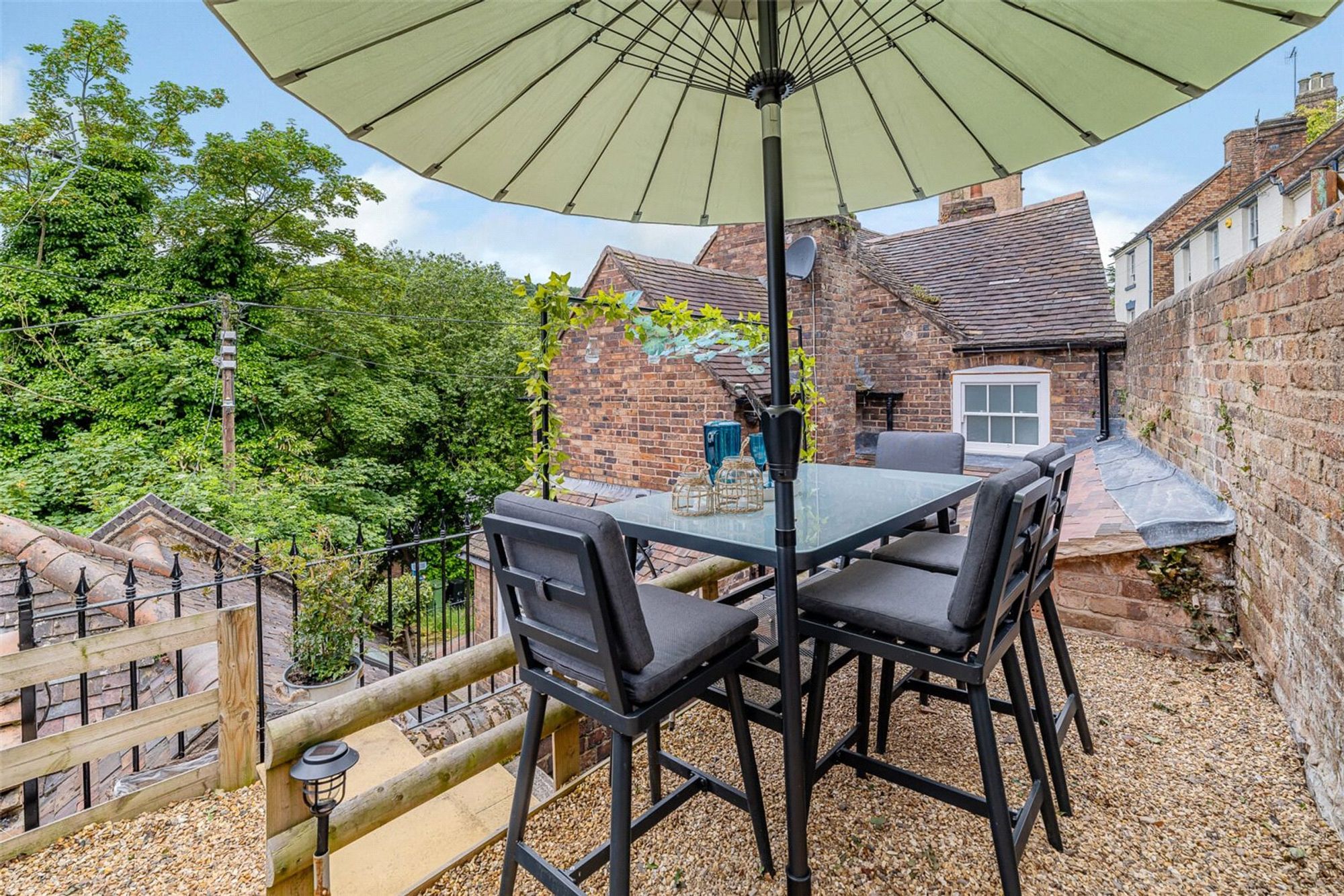 The cottage is approached via steps with ornate cast-iron railings leading to a charming seating area at the front. Around the side, a useful brick-built store with a pitched roof offers practical space, while steps at the rear rise to a south-facing sun terrace -the perfect spot to enjoy morning coffee or evening sunsets, with far-reaching views across the Gorge.