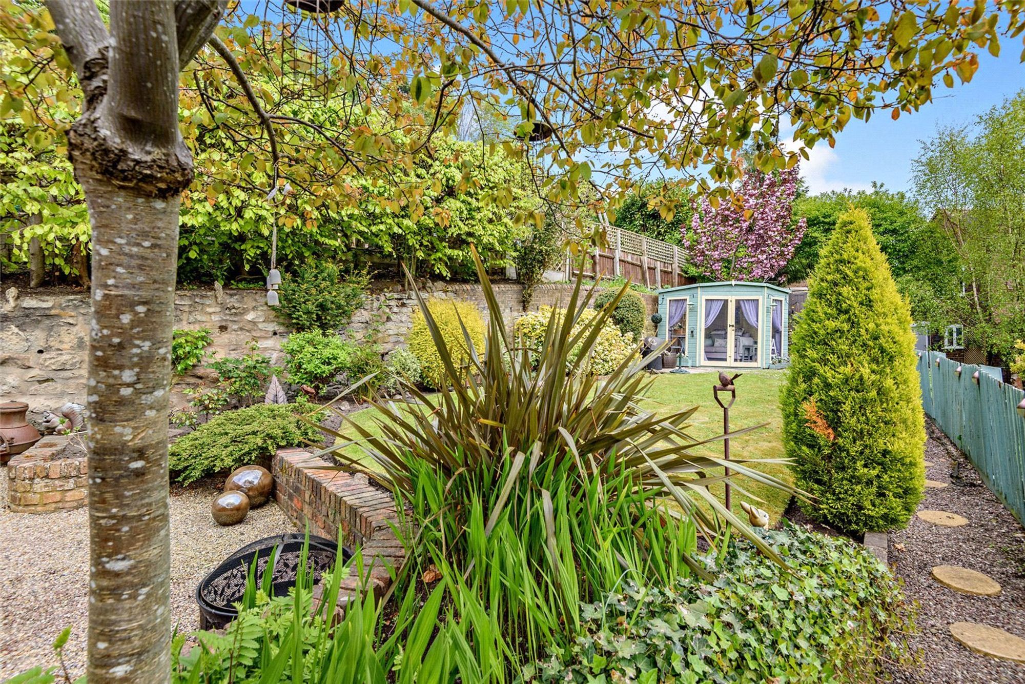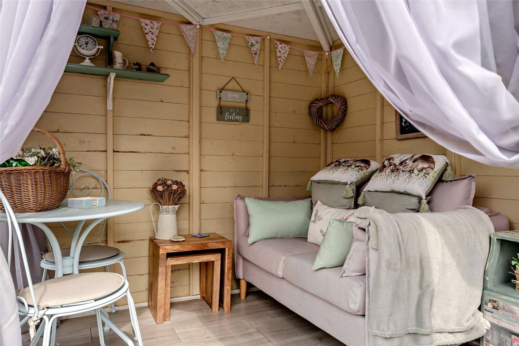 Outside the property features a beautifully landscaped private rear garden which offers an array of planting around a manicured lawn leading to a summer house. To the front, the property benefits from a further garden to the side with a small seating area and large storage area.
