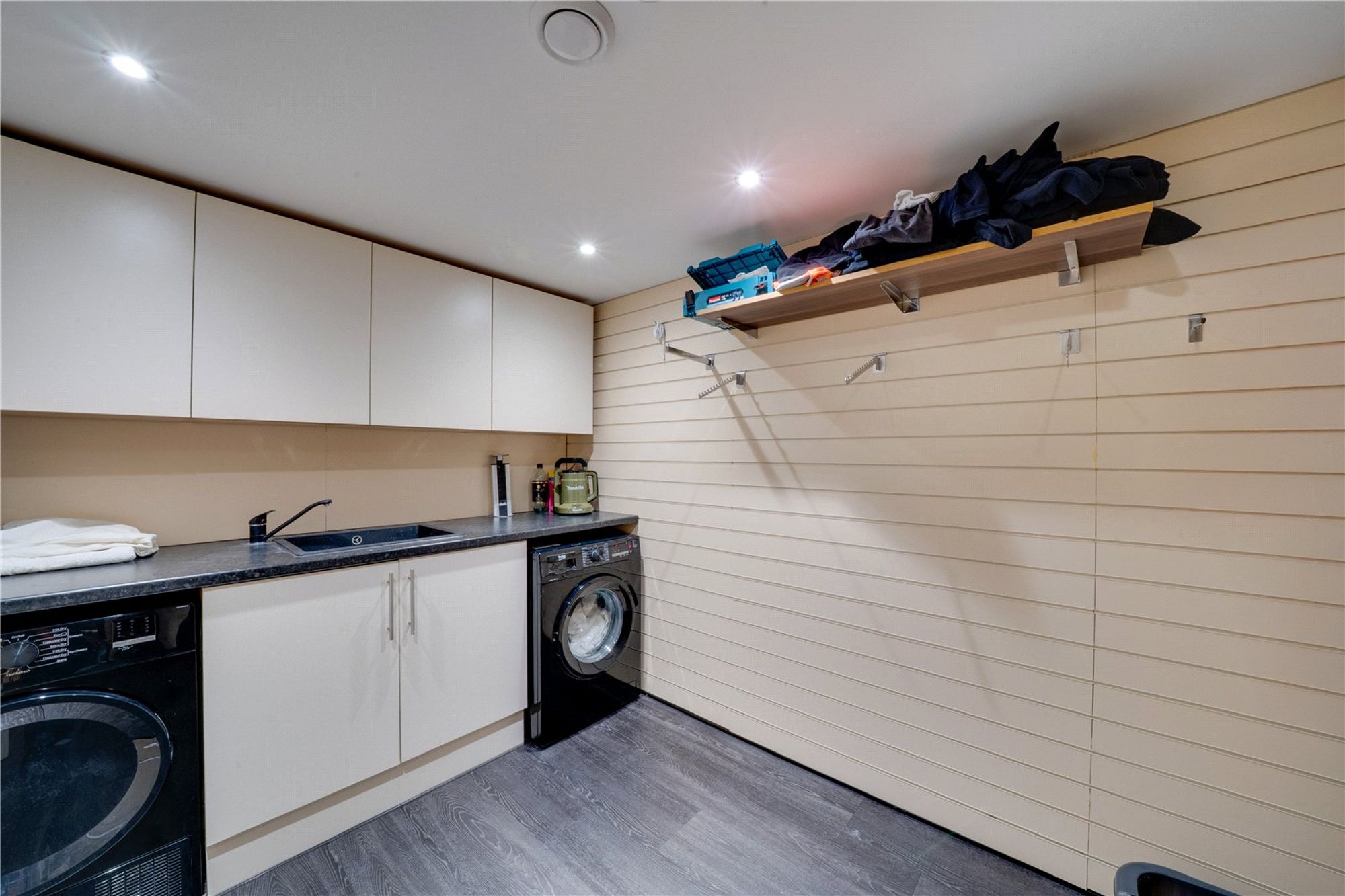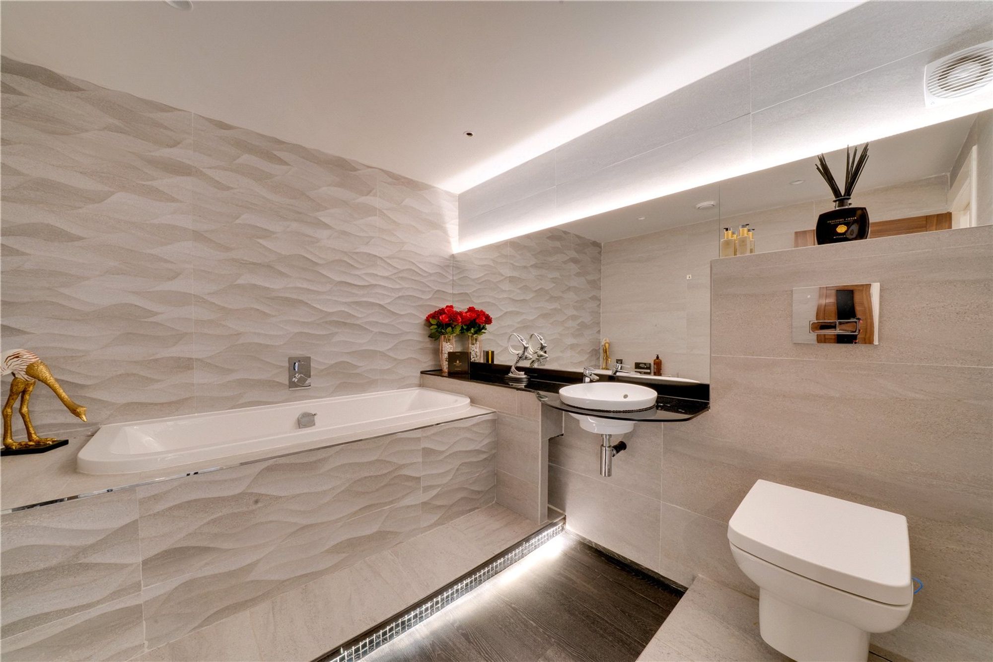 Descending from the main living space, the lower ground floor reveals two further well-proportioned bedrooms, a stunning second bathroom of Porcelanosa distinction, and a useful utility room, all enhanced by automatic ambient lighting and practical design.