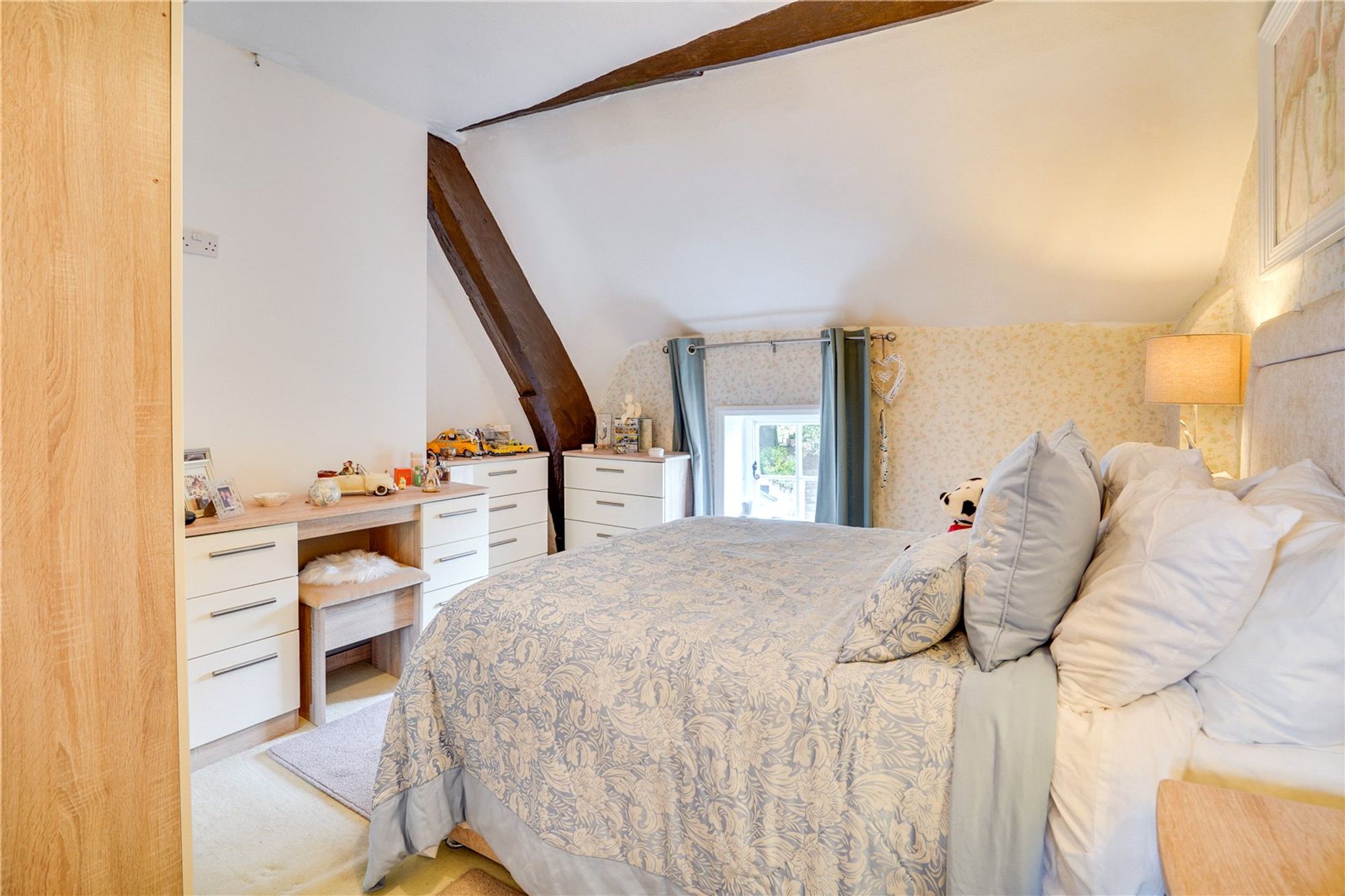 Bedroom One (3.65m x 3.37m maximum) - Double bedroom with a fitted carpet, exposed beams, radiator, tv aerial and window to the front elevation with village views