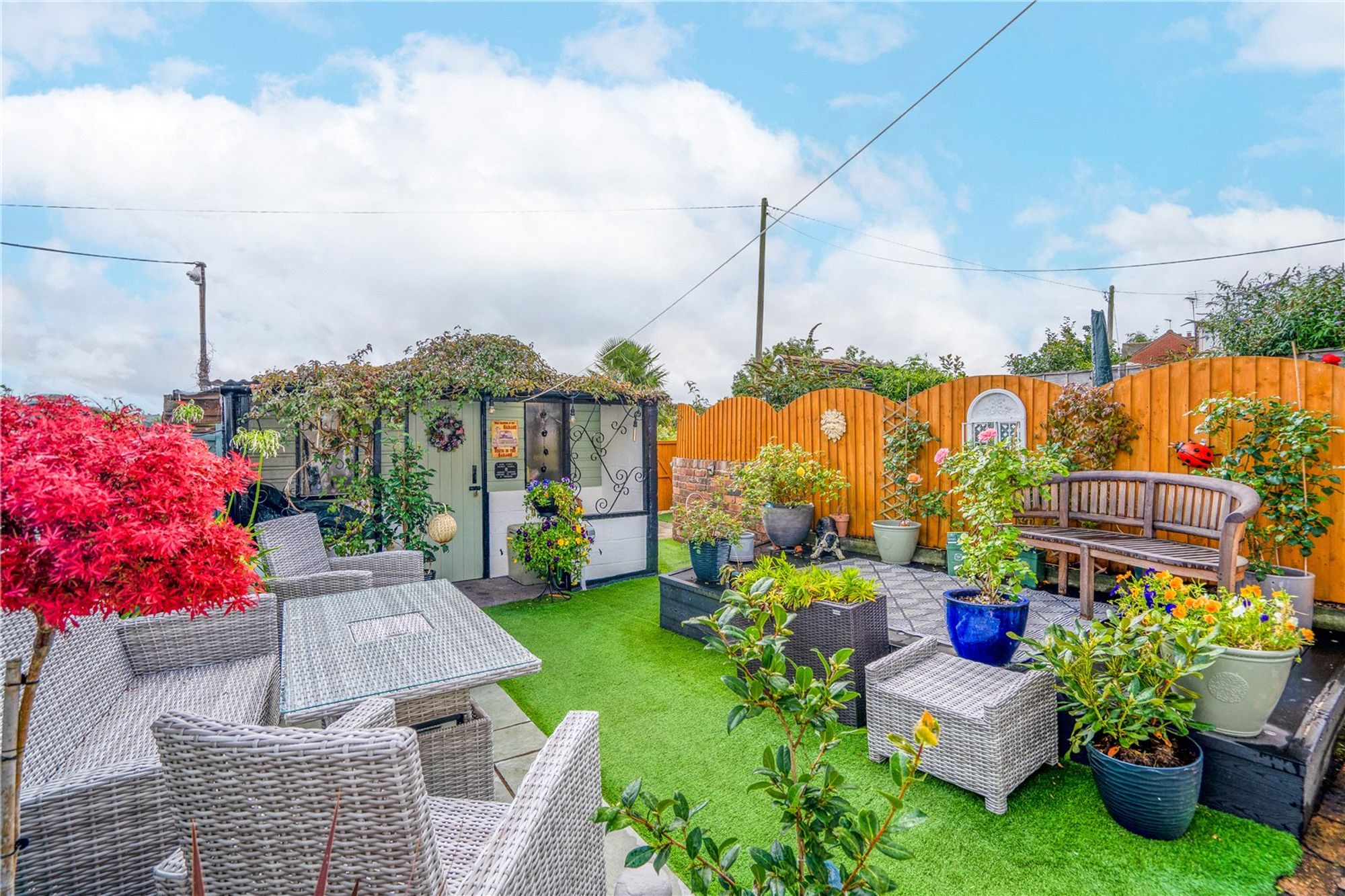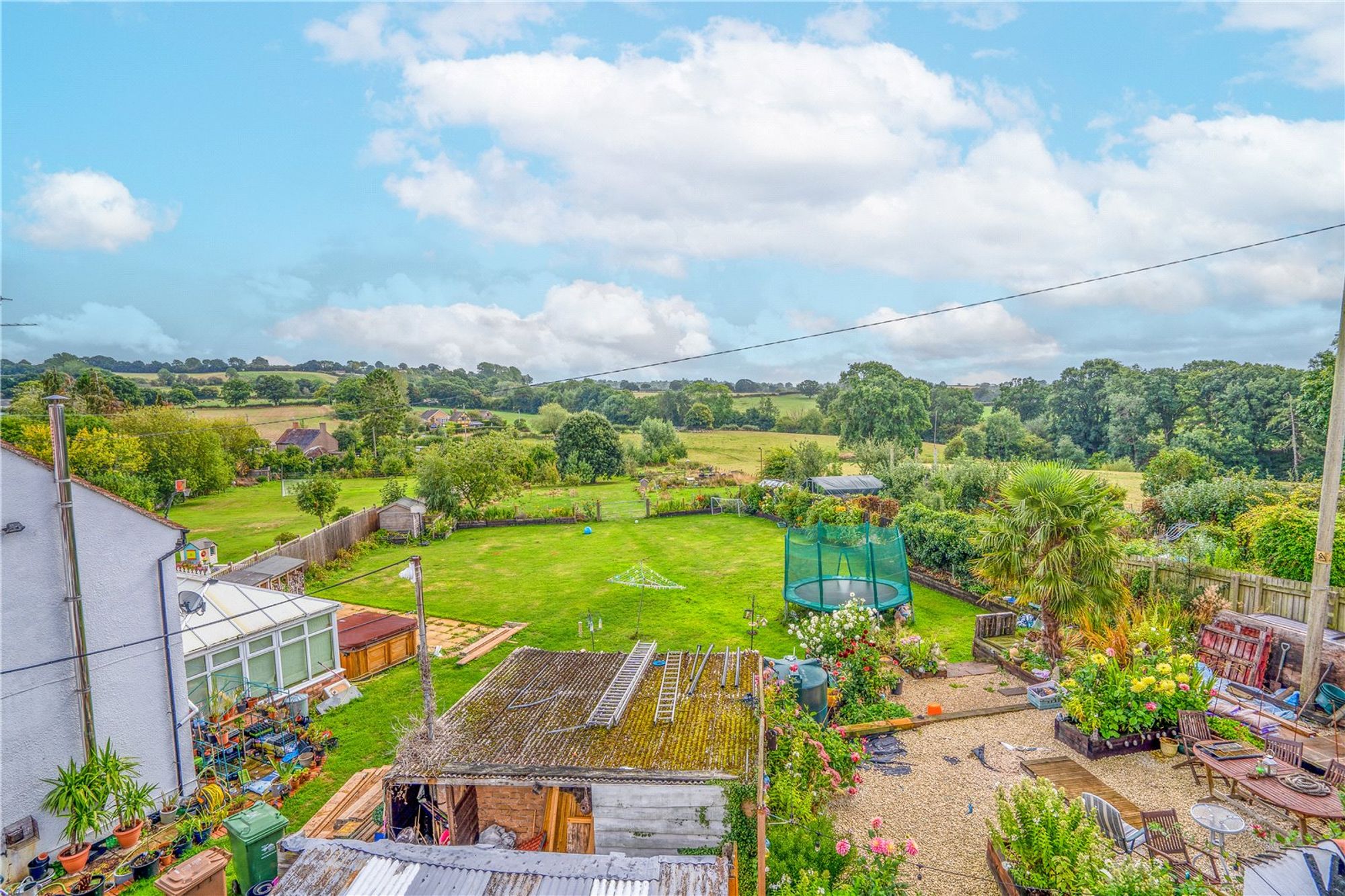 Beautifully maintained rear gardens with a patio area having gentle countryside views. There is a raised decking area, outside tap and part of the garden is laid with artificial lawn. There is a useful outbuilding having concrete flooring, light and power points. A path leads to a further patio area and another outbuilding of brick and tile construction.