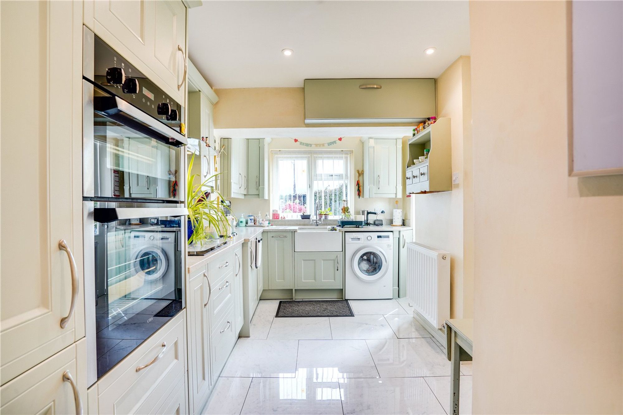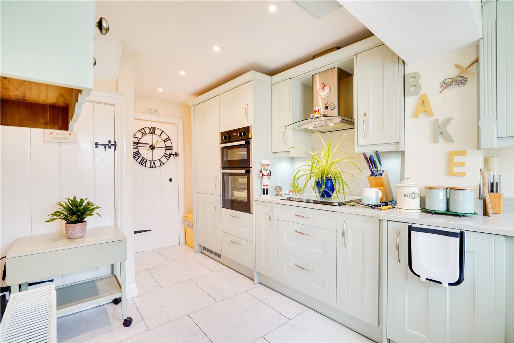 Kitchen (4.6m x 2.27m maximum) - Fitted range of matching wall and base units with granite work tops and a butler sink, built in appliances include a ceramic hob with a stainless-steel extractor over, built in double oven, space and plumbing for a washing machine, radiator, tiled flooring and lovely countryside views. There is a useful pantry cupboard under the stairs with shelving