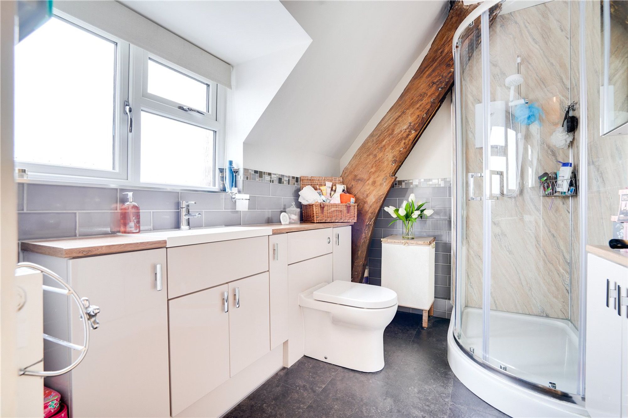 Shower Room - Modern white suite consists of wc with a concealed cistern, vanity basin and built-in cupboards with work top, shower enclosure with an electric Mira Sport shower and wall shower panels, there is a lovely feature exposed oak beam, touch mirror and overhead sensor spotlights