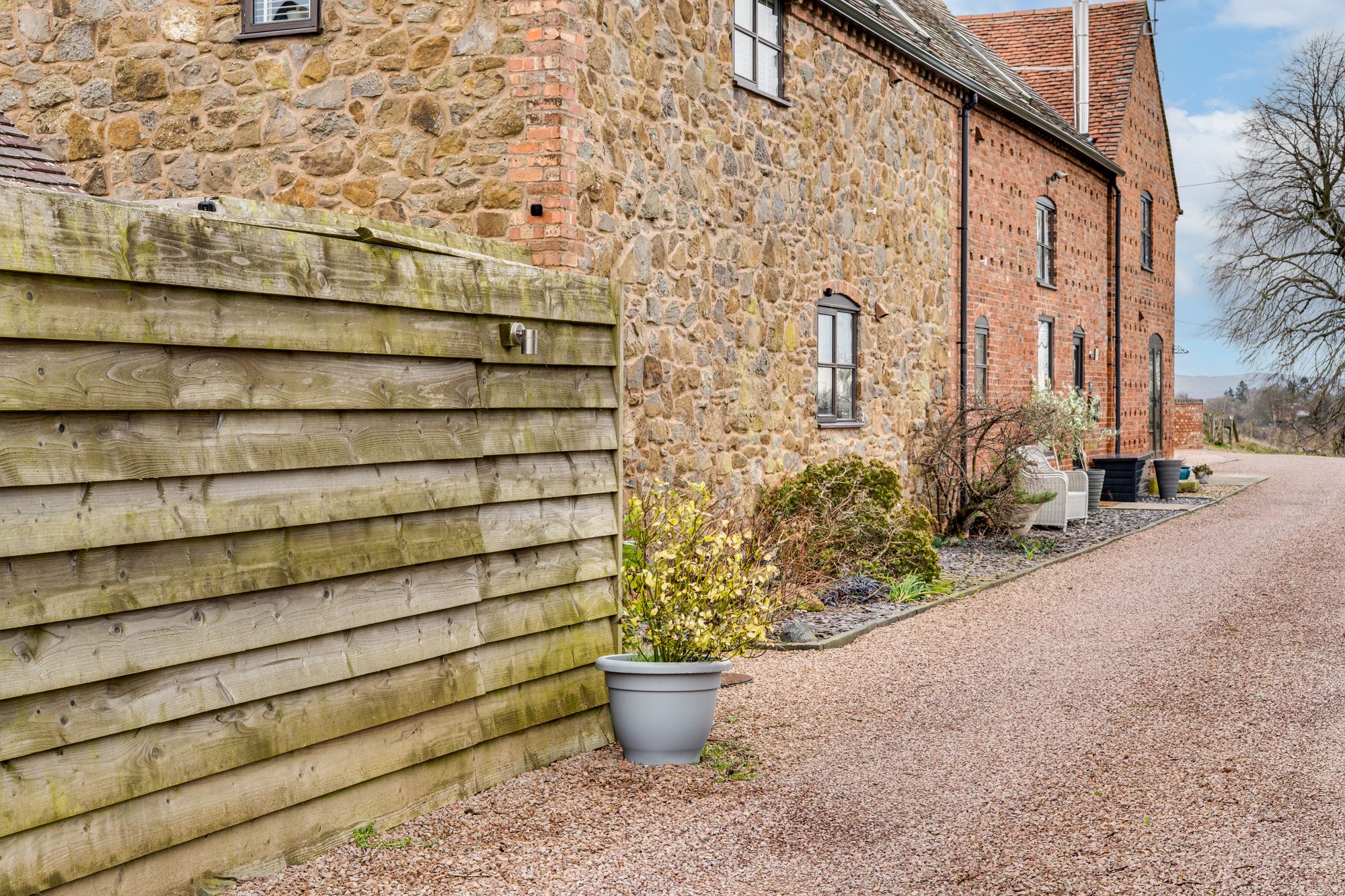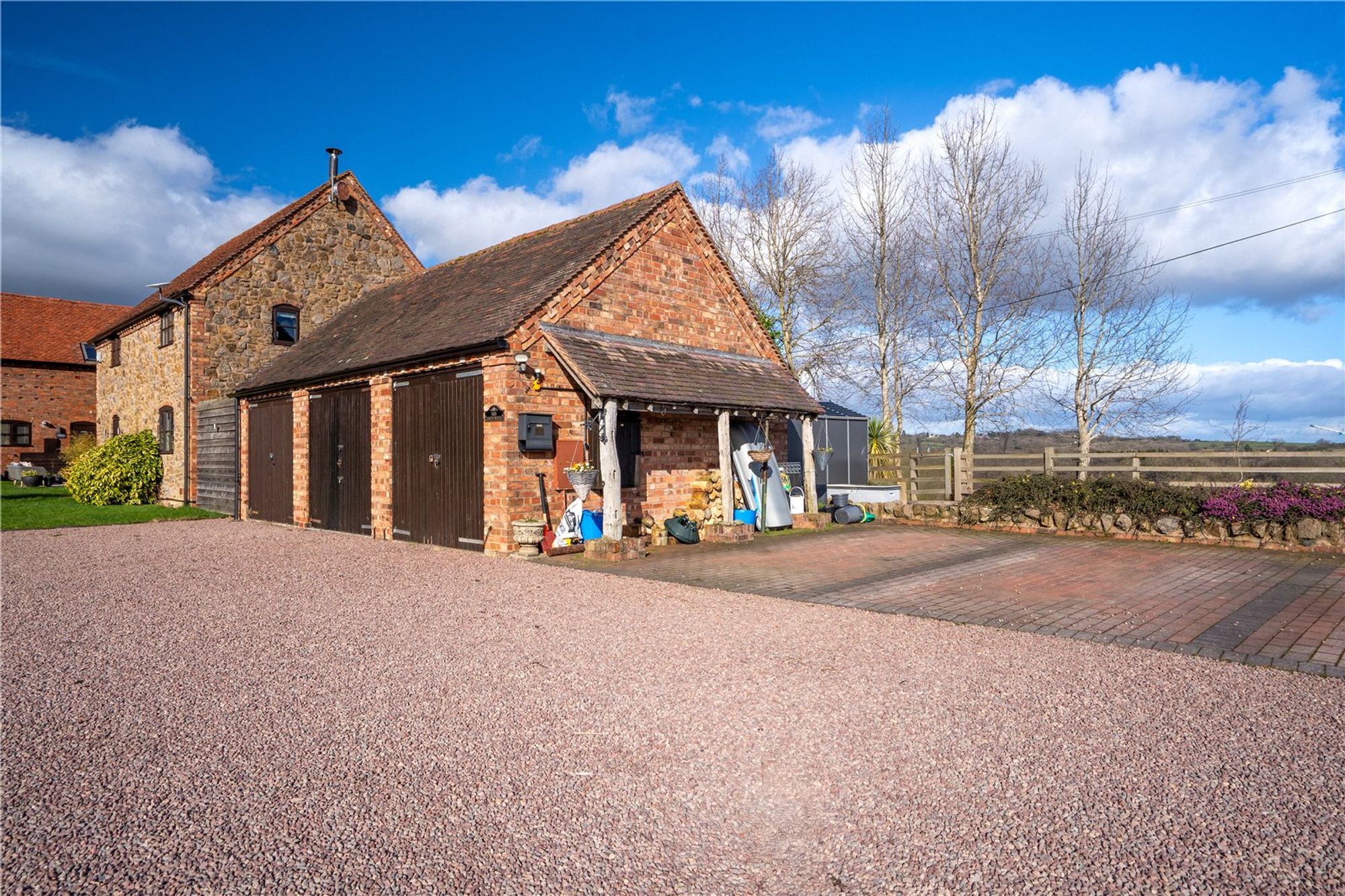 As you approach, the gravelled driveway and well-kept communal courtyard create a wonderful sense of arrival, with private parking for two vehicles and a detached garage (currently used as a gym).