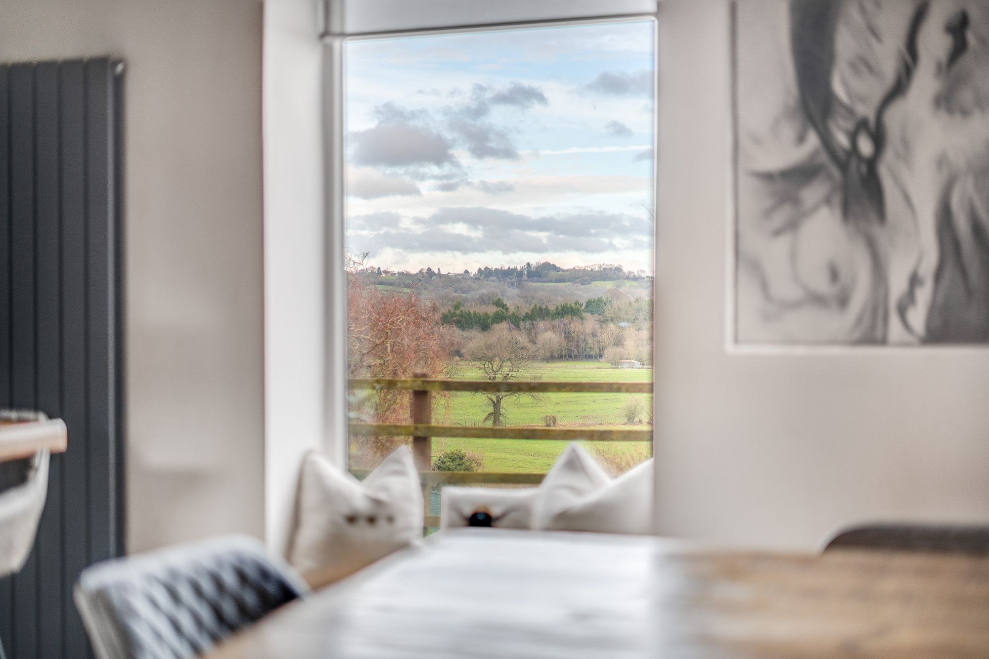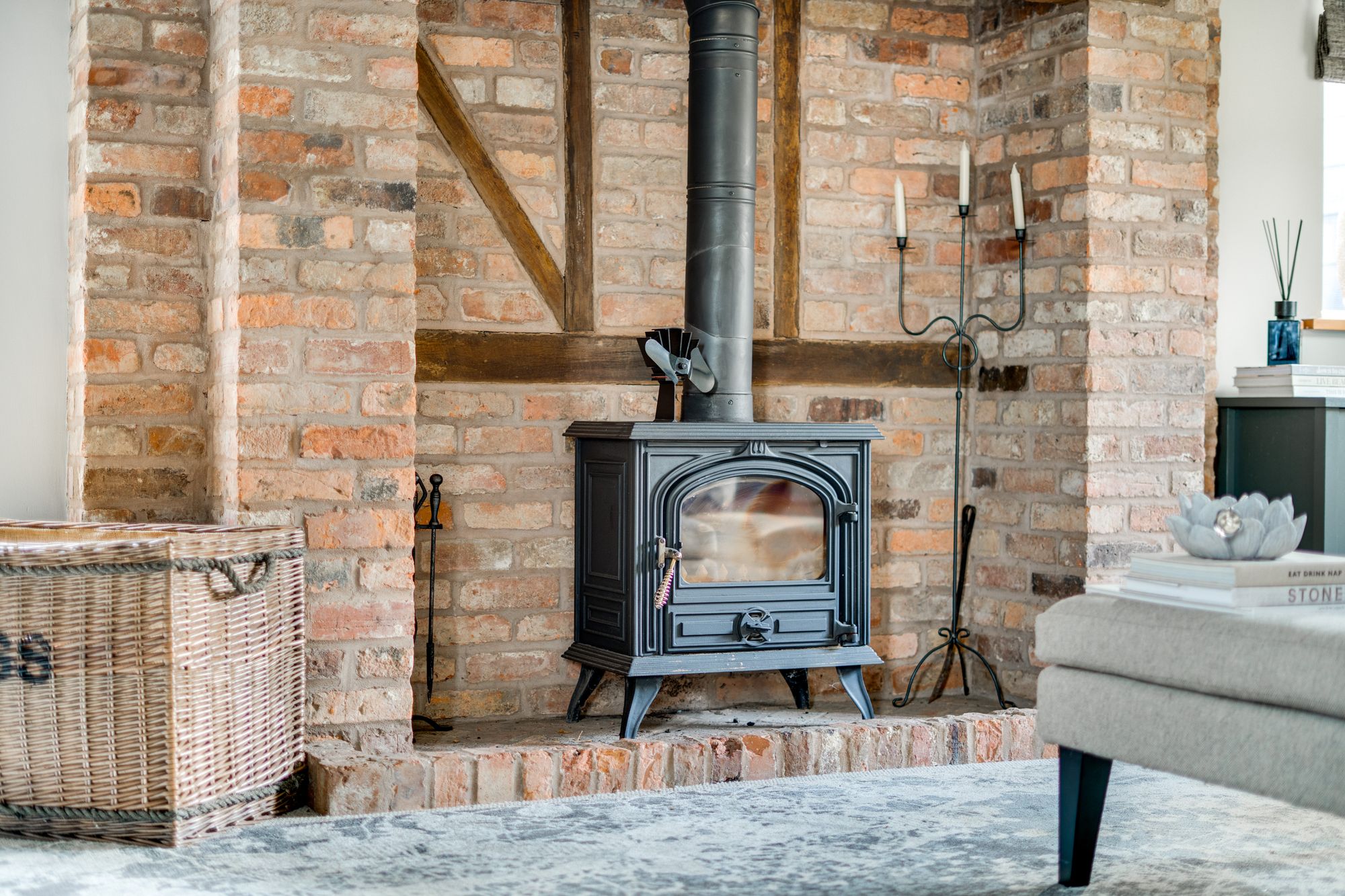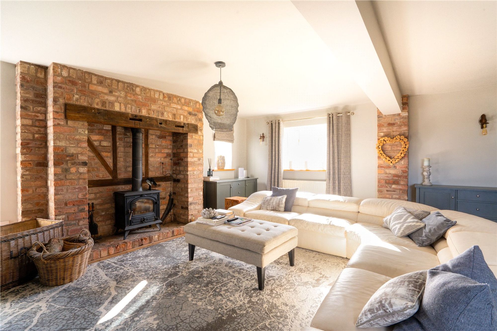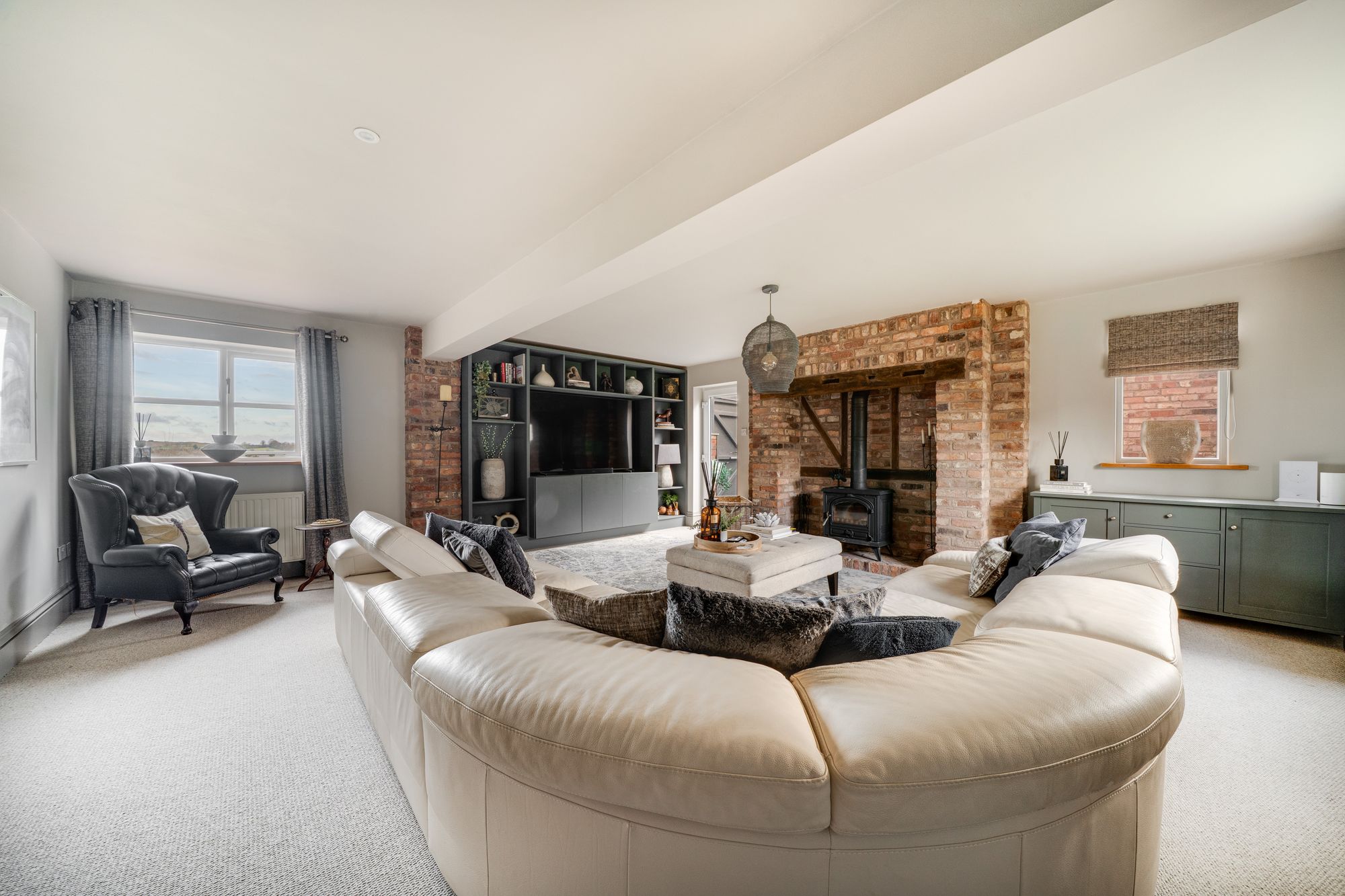 Moving through to the large sitting room, you’ll find a wonderfully inviting space, complete with a full-height brick fireplace housing a wood-burning stove—the perfect spot for cosy evenings. Natural light floods in through large windows, offering stunning countryside views, while a door leads directly to the enclosed courtyard garden, seamlessly blending indoor and outdoor living.