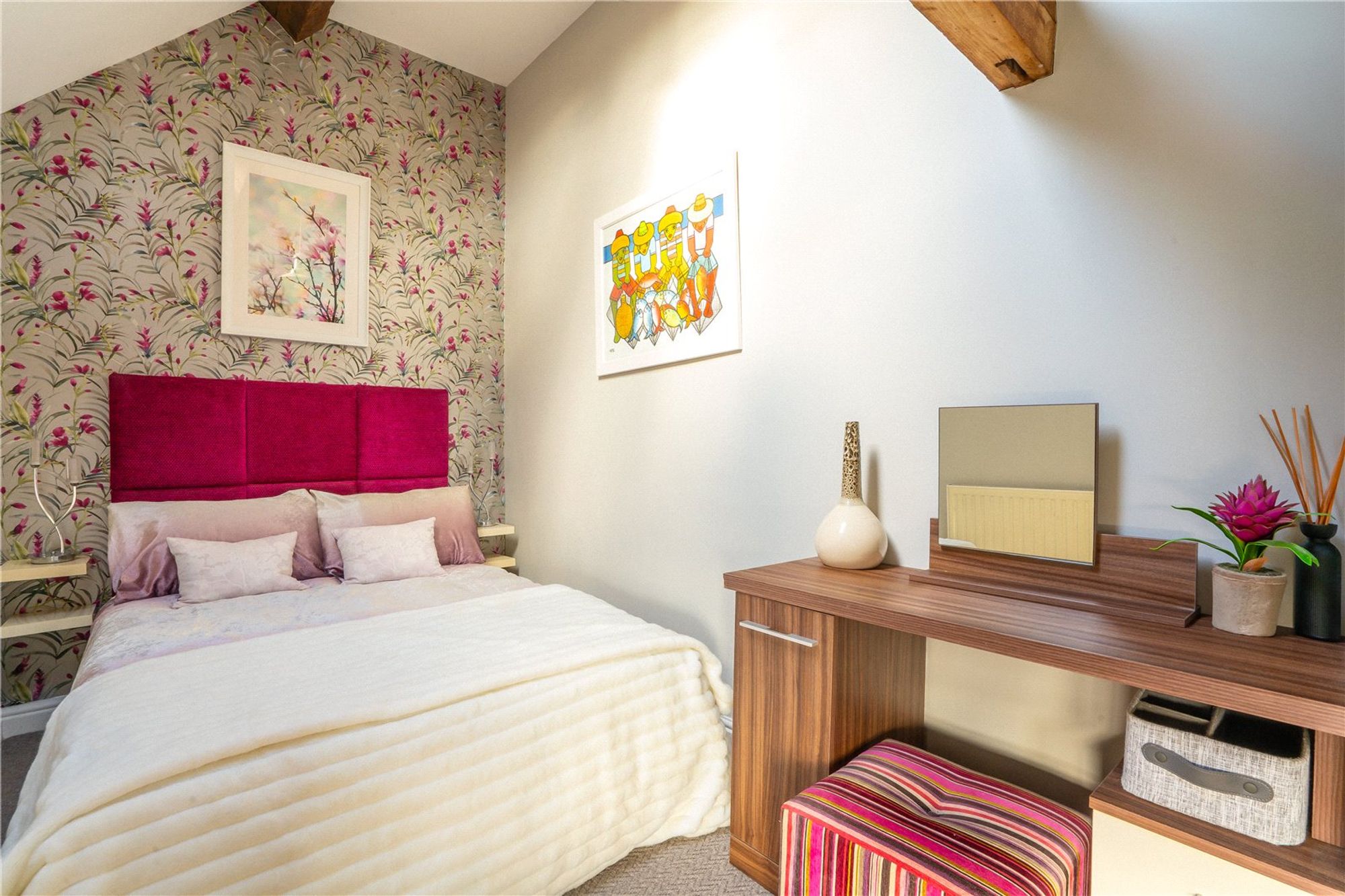 Three further generously sized double bedrooms all feature Hammond fitted wardrobes, and two showcase exposed timber beams that add to the home’s rustic charm. A stylish family bathroom completes the upper level, featuring a freestanding roll-top bath—perfect for soaking in after a long day.