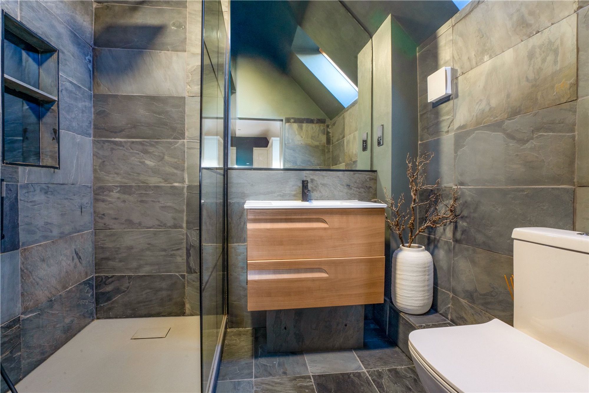 The master bedroom is a true sanctuary—incredibly spacious, with a range of fitted Hammond wardrobes, a central island unit, and dual-aspect windows offering spectacular views. The ensuite shower room is finished to an exceptional standard, featuring a large walk-in rainfall shower, slate tiling, and a floating vanity unit for a sleek, contemporary feel.