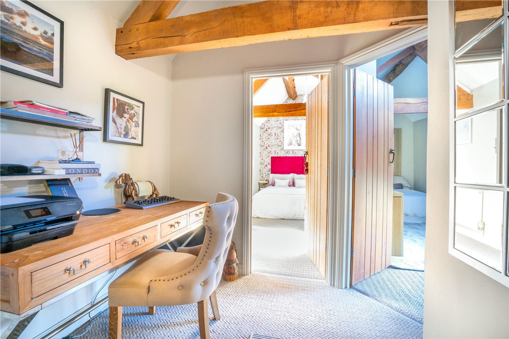 A characterful staircase leads to the first-floor landing, where a dedicated desk area creates the perfect work-from-home space.