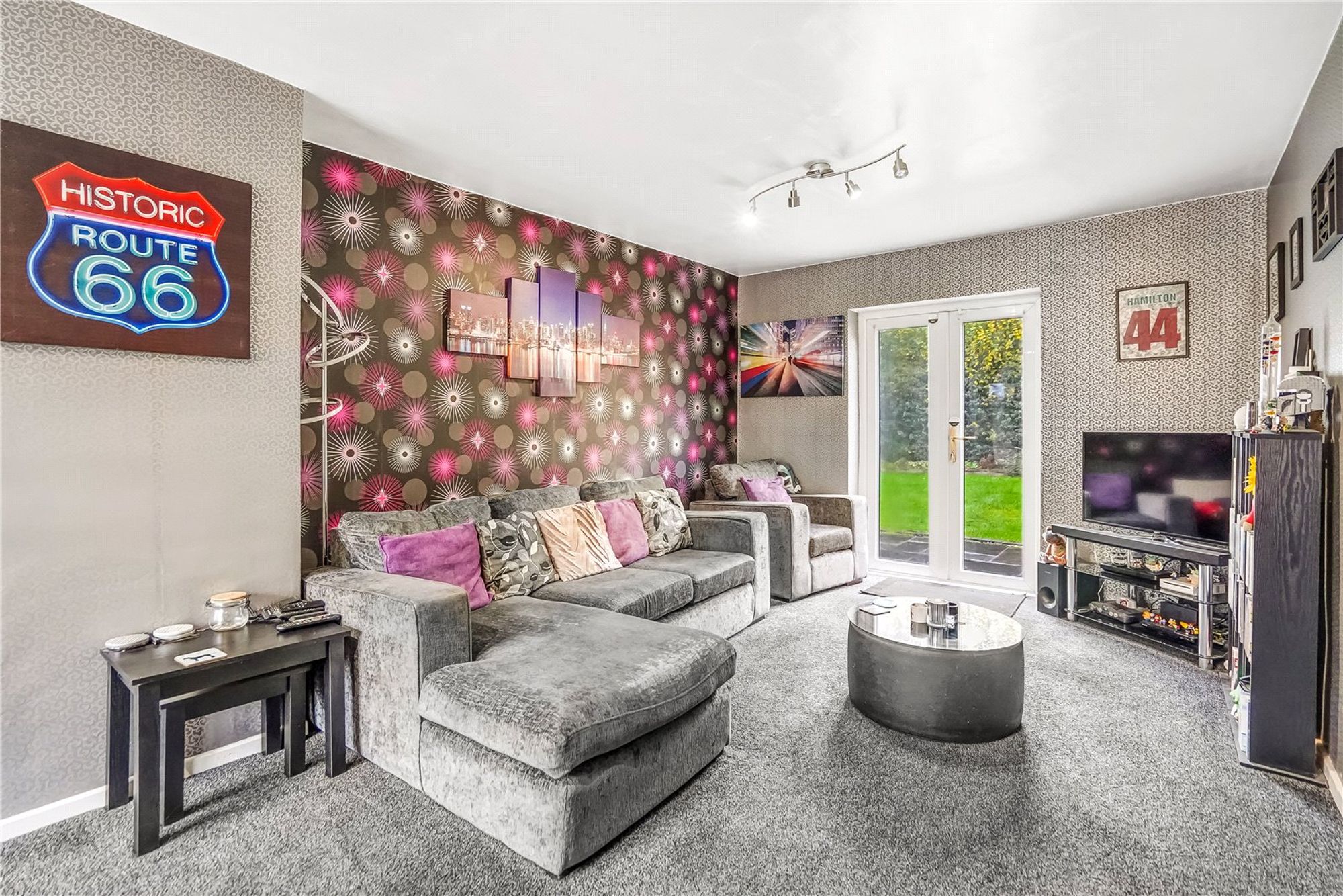 The large, dual-aspect lounge/dining room provides an inviting space for family living and entertaining. It features a front-facing uPVC double-glazed window, a central heating radiator, and uPVC French doors leading out to the rear garden.