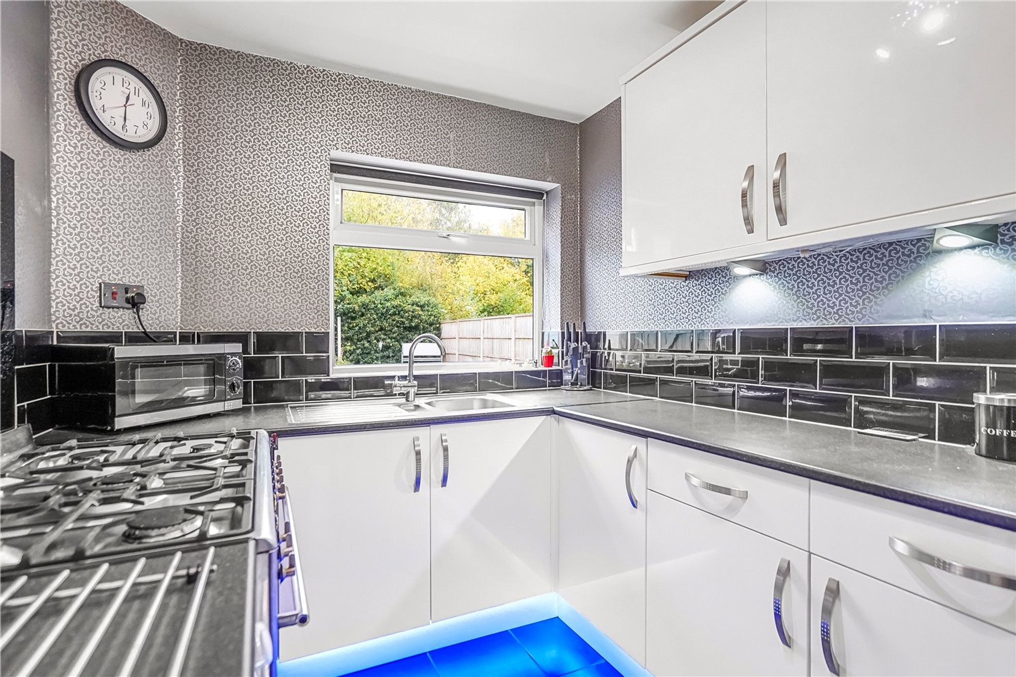 The kitchen is fitted with contemporary white high-gloss units, a stainless-steel sink with mixer tap, and recesses for a gas range cooker, washing machine, and fridge. The kitchen also boasts wall and base units, part-tiled walls, a tiled floor, and a door leading to a useful understairs pantry/storage area. A uPVC double-glazed door provides access to the side of the property.