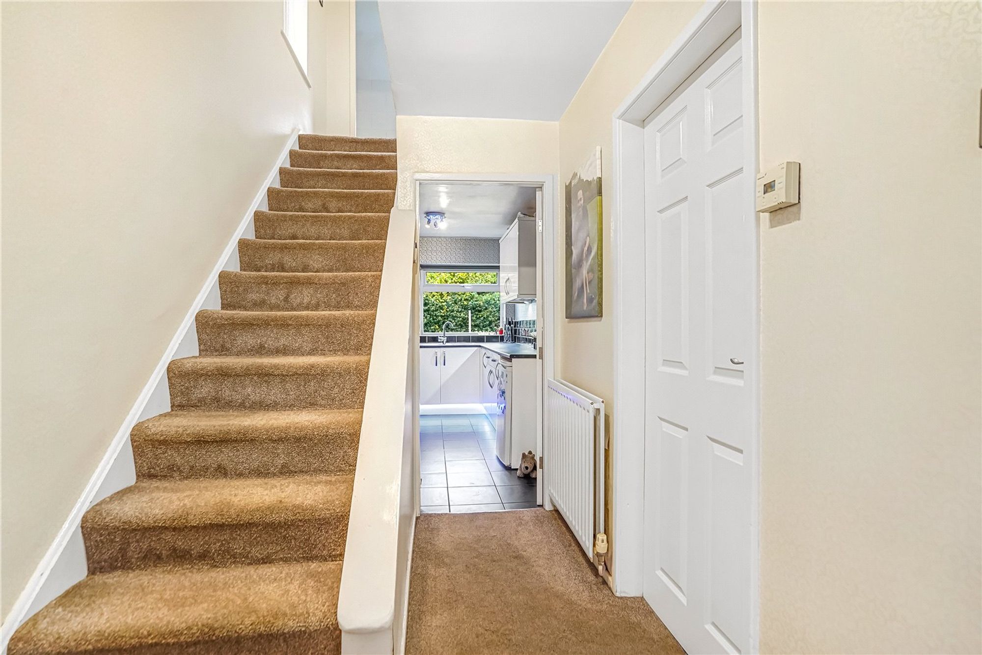 On the first floor, the landing is well-lit by a side-facing uPVC double-glazed window and offers built-in storage housing the Worcester Bosch combination central heating boiler. Doors lead to the three bedrooms and the shower room.