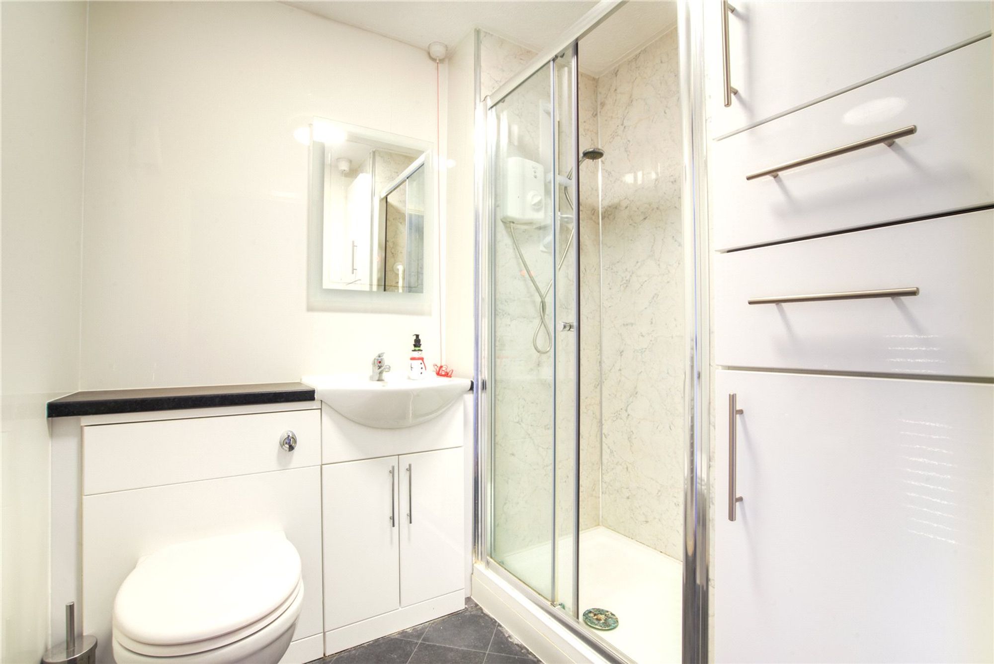 The contemporary bathroom comprises a modern white suite with a vanity unit incorporating storage and countertop space, a low-level WC, and a large walk-in shower with glass sliding door. Additional features include partially tiled walls, vinyl flooring, a chrome heated towel rail, ceiling light point, and a built-in storage cupboard.