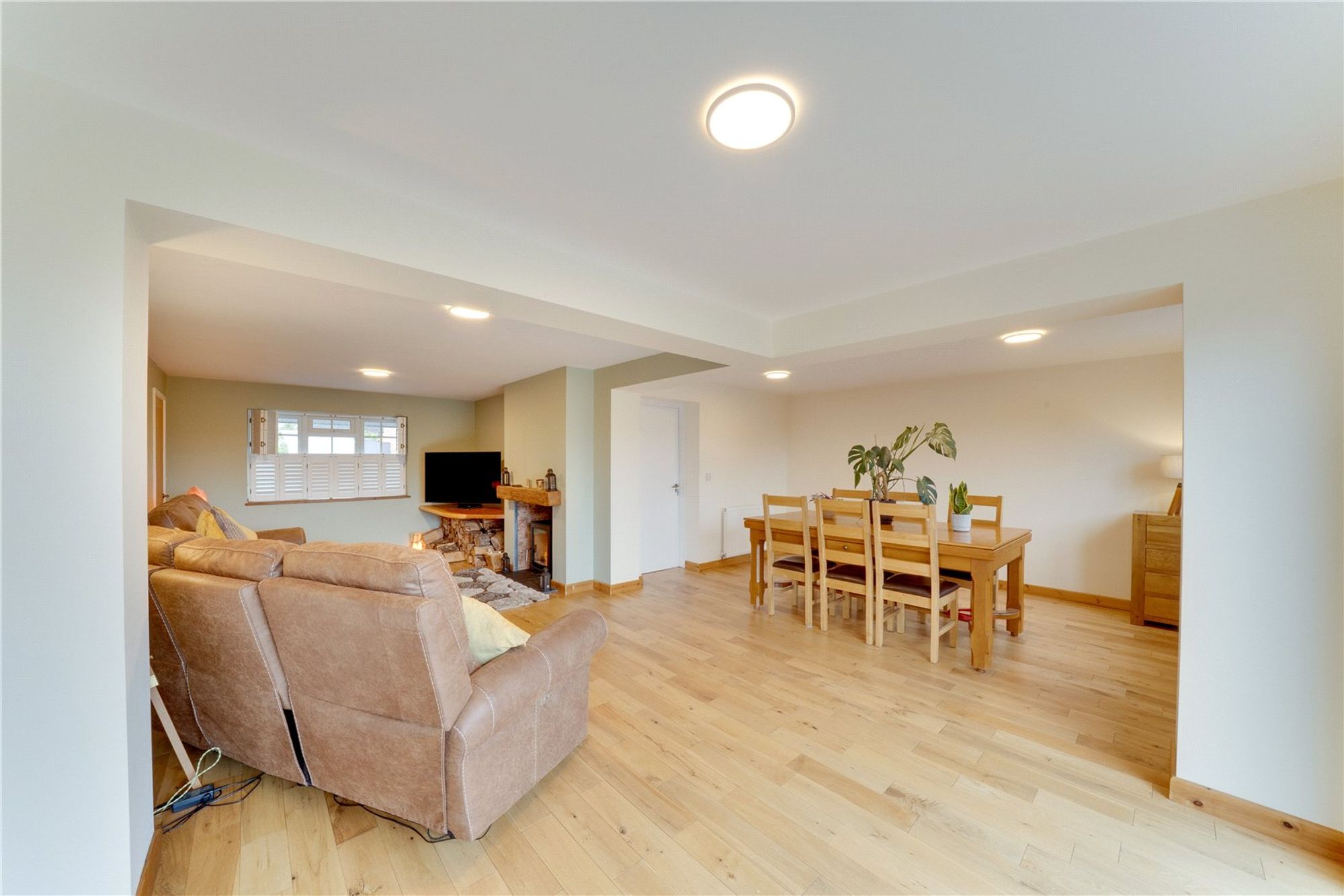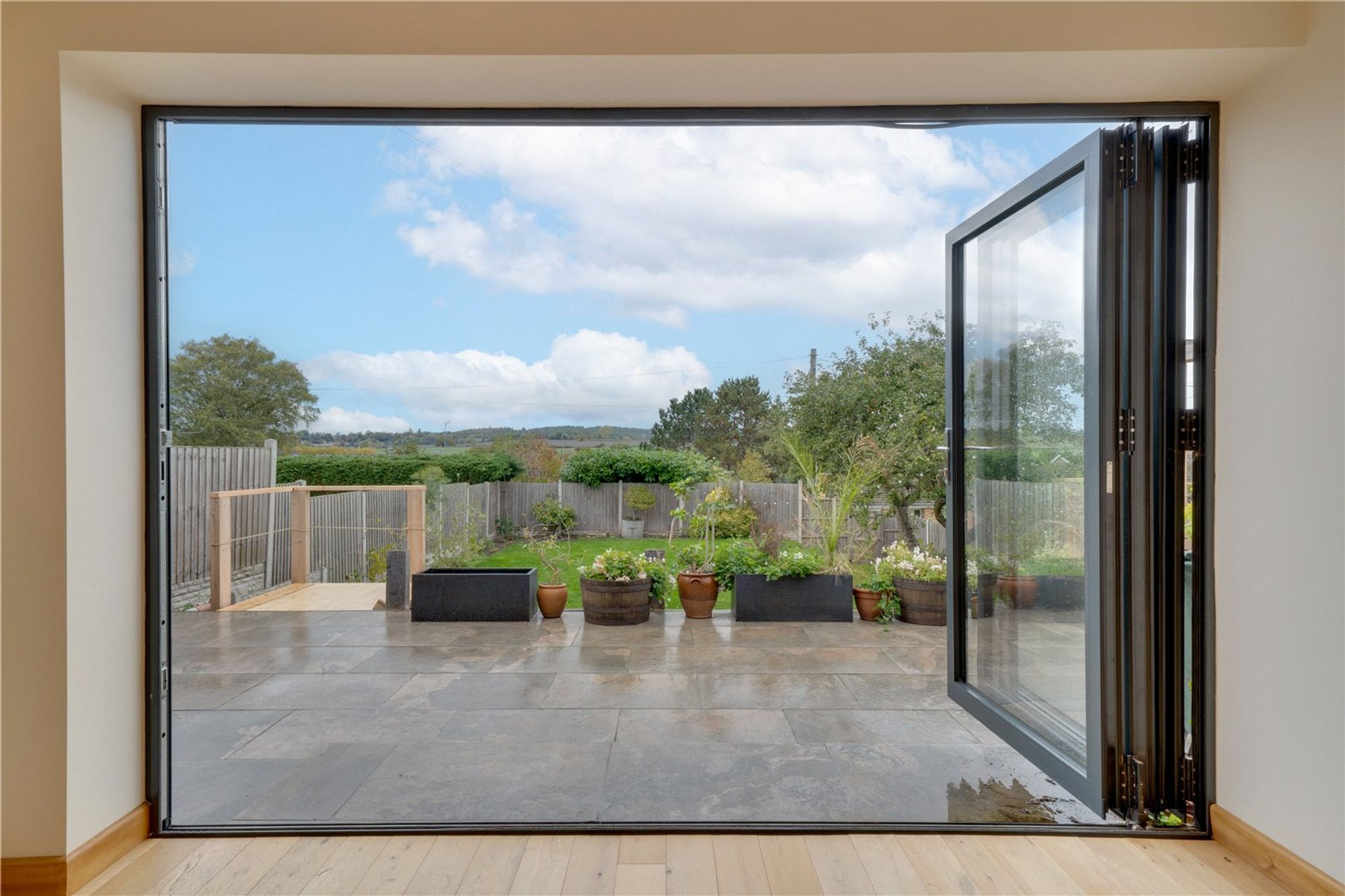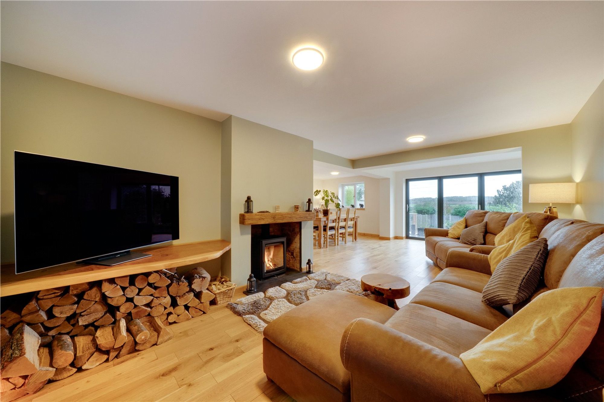 The superb open-plan lounge and dining area forms the heart of the home — a bright, free-flowing space with a wood-burning stove, oak flooring, and bi-folding doors opening onto the rear terrace. This wonderful dual-aspect room offers ample space for both relaxing and entertaining, with stunning views extending across the garden towards open countryside.