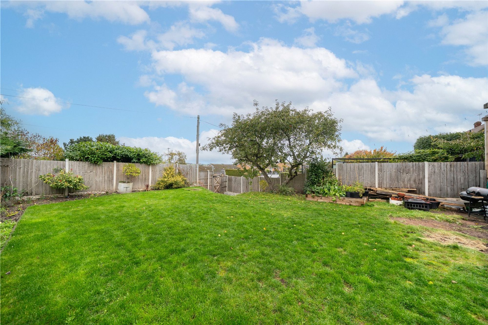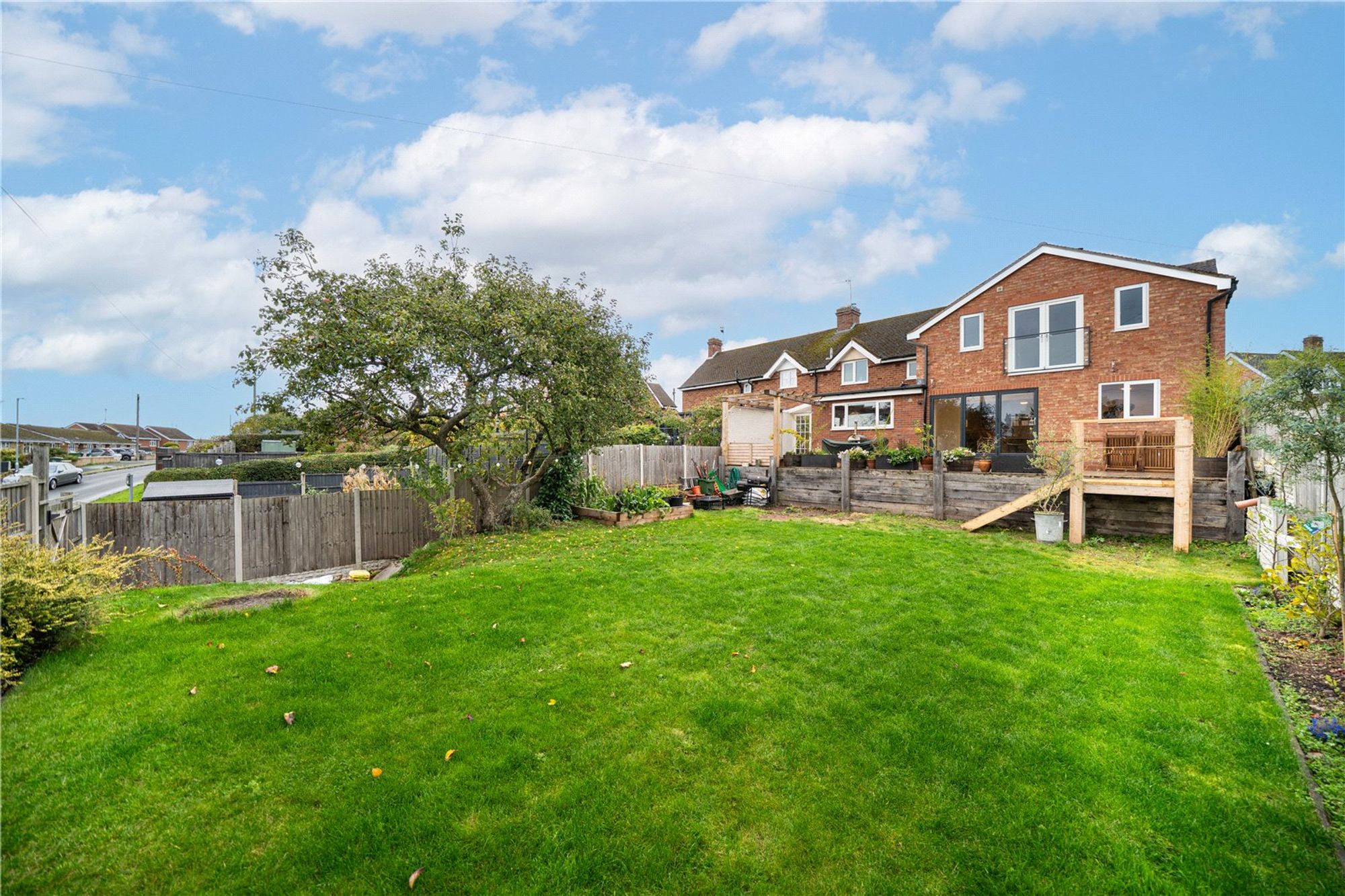 To the rear, bi-folding doors open onto a large paved porcelain terrace, ideal for outdoor dining and entertaining. Steps lead down to an expansive lawned garden, enclosed by mature hedging and enjoying wonderful views across open fields — a perfect setting for family life or peaceful relaxation. At the front, a large driveway provides ample parking for several vehicles and leads to the garage.
