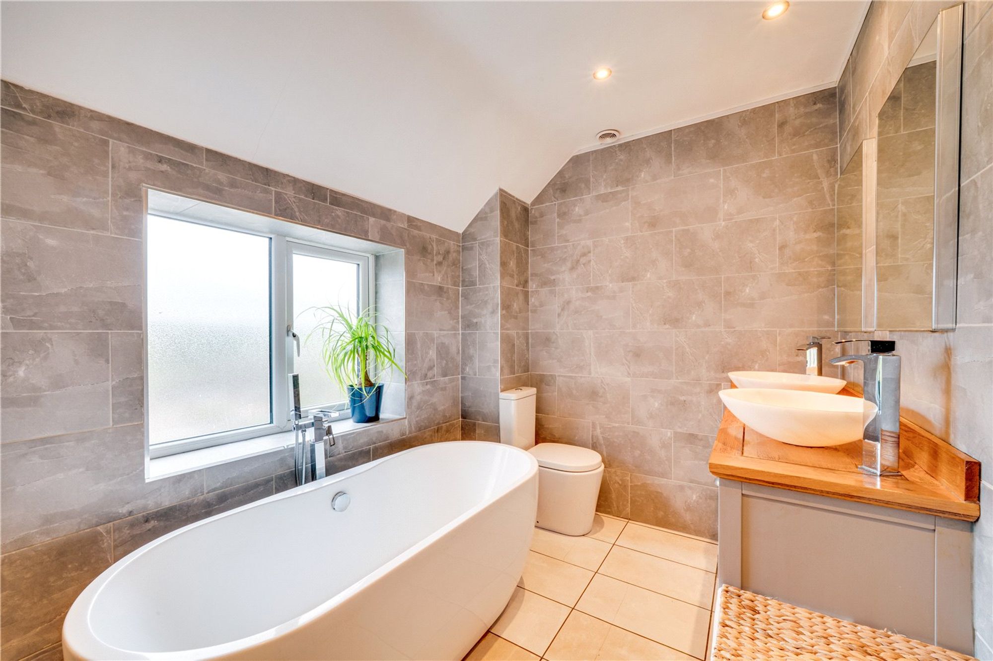 Upstairs, the home continues to impress with a thoughtful layout ideal for modern family living. There are four well-proportioned bedrooms and two beautifully appointed bathrooms. Bedroom One is a superb principal suite featuring a stylish en suite shower room, finished in natural stone-effect tiling with a contemporary glass-enclosed shower and stone basin. Bedrooms Two and Three are generous doubles, while Bedroom Four is an additional double, or ideal study space. The main family bathroom is luxuriously appointed, featuring a freestanding bath, double vanity basins, and sleek modern finishes.