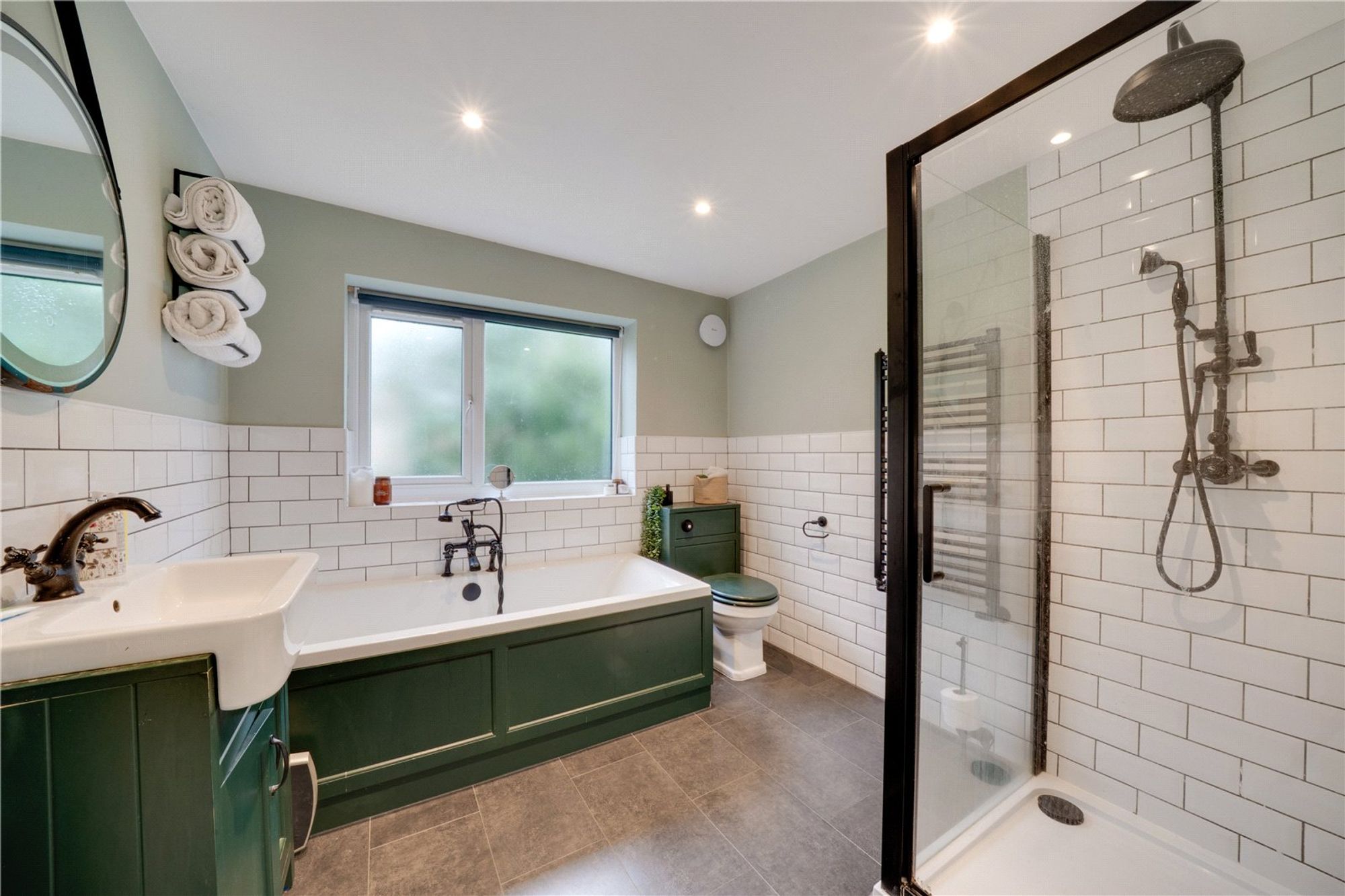 Upstairs, the landing is light and spacious, with built-in storage and access to all three bedrooms. The main bedroom enjoys a peaceful outlook towards the surrounding countryside. Two further bedrooms offer versatile accommodation suitable for children, guests, or home working. The family bathroom is attractively finished with a freestanding bath, separate walk-in shower, vanity unit, and modern fittings.
