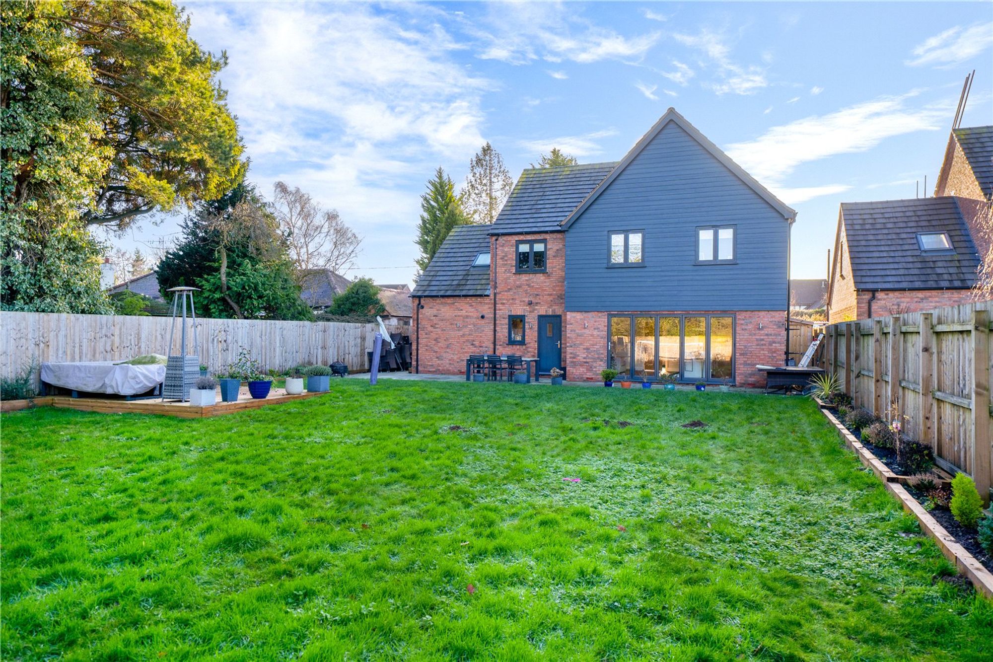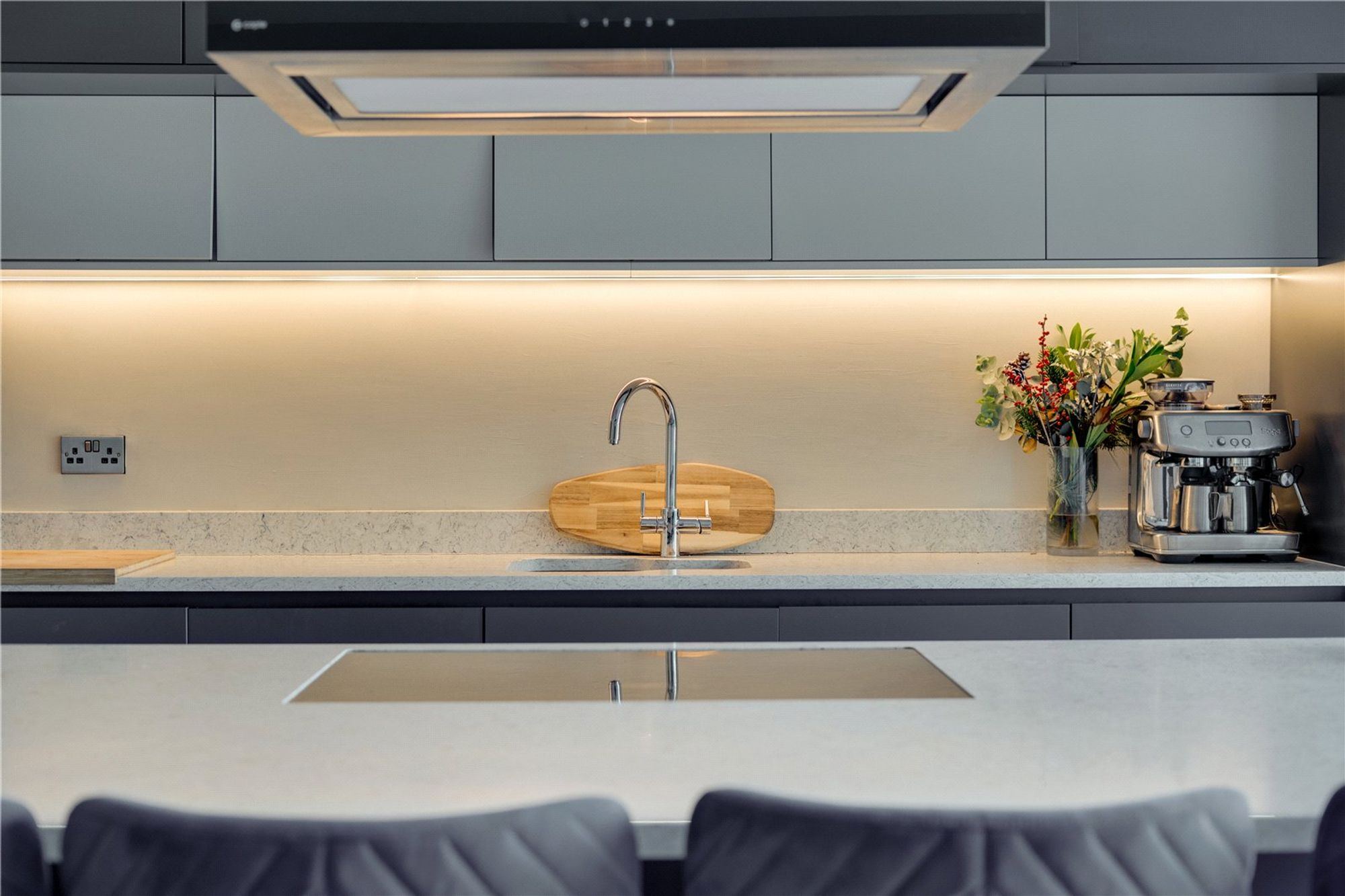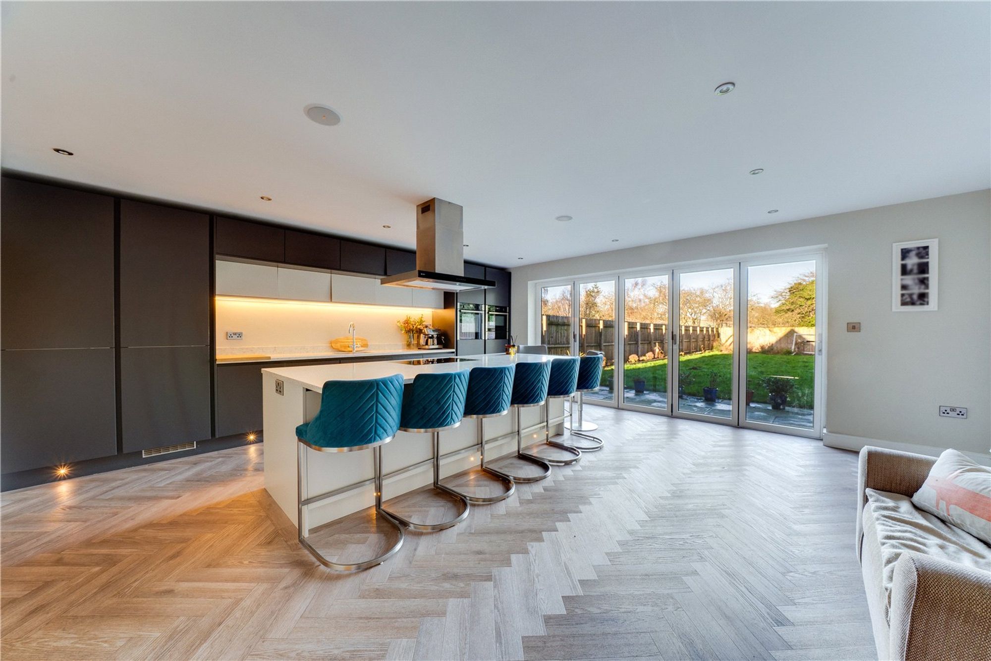 The centrepiece of the home is the outstanding open-plan kitchen and dining space, designed with both everyday living and entertaining firmly in mind. Fitted with a comprehensive range of wall and base units by Elgar Kitchens and complemented by Stone & Earth granite work surfaces, the kitchen is anchored by a substantial central island with feature lighting above. A full suite of integrated appliances includes a NEFF double oven with five-ring gas hob, dishwasher, fridge/freezer, boiling water tap, Caple wine chiller and pull-out larder. Bi-fold doors span the rear elevation, opening directly onto the garden and allowing natural light to flood the space. Underfloor heating runs throughout the ground floor, adding both comfort and efficiency.