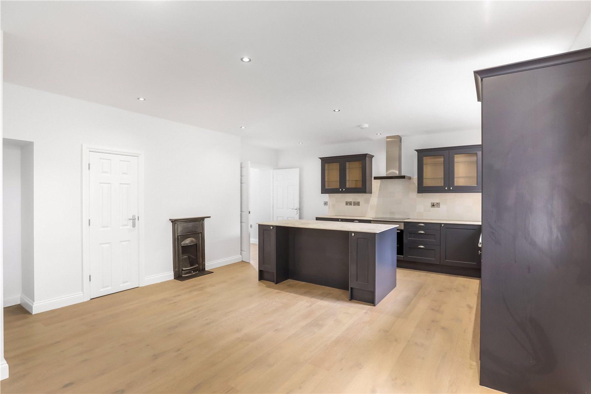A central island provides additional preparation space and informal seating, making this an ideal setting for casual dining or entertaining, while the room remains large enough to comfortably accommodate a full dining table for more formal occasions.