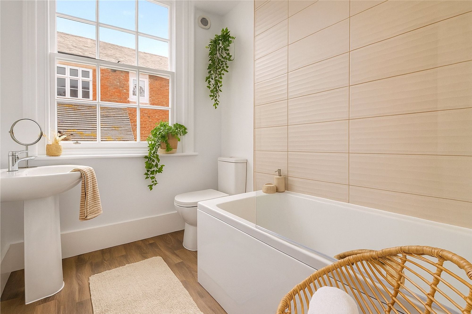 The second bedroom is also a well-proportioned double benefitting from two large restored original sash windows, enhancing the sense of light and space. A well-appointed family bathroom is positioned nearby and comprises a bath with shower over, wash hand basin, WC and heated towel rail, finished in a clean and contemporary style.